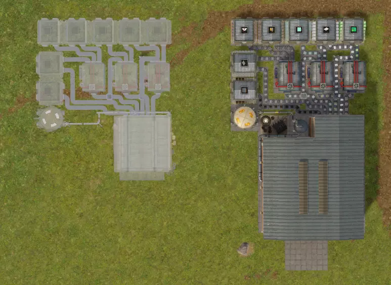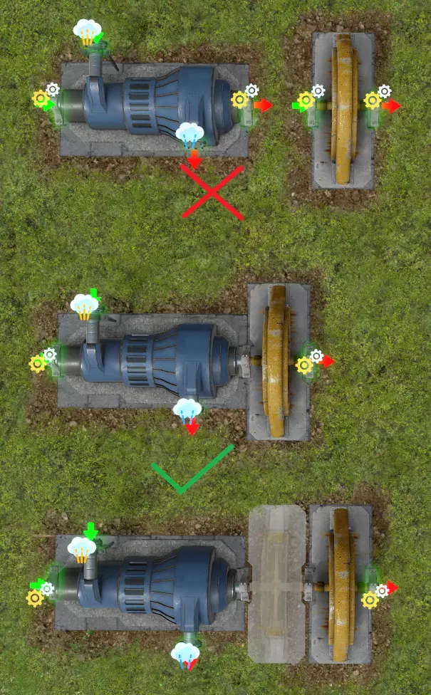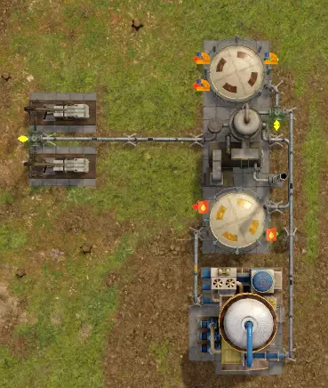 涡轮发电 第二阶段的首要工作是改善发电性能,将柴油发电改为燃煤发电。 锅炉可燃烧煤将水加热为高压蒸汽,高压蒸汽无法通过卡车运输,必须通过管道传输给高压涡轮。 管道中的蒸汽可以永久存储,不会凝结成水。 涡轮通过持续消耗蒸汽产生旋转的机械能,并通过其左右两侧的机械连杆将机械能传输到发电机的机械连杆上,从而带动发电机发电。 注意,机械连杆并非像管道那样可建造的实体,仅存在于发电建筑的两端。因此,发电设备必须在一条直线上首尾相连,才能共享机械能。