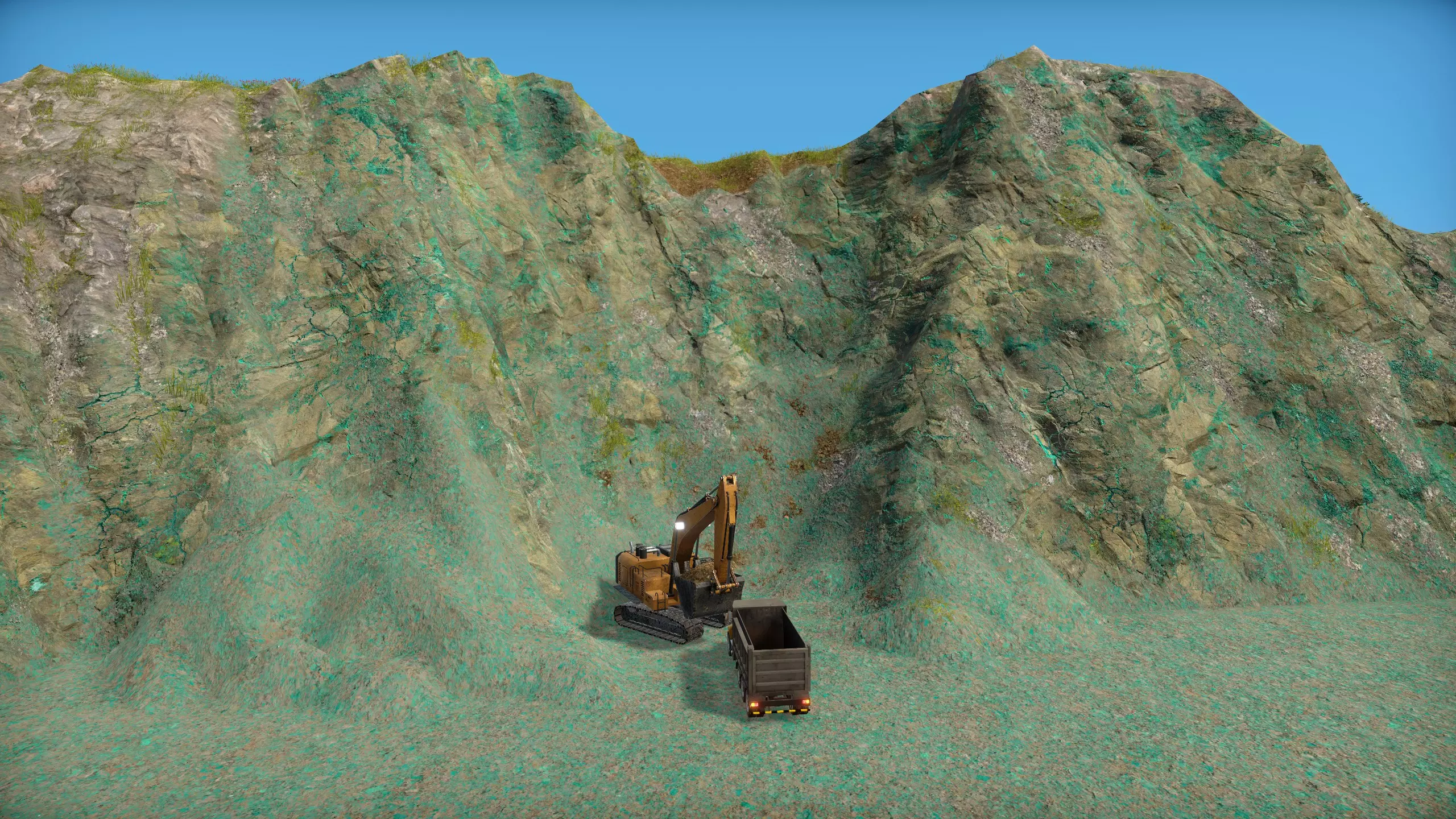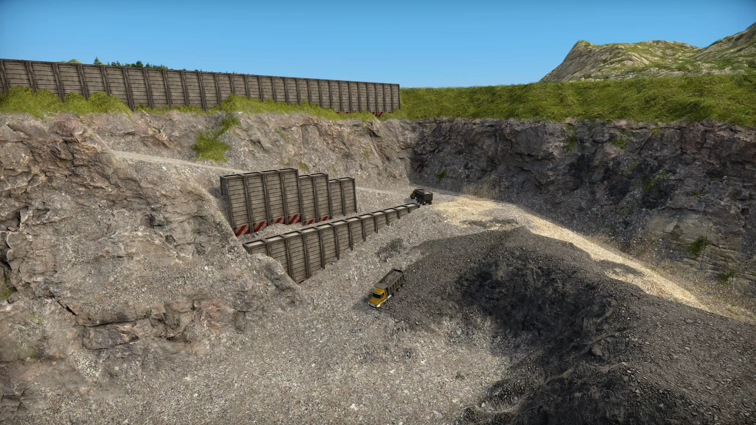 高级物流控制 当矿山中的卡车装满后,会自动寻找最近的存储点卸货;若找不到存储点,则会尝试倾倒;若所有路径寻找均失败,会回到矿山控制塔前待命。因此,我们需要保证矿山控制塔离挖掘地点尽可能近,随着挖掘的深入不断移动矿山控制塔,并且在矿山控制塔旁修建存储设施来储存挖掘产物。通常我们会设置一个土仓库、岩石仓库和矿石仓库。 此时需要注意,卡车不会主动从仓库中取出物品去倾倒。一旦将仓库设置为清空状态,卡车就不会把物品存放在仓库,而是会行驶一大段距离去倾倒产物,导致挖掘机举着铲子干等。这种情况下,我们需要等仓库装满后手动将其设置为清空,在仓库清空后再恢复为可接受物品的状态。但是有没有办法能保证卡车将物品运输到该仓库,再由全局的空闲卡车负责倾倒物品呢? 这时候我们需要解锁【高级物流控制】。当解锁高级物流控制后,所有的矿山控制塔和存储设施都会出现一个输入路线和输出路线选项。 仓库在设置为【清空】时,卡车会尽快将其中的物品取出,设置了清空的仓库无法设置输入路线。反之亦然,仓库在设置为【保持满仓】时,卡车会尝试向其中运输物品,此时仓库无法设置输出路线。 当一个仓库被设置输入或输出路线后,它只会允许该路线的运输,拒绝其他任何运输要求。而未设置路线的仓库,则会尝试任何允许的输出和输入。仓库的输入和输出设置仅由卡车遵循,传送带会无视满仓和清空命令运输物品。 矿山控制塔设置输出路线后,将矿山内所有挖掘得到的产品送往输出路线上的仓库,输出仓库满时,卡车会回到控制塔待命。当挖掘得到了与输出路线的仓库不匹配的物品时,例如输出路线只有煤矿石仓库,但是挖掘得到了铁矿石,此时卡车才会试图寻找地图内的其他仓库。 矿山控制塔设置输入路线后,全局卡车(而非被分配的卡车)会试图从源仓库运输物品并向控制塔范围中的倾倒区域倾倒,这里的前提是区域内存在倾倒区,且允许该物品倾倒。需要注意的是,一旦矿山控制塔设置了输入路线,它在任何情况下都只允许输入路线中的仓库进行倾倒,而拒绝其他仓库的倾倒。 不被任何控制塔控制的倾倒区为全局倾倒区。卡车不会主动从没有设置清空命令的仓库中取得物品并运往全局倾倒区。垃圾站被视为一种设置了保持清空的仓库,因此卡车会主动从垃圾站运输垃圾至全局倾倒区。 因此,该游戏中前期最容易出现的问题是:玩家对一个中间仓库同时设置了输入和输出路线后,又设置了清空仓库,此时会提示分配的路径无效。为解决这一问题,需要建造两个仓库,仓库之间可直接相连或通过传送带相连。举个例子,为了实现矿山中的卡车只在控制塔设定的输出点和挖掘机之间往返,而由全局卡车负责第二阶段的运输工作,我们需要为每种物品建造两个仓库,如图: