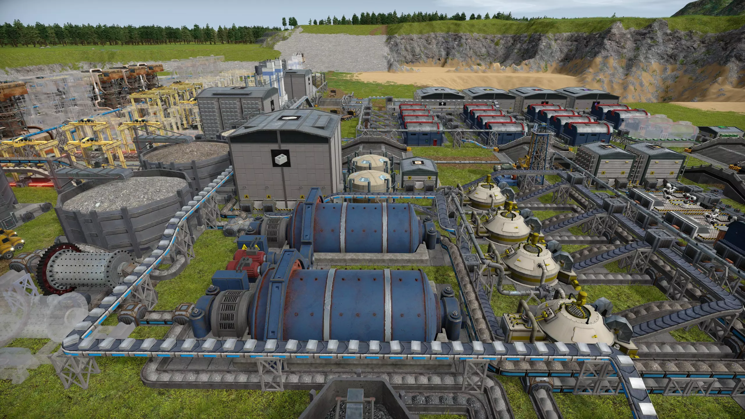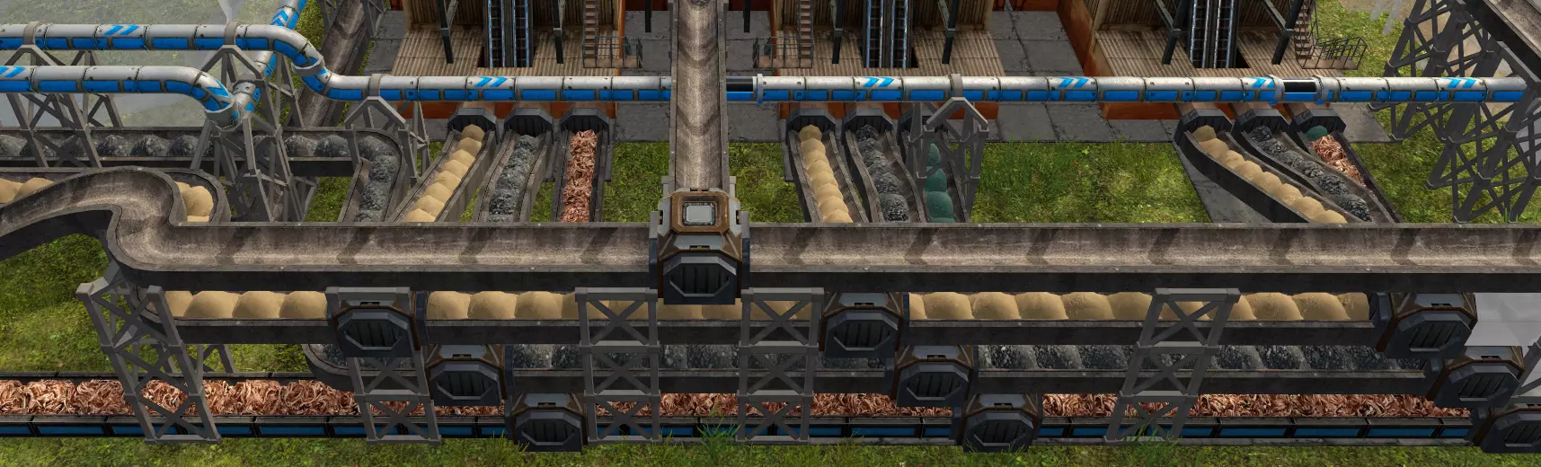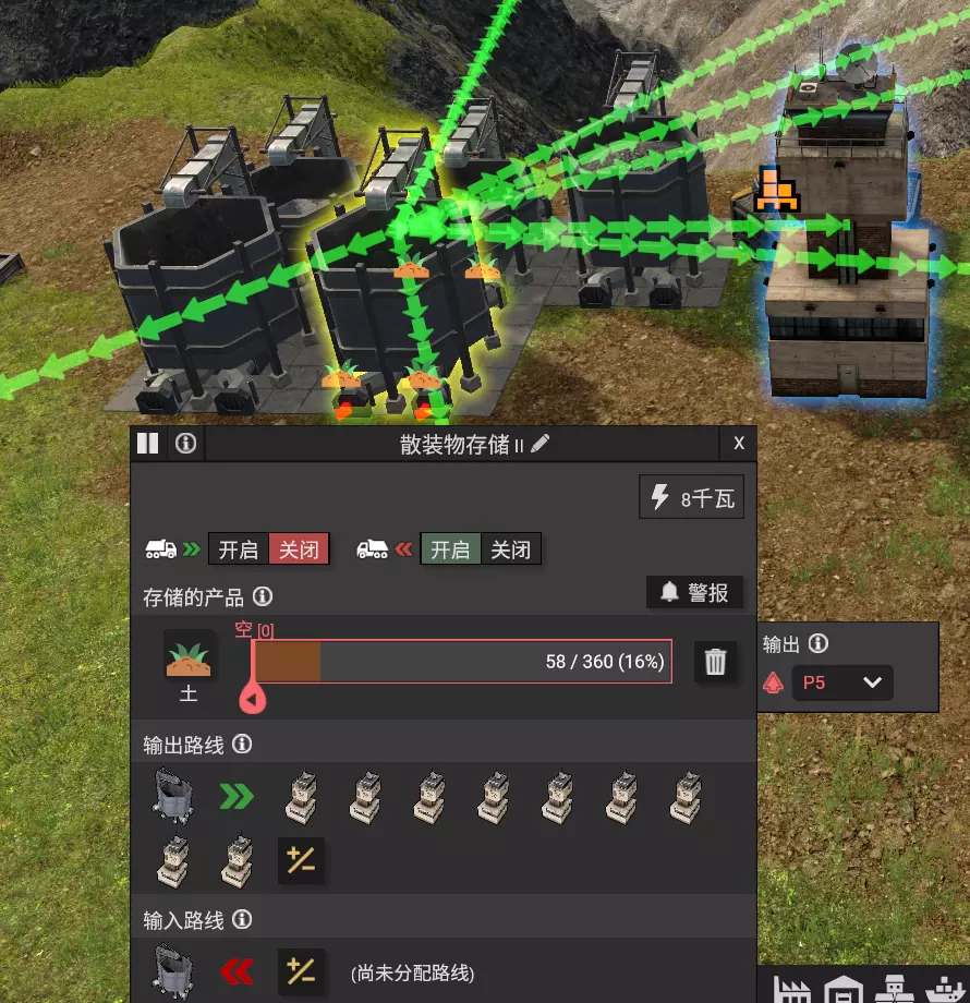 输出仓库和输入仓库连接在一起,矿山控制塔输出到输入仓库中,而输出仓库则输出到其他控制塔或仓库,并设置情况选项。可以看到这里的输出仓库设置了很多输出方向。注意,用于清空土石的仓库,一定要设置输出方向,以保障卡车只向输出方向运输,否则容易出现卡车在不同仓库间循环运输的情况。 这里该仓库向自身控制塔输出,表示该控制塔范围内的挖掘产物也可以倾倒在该控制塔范围内,可用于同一范围内的“挖东墙补西墙”操作。 该控制塔挖掘的矿石是煤,可以看到煤只设置了一个输入仓库,这是因为可以通过将需要煤的仓库设置为保持满状态,这样卡车会自动从煤仓库索取物品。综上,通过设置高级物流路线,我们可以通过一个或多个中转仓库,让控制塔控制的卡车只在挖掘机和中间仓库之间来回运转,或者实现各种复杂的物流运输。 13. 铁矿、铜矿、混凝土生产 当游戏初期的铁矿料和铜板快消耗光时,我们需要开采铁矿和铜矿并进行冶炼。 游戏前期我们使用砖块生产结构件,砖厂污染大、消耗高,因此之后需要过渡到使用混凝土制造结构件。混凝土的制造略微复杂,是新手玩家首次构建多级生产线和生产环节的产品。 后期示例的混凝土厂如图。