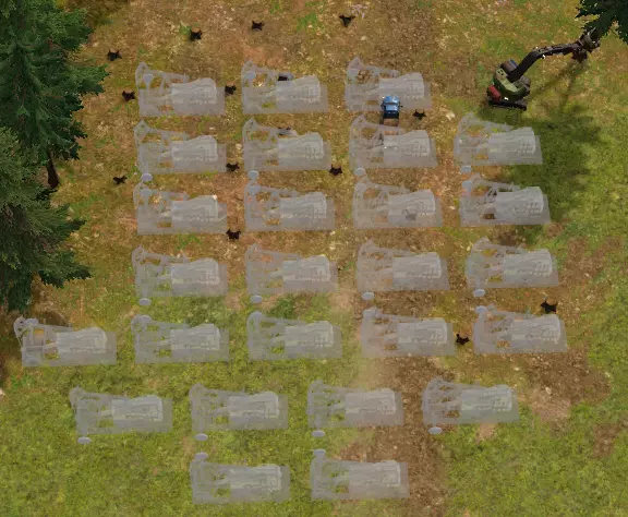 游戏开始时,地图上会有一个损坏的码头,用于存放初始物资,还有两个一级居住点和一个废弃通讯站,废弃通讯站可提供初始的冶铁资源与砖块。 游戏开始时,玩家会拥有一部分初始车辆。车辆是游戏中的重要元素之一,其中卡车用于运输各类物资,包括建筑建造材料,还能倾倒土壤、矿石等物品;挖掘机用于开采地形;伐木机用于开采树木。 需要注意的是,游戏中没有工人的建模。工人居住在居住点内,并在各种设施中工作。游戏不存在上下班时间和通勤因素,因此可以理解为工人每天会从居住点瞬移到工作地点工作,下班后再瞬移回居住点休息。 游戏开始后,新手教程会提示玩家划定砍伐区,并使用初始伐木机砍伐树木。注意,这个游戏前期最不缺的就是树木资源,甚至可以说大量森林占据了工厂的建设用地。 接下来需要建造一个木炭炉提供煤炭,一个高炉冶炼铁废料生产铁板。基础研究站用于解锁科技。垃圾收集站用于倾倒垃圾。
