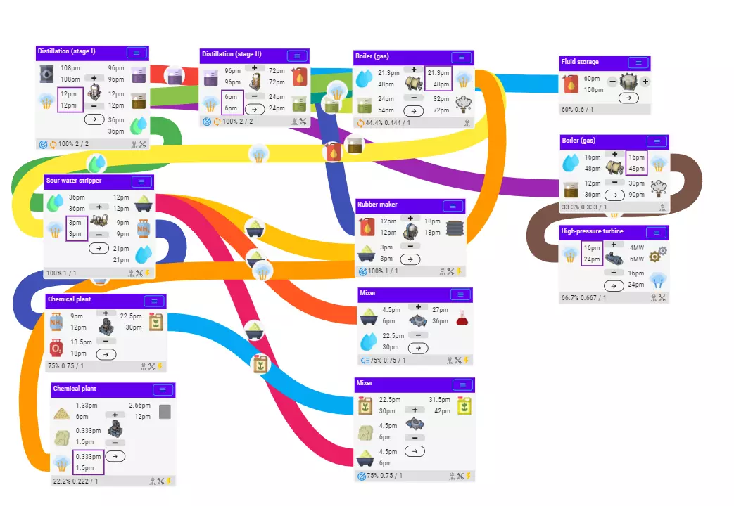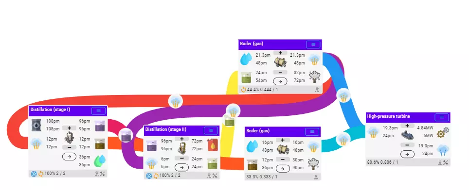 综合来说,应在大部分涡轮中禁止自动平衡,只在最后1-2个负责平衡电网波动的涡轮机组设置自动平衡和飞轮。 另外一点值得注意的是,当电网存在剧烈波动的情况下,例如负载在8-15MW之间剧烈跳动,这种时候需要大大增加飞轮的数量来防止跳电情况,至于这样值不值得就是仁者见仁智者见智了。而且同一连接杆上能连接的电力设备是有限的,所以这种情况还是老老实实让涡轮空转吧。 15. 中期石油冶炼 游戏前中期,通过研究高级柴油,可以将原始柴油冶炼更换为较高一级的柴油冶炼流程。这里建议同时解锁高级柴油,气体燃烧后修建。第二阶段的石油冶炼通过分阶段蒸馏,将原油蒸馏为重油、中油、柴油和酸水。中油和重油送入气体燃烧器产生蒸汽,用于供应蒸馏器。多余的蒸汽可用于发电。在下个版本中,重油可供给轮船航行,因此届时只需使用轻油燃烧产生蒸汽即可(轻油产量届时也会有富余)。 酸水暂时无法处理,只能倾倒或存储(但存储量有限,根本存不完)。