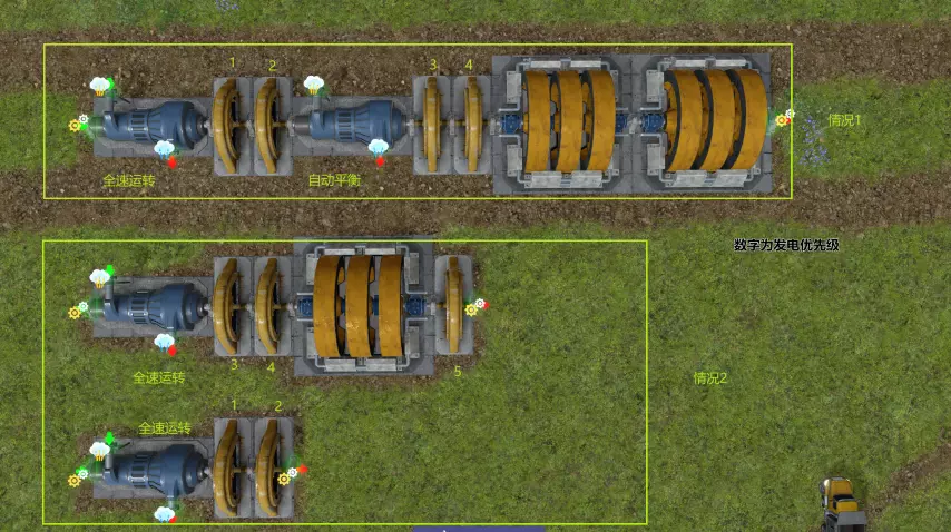 这里有一个小技巧是,处于蓝图模式下的建筑也可以传递机械能,而不用实际建造。 同处于一根机械连杆上的所有发电设备共享连杆的机械能,涡轮产生机械能而发电机消耗机械能。 【注意】涡轮在输入蒸汽时,需要经过一小段时间才能达到百分之百效率。而一旦蒸汽输入停止,效率会立刻降为0。机械连杆本身也需要转速达到一个阈值才能供发电机使用。 【注意】所以,你必须将一个锅炉的全部蒸汽输出到一个涡轮中,不能分出蒸汽给其他设备,否则涡轮会在启动和停转之间来回跳跃,只产生一点点发电量。 发电机严格按照当前电网负载发电,因此当电网空闲时,涡轮不会停转,产生的机械能会浪费掉。解锁机械储能后,可以建造飞轮来储存能量。当机械能供大于求时,飞轮会存储原本溢出的机械能;而当机械能供小于求时,飞轮可以释放储存的机械能。 同时,涡轮新增了自动平衡选项。当机械连杆存储的机械能较高时,涡轮会停止工作,直到机械能存储过低。 【注意】自动平衡和飞轮是比较复杂的功能,使用不当会导致电网持续大停电。 这里简单介绍一下使用思路:假设电网负荷一直处于6-7MW左右,一个涡轮能产生4MW电力,两个涡轮则会产生8MW电力,此时会一直有1-2MW电力被浪费掉。因此可以建造两排发电机,第一个涡轮连接两个发电机,将发电机电力优先级设为1,并禁止自动平衡。第二个涡轮连接两个发电机和一个飞轮,发电优先级分别设为3和4,启用自动平衡。此时飞轮蓄满电力后涡轮停转,三个发电机始终以100效率运行,第四个发电机偶尔运行,消耗飞轮机械能,直到飞轮能量过低时2号涡轮重新开启。 注意发电机也有发电效率一说,只有在100%负荷发电时,效率才是最高的,因此我们需要通过设置发电机电力优先级,来保证只有少量发电机处于非满负荷状态运行。这也是解锁发电效率更高的大型发电机后,依然需要小型发电机的原因,大型发电机提供2MW电力需要3.xMW机械能,而小型发电机只需要3MW,在大型发电机低负荷时,效率低于小型发电机。 另一种情况是,假设我们的电网负荷在7.当X-8.xMW出现波动时,建造3个涡轮并不划算。我们可以将2号涡轮连接3个发电机和1个飞轮,禁用自动平衡,并将最后一个发电机的优先级设为最低,这样就能实现削峰填谷的效果。但需要注意的是,这要求电网的长时间平均负荷略小于8MW,否则仍需修建第3个涡轮。