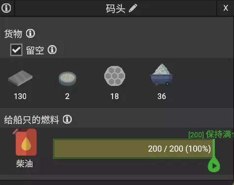 如图所示,点击码头可以看到绿色的条纹区域为船只的当前航线,接近透明的浅绿色条纹区域为船只可能的航线,分别为向前航行、向左航行和向右航行。如果三条航线都被陆地阻塞,船只将无法出航。同时红色的部分为船只停靠时占据的大小,要比港口略大一些。如果船只的停靠位置占据了其他船只的航线,同样会导致其他船只无法航行。不同船只的航线可以互相重叠。 因此如果要填充一条深入海洋的垂直港口,要离中心母港远一点。图右侧为不会阻碍母舰航行的填海区域,注意货船的大小略小于母舰大小。 8. 基本石油冶炼 柴油是游戏的最基础资源之一,卡车依靠柴油驱动。因此一旦柴油耗尽前没有建立起石油冶炼工业,游戏会陷入死亡螺旋。