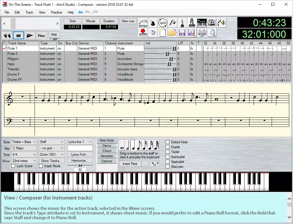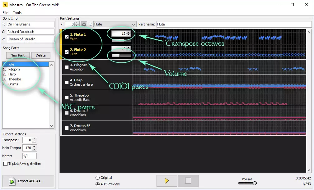 Maestro allows you to pick your own drums from the drop down menus. I may have named the drums differently in my drum video (I find them more convenient as such) but the ABC notes shown on the left are still the same as in Maestro. Creating Drums from Scratch Creating drums from scratch may sound intimidating at first but to write like a drummer one must think like a drummer. On stage they use their feet for bass drums and hands for everything else and thus I also recommend working in layers. One layer for bass drums, One for medium drums and... One for shakers and tambourine. Once these individual "limbs" work on their own they may be combined as one track if it makes sense for volume changes. If you want some visual reference then some sheet music or live video from the drummer's perspective will be handy. Combining Drums for New Sounds One of the upsides of working with drums is increasing their volume by creating a "chord" of two or more similar drums so you won't have to touch the actual volume effects at all. You may also use your imagination by combining two different drums for creating a new one. For example, Slap + Shaker = Snare drum. Creating Volume Changes Volume in ABC Files ABC files have a volume change that works rather like stairs instead of a slide. It looks like this: +pppp+ (10%) +ppp+ (20%) +pp+ (30%) +p+ (40%) +mp+ (50%) +mf+ (60%) +f+ (70%) +ff+ (80%) +fff+ (90%) +ffff+ (100%) Volume and Velocity in the MIDI File Maestro will read all volume changes within a MIDI file and make the closest copy accordingly but the file may also have some info on note velocity, also known as the force of key strike. It does different effects depending on a synth but it also translates as volume change in Maestro. Thus the volume in the final edit has two factors instead of one. Gradual Volume Changes When the volume of a single track is changed in Maestro it will keep the volume changes written in the notes. Yet the change won't be relative like it would be when editing a wave file. Instead, the change will shift every volume from +pp+ to +p+ or +f+ to +ff+ – all of them are increased by one. That is why I recommend using a MIDI editing software with a curve editor (like automation clips with channel volume here) if you want some accurate gradual changes to the volume, while using Maestro as a reference on where every volume should be at a point. If you want noticeable changes to the volume then the velocity of all notes should be 100 before adding the curves (unless volume change by velocity is intentional). If it's lower then the change will also remain more shallow. Volume in Chords It is best to keep instruments as separate if you wish to preserve a chord with differing volumes, as in one part as solo and the other as supportive. When trying to pack them as one track Maestro tends to pick the highest given volume in a chord and give it to all the other notes within. It might drown the solo parts under the supporting sounds, more than intended. Echo One easy way to create an echo is to have two or three identical tracks and set the others to begin with a delay. The one that begins should be louder and the ones that follow more silent. Whether they can be combined as one track depends if the notes are played on top of one another. Reading and Manually Editing ABCs ABC Files in Notepad ABC coding is quite simple, and the information can be safely edited for some things by using an app such as Notepad in Windows. They look like this inside: %abc-2.1 %%song-title Path of the Wind %%song-composer Joe Hisaishi %%song-duration 3:10 %%song-transcriber Elvealin of Laurelin %%abc-creator Maestro v2.5.0 %%abc-version 2.1 % Some parts are hidden for the guide. X: 3 T: Path of the Wind (3:10) - Basic Flute %%part-name Basic Flute C: Joe Hisaishi Z: Elvealin of Laurelin M: 4/4 Q: 172 K: C maj +f+ z [A,/E/] z/ [G,/D/] z/ [E,/A,/] z/ [A,/E/] z3/2 [G,/D/] z/ [E,/A,/] z/ | z [A,/E/] z/ [G,/D/] z/ [E,/A,/] z/ [A,/E/] z3/2 [G,/D/] z/ [E,/A,/] z/ | z [G,/D/] z/ [E,/C/] z/ [C,/G,/] z/ [G,/D/] z3/2 [E,/C/] z/ [C,/G,/] z/ | z [G,/D/] z/ [E,/C/] z/ [C,/G,/] z/ [G,/D/] z3/2 [E,/C/] z/ [C,/G,/] z/ | z [A,/E/] z/ [G,/D/] z/ [E,/A,/] z/ [A,/E/] z3/2 [G,/D/] z/ [E,/A,/] z/ | z [A,/E/] z/ [G,/D/] z/ [E,/A,/] z/ [A,/E/] z3/2 [G,/D/] z/ [E,/A,/] z/ | z [G,/D/] z/ [E,/C/] z/ [C,/G,/] z/ [G,/D/] z3/2 [E,/C/] z/ [C,/G,/] z/ | z [G,/D/] z/ [E,/C/] z/ [C,/G,/] z/ [G,/D/] z3/2 [E,/C/] z/ [C,/G,/] z/ | z [A,/E/] z/ [G,/D/] z/ [E,/A,/] z/ [A,/E/] z3/2 [G,/D/] z/ [E,/A,/] z/ | % Bar 10 (0:12) ... and so on ... Meaning of Different Symbols "%" is a comment, information that is seen only when reading the file and not in-game. "X:" defines which track is played when the number is referred to. Each number of a track must be unique. "T:" is the title of a track. This info will be shown in-game with some given extras. "C:" is the composer. "Z:" is the transcriber. This can be used when the creator of file isn't the original composer but rather the arranger. "M:" is the time signature. Can be changed during the song. "Q:" is BPM (beats per minute) to mark the speed of the song. Can be changed during the song. "+pppp+ – +ffff+" is the volume of the notes or chords. Can be changed during the song. "z" is a rest, followed by a possible number or slash to mark duration. "C, – c'" is the pitch of a note, followed by a possible number or slash to mark duration. "[ ]" has the chords inside. "|" marks a new bar. Debugging an ABC File Does Something Seem Off?