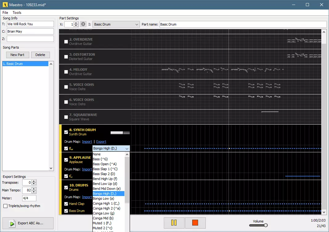 下一步是使用一款能将歌曲从MIDI格式转换为ABC格式的应用程序。Maestro和BruTE是比较知名的两款。记得关注它们的更新,尤其是在游戏乐器有变动或转换器功能有改进之后。 将多个MIDI声部合并为一个ABC声部 你可以选择两个或更多MIDI音轨合并到一个ABC音轨中。如果你想将多声部歌曲压缩为独奏版本,这可能会很有帮助。### 制作清晰的编曲 《指环王 Online》ABC文件中,单个乐器能够演奏的最大和弦由六个音符组成。若和弦包含七个或更多音符,编曲助手(Maestro)会从编曲中删除部分音符以确保正常运行。 不过,若将整个管弦乐队的部分压缩给单个独奏者演奏,可能会听起来杂乱。最好尝试制作听起来设计精良的编曲。 ### 移调音符 当所选乐器声部的音符超出音域范围时,编曲助手(Maestro)会用红色标记提示。尽管这些红色音符仍会播放并被转换,但它们会被自动移调至最近的八度,这可能无法始终达到预期效果。如果MIDI文件的音符范围与你想要使用的乐器不匹配,可以按八度移调整首乐曲,但要转换到新的调式则需要使用MIDI编辑器。 ABC转MIDI 如果你有歌曲的ABC版本,可以尝试使用ABC Navigator将其转换回MIDI。 鼓组使用 鼓组映射 在《指环王 Online》中,鼓组是特殊的存在,因为它不遵循统一的旋律模式,每个音符对应一种鼓。我已在视频中按类型和音高从低到高对它们进行了分类。 MIDI文件中的鼓轨不应移调;移动音符会破坏鼓组映射,导致鼓声完全不同。 从下载的MIDI创建鼓组