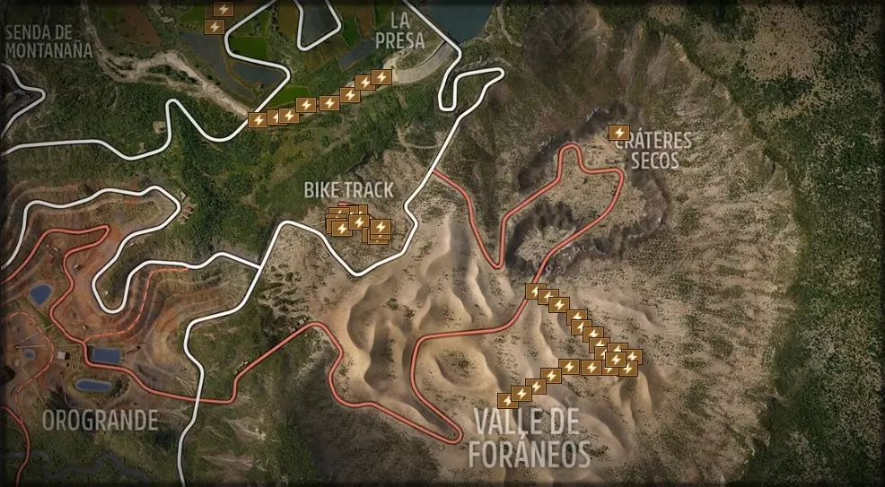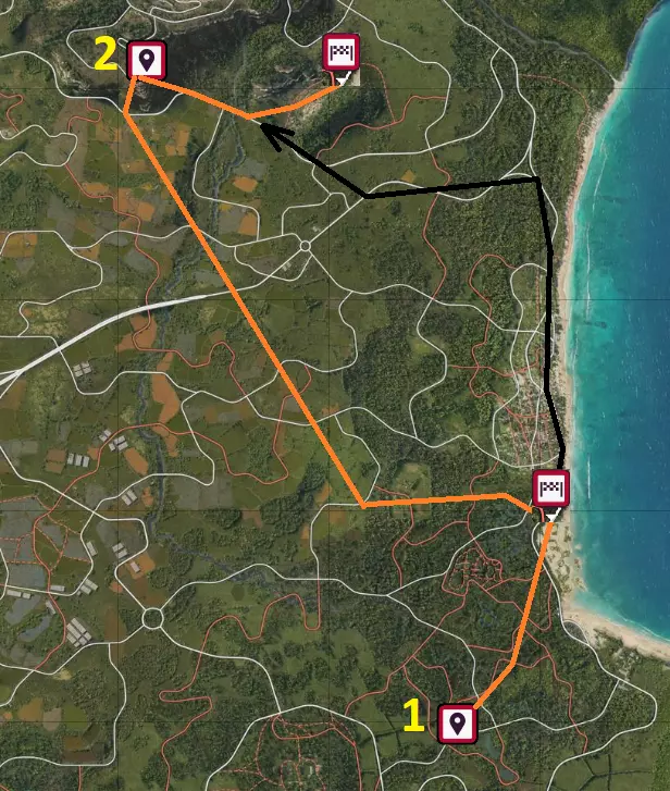 进行游戏时,建议开启成就追踪功能。如果该功能不可用,请先完成其他几条新手赛道。 由于“拉马里斯马”(数字1)新手赛道的位置不太方便,建议从该赛道开始,然后前往“普埃尔塔-佩特雷亚”(数字2)赛道。 如果您喜欢越野路线,可选择橙色路线,行驶路径可以有所不同。如果你大多时候想沿着道路行驶,那就选择黑色路线。如果遇到困难,可以随时使用倒带功能,这不会对计时器产生任何影响。 如视频所示,这里的路线要穿过无路地带。A级汽车是通过【欢迎包】获得的。你可以选择更快的汽车,并且为了方便别忘了使用倒带功能。