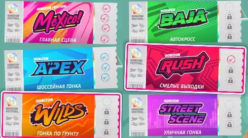 游客的磁铁 首次完成地平线巡回赛的赛程。 游戏模式为玩家团队对抗车手团队。系列赛按类型划分,车辆按等级划分。可以通过前往地图上的图标处,或通过菜单选择【节日游戏】来启动。 只需在一场比赛中完成即可获得该成就。