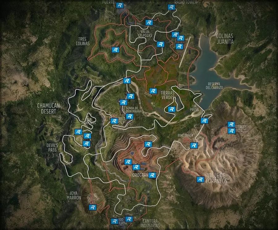 游戏中共有6个前哨站,包括游戏初期解锁的主场景。这些前哨站的建造始于对墨西哥广阔地图上各个区域的探索。解锁前哨站后,你将获得多种类型的比赛。