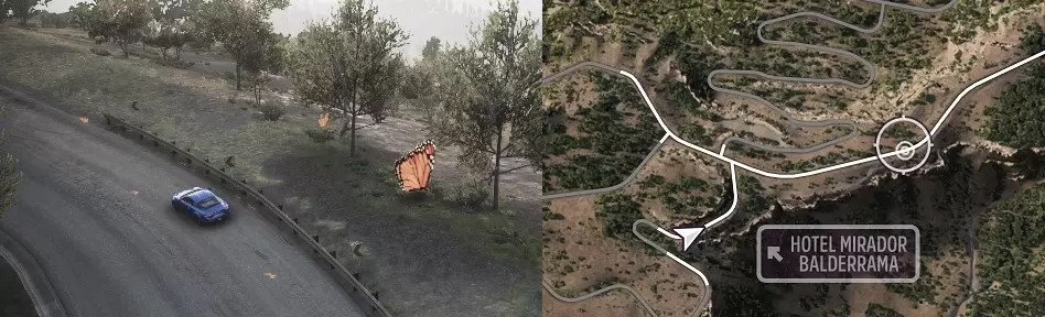 帝王出游 在黎明时分,将您的爱车停在【米拉多尔·巴尔德拉马】酒店旁拍照,并捕捉帝王蝶。 您可以使用现成的赛道。查找赛道的方法如下:打开菜单 - 创意中心选项卡 - EVENTLAB - 赛道蓝图。点击搜索按钮,在最底部输入发布代码149 955 830。同时,您也可以使用该地区的可用赛事(火热季节 - 春季)。如果成就未解锁,请转动视角,上方会有酒店,拍摄该部分。