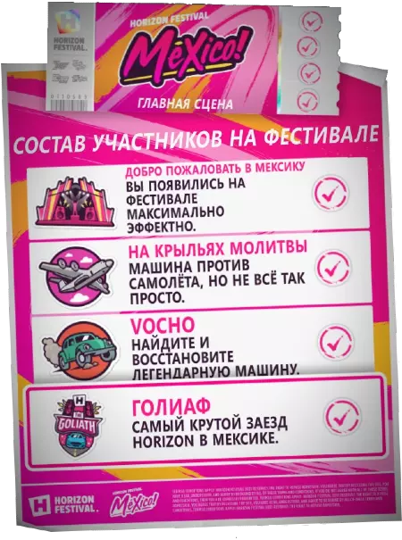在“地平线风格冒险”板块的每个类别中,都有其最终赛事。需要获得必要的声望点数以开启最后一章并解锁最终赛事。在墨西哥“主舞台”板块解锁【歌利亚】赛事,是完成此目标更快更简单的方法。