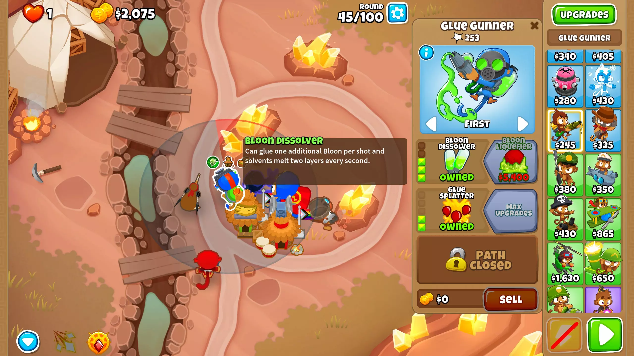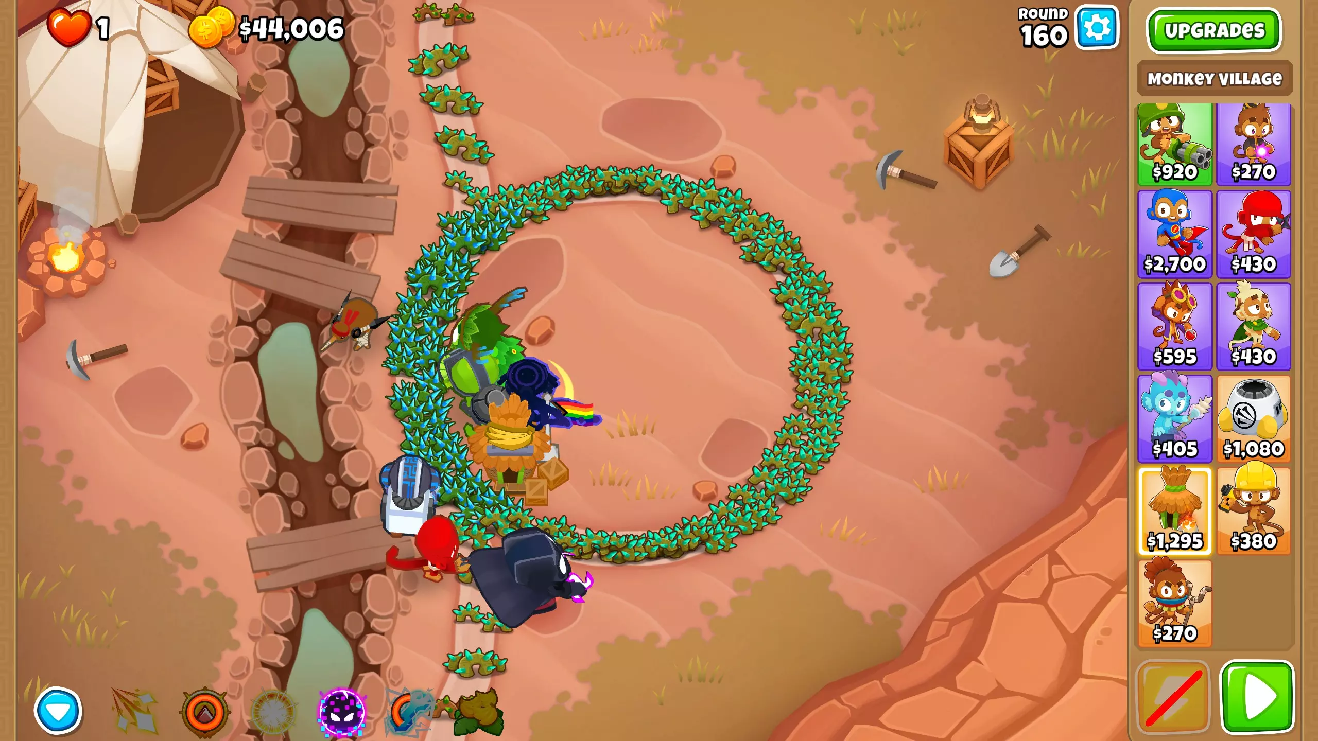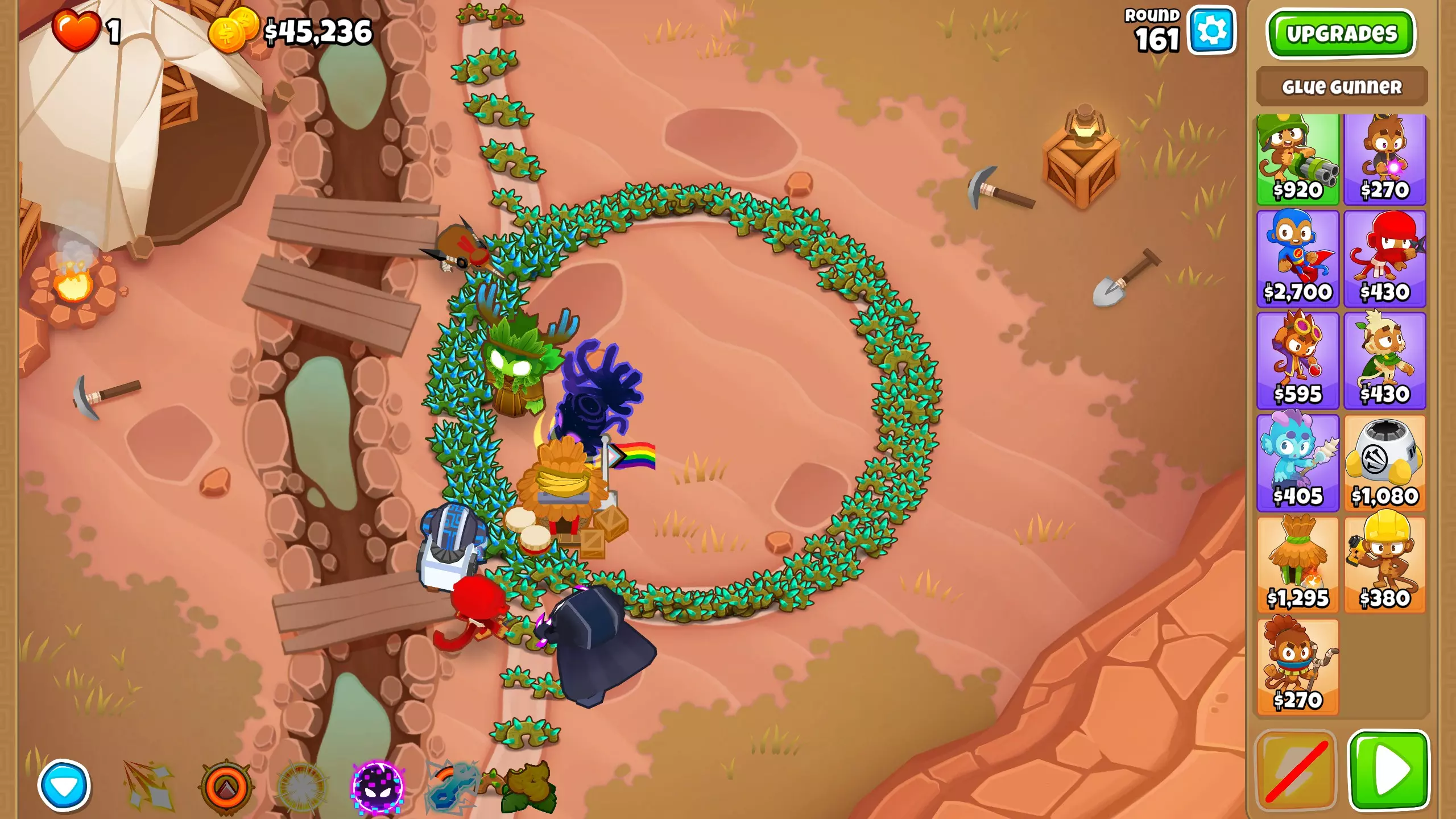 第44回合 当你的防御开始难以抵挡越来越多的气球攻势时,在两个村庄的范围内放置一个胶水猴,并将其升级为2-2-0。 我们要尽快将这个猴子升级到4-2-0,以确保有足够的防御来对抗陶瓷气球。