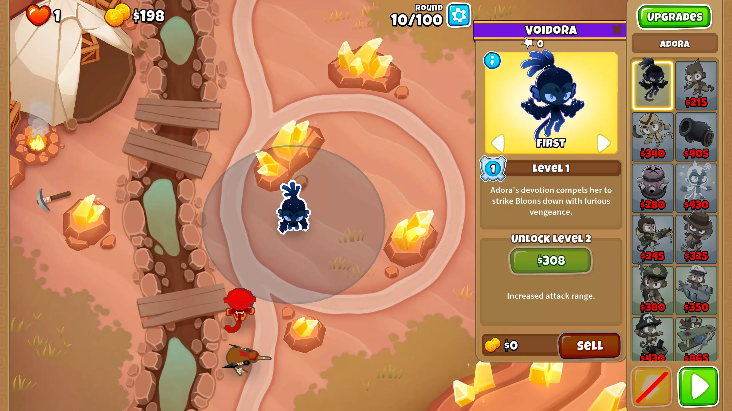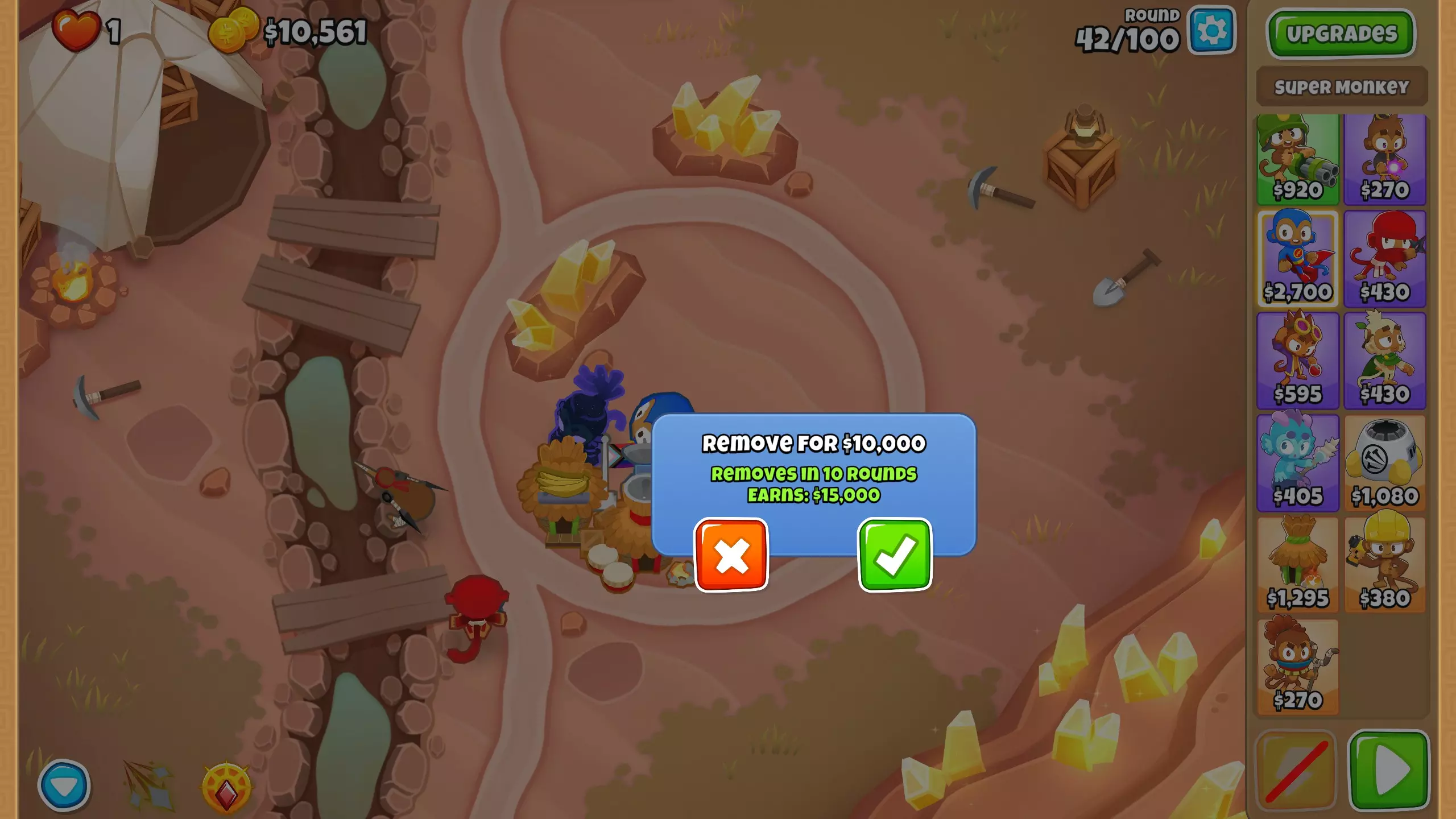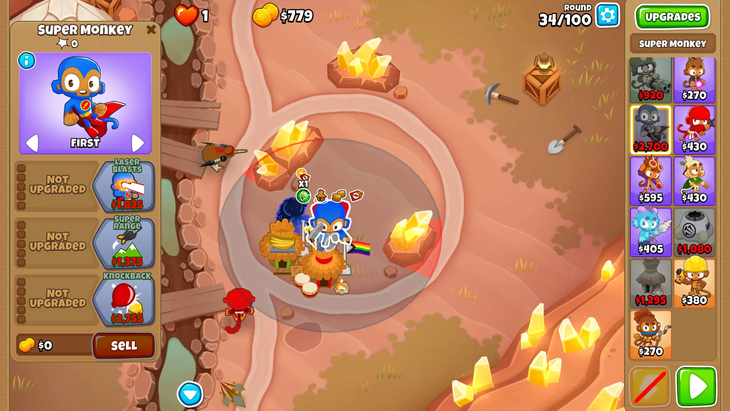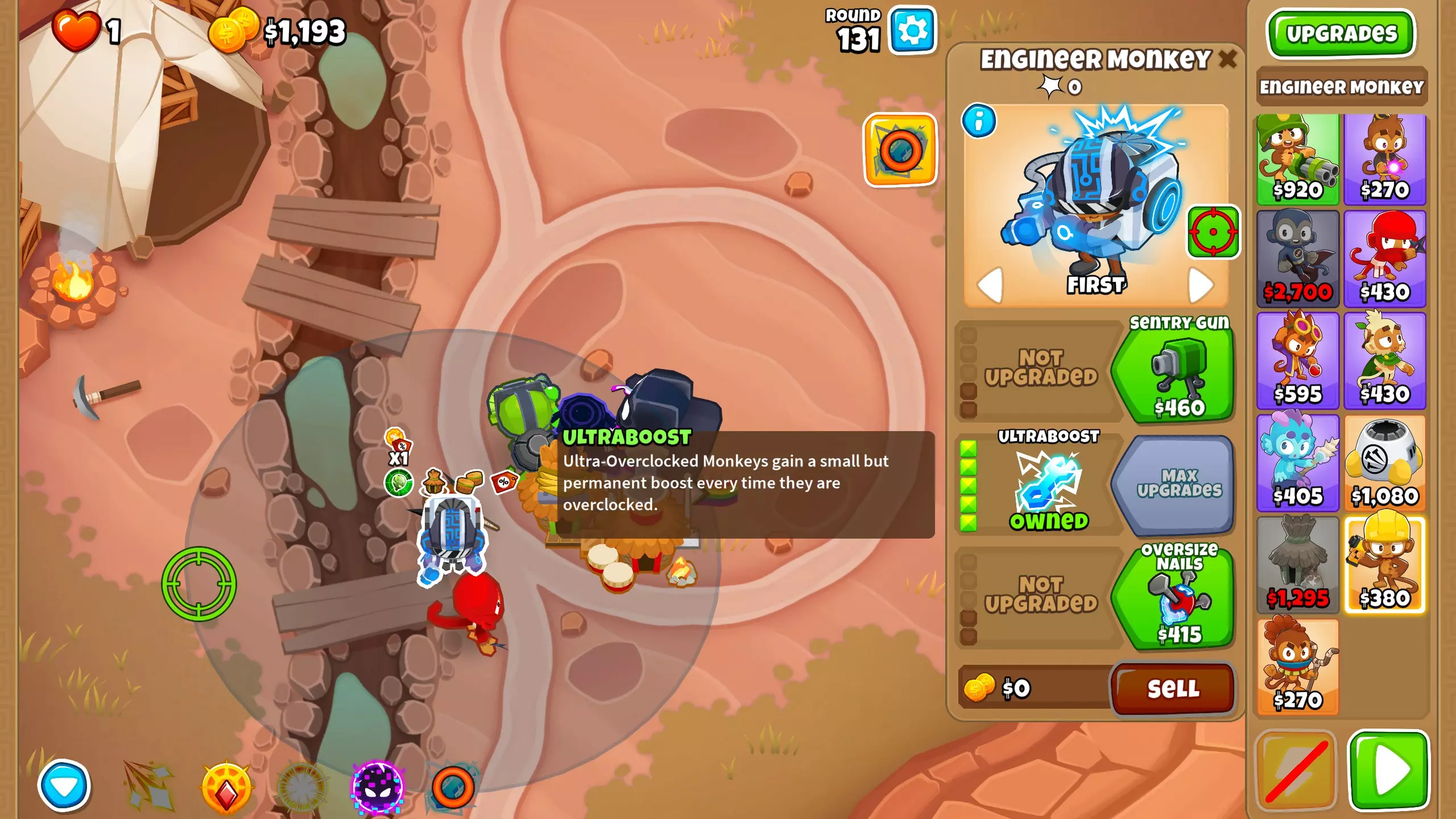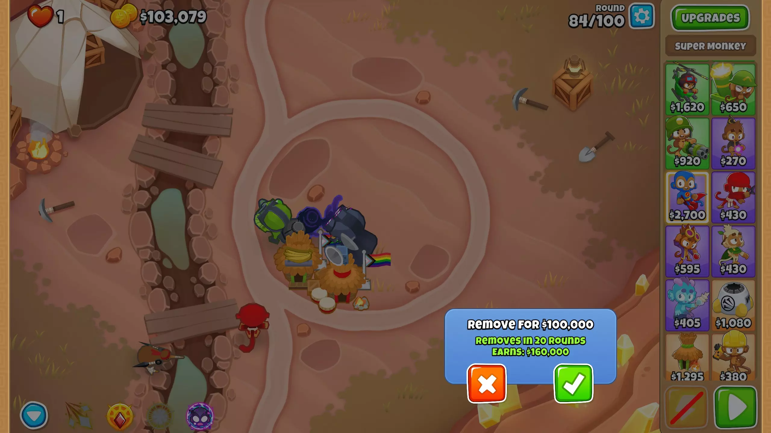 第100回合,正好赶上第100回合的BAD,我们有足够的钱终于把超级猴子升级到2-0-4了。
