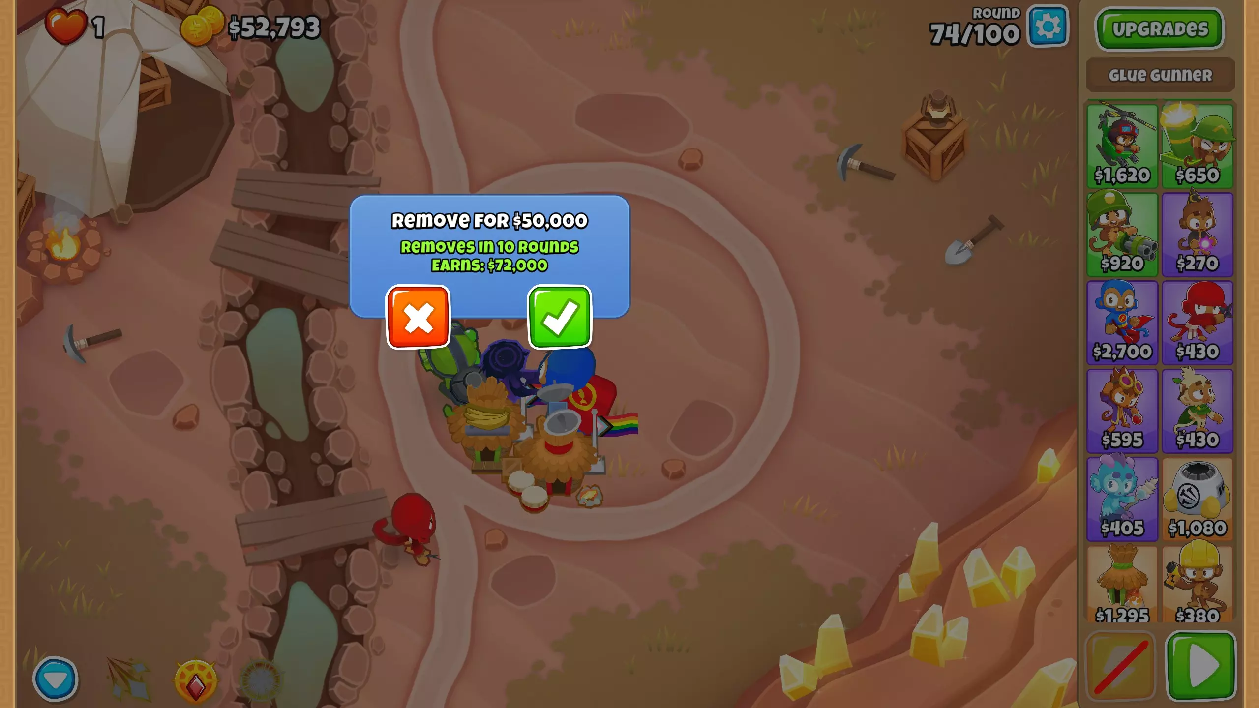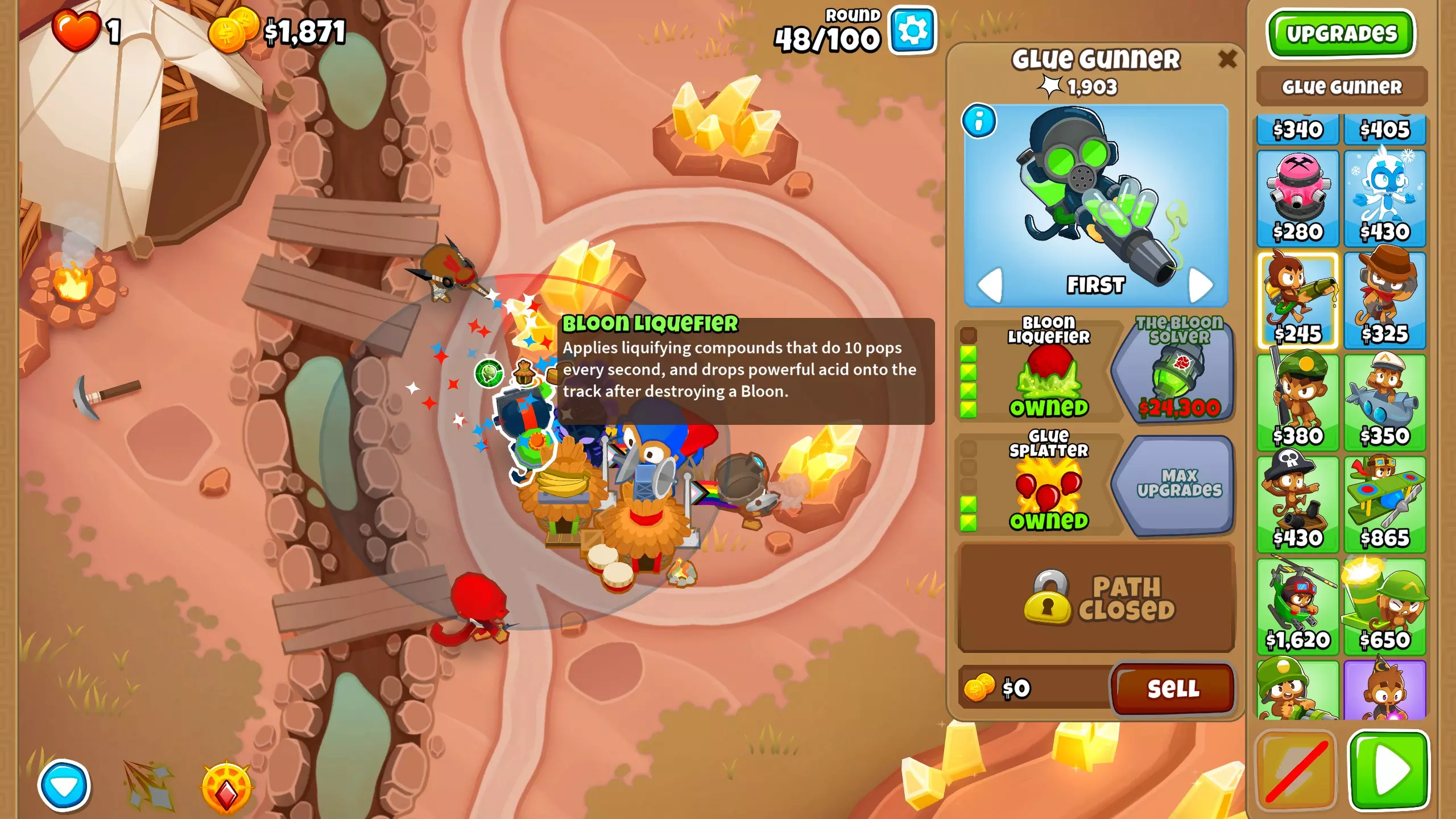第63回合 尽管我们现在有足够的资金重新开始采矿,但这一次我们必须保持清醒的头脑,将安全置于贪婪之上。 将胶水升级为5-2-0。 【气球溶解器】是游戏中最强大的猴子之一(个人拙见),能让我们轻松度过游戏中期的剩余阶段。