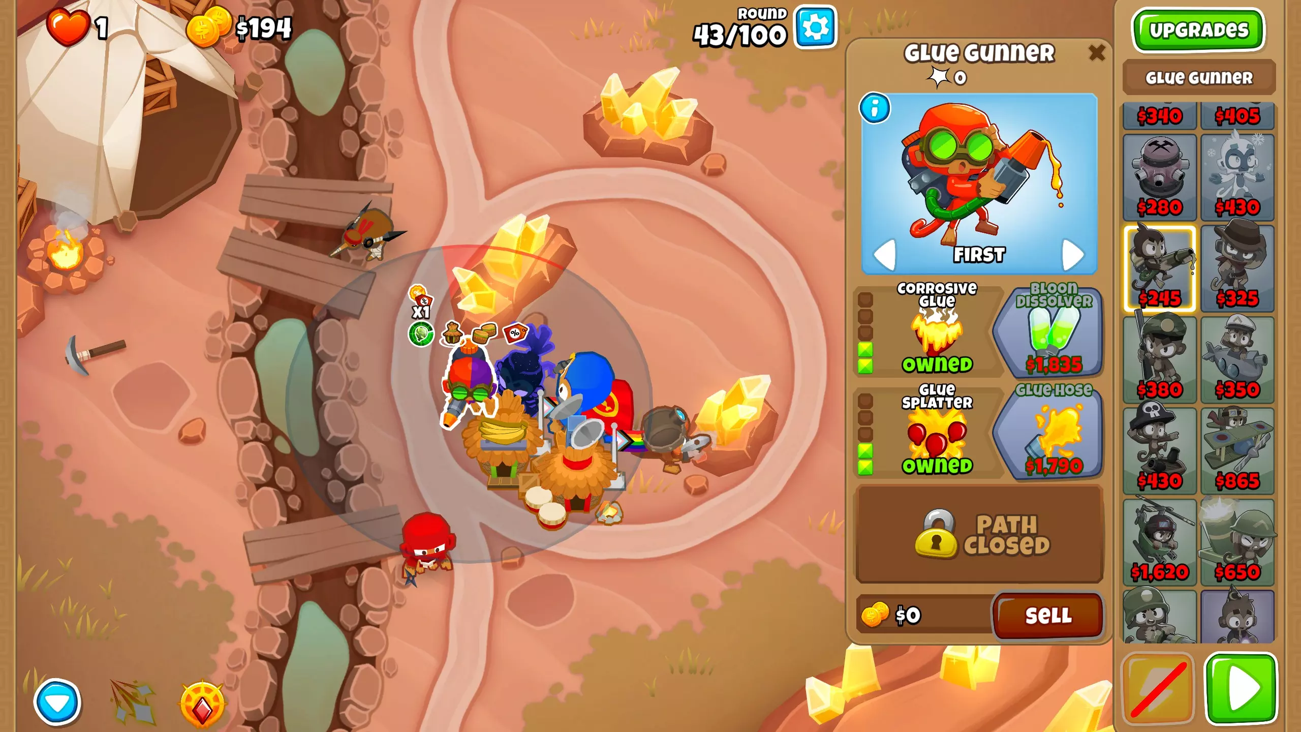 在地图左边界放置一个胶水猴,并将其升级为0-4-0胶水打击。我忘记这么做了,所以没有合适的图片,抱歉。这里有一张其他游戏的图片,希望你喜欢。