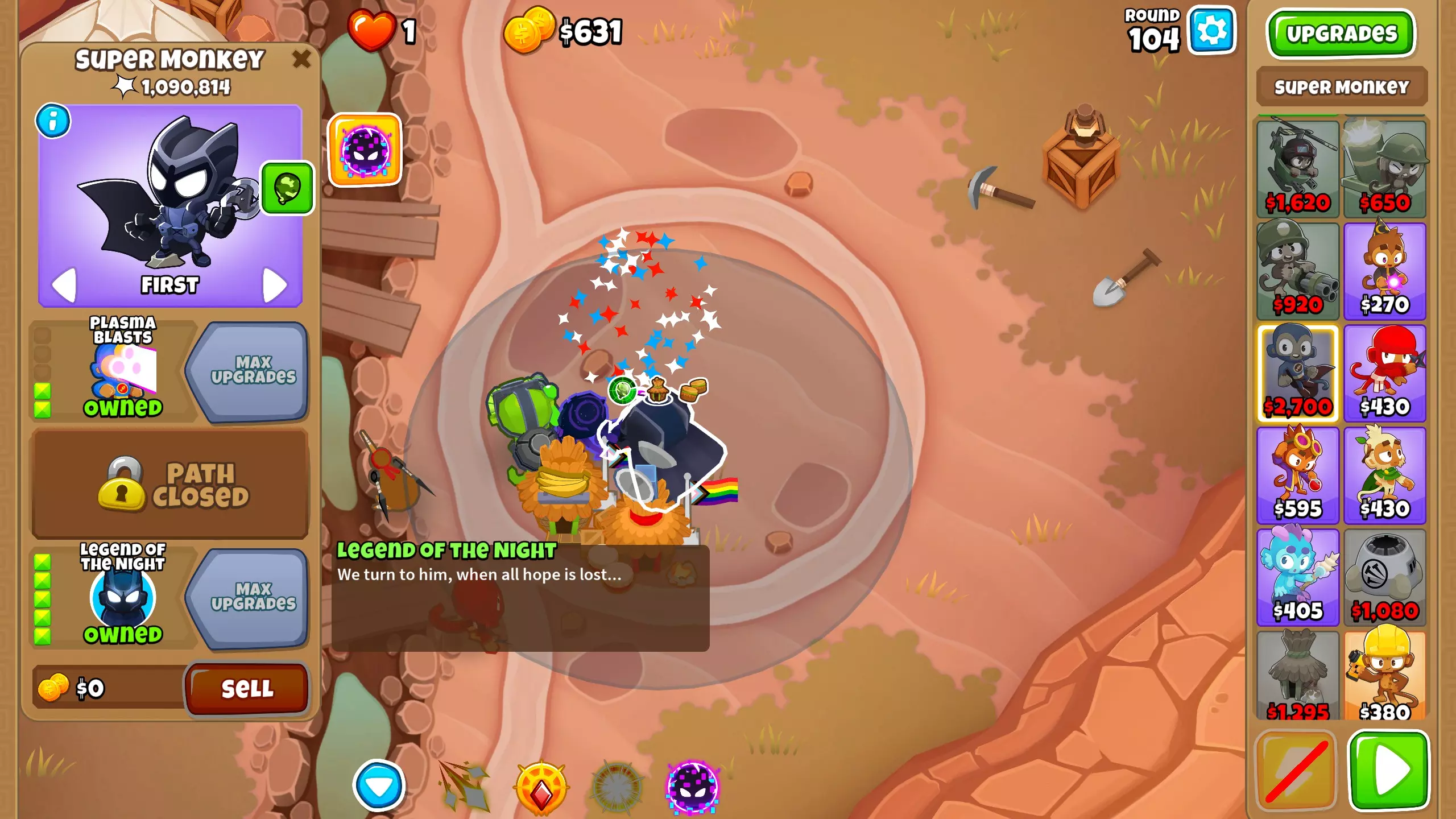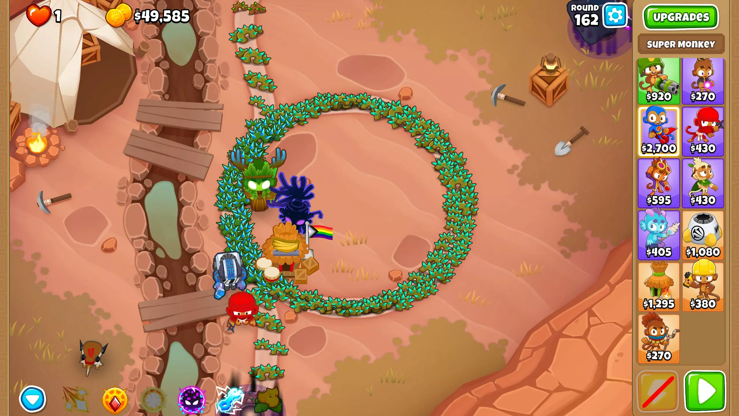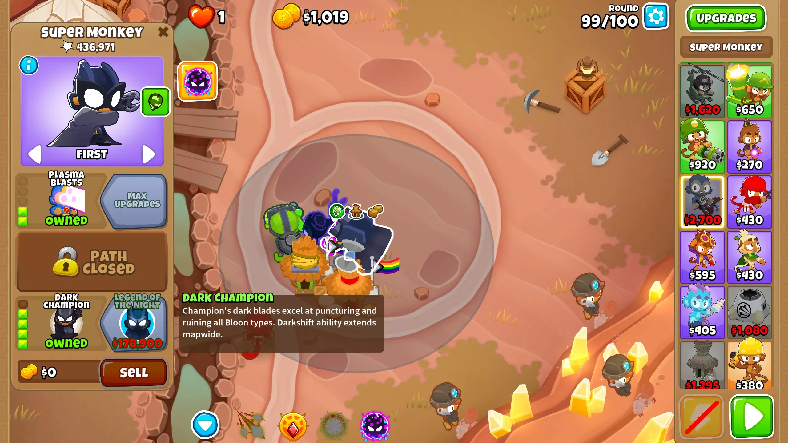 第101波:恭喜你击败了 chimps 模式,现在可以获得新的即时猴子! 第105波:终于从最后一个金矿获得了资金,现在我们有足够的钱来购买能带领我们打到第163波的主力输出——暗夜传说。将超级猴子升级为2-0-5。凭借蝙蝠猴的全部力量,它们将在接下来的波次中消灭所有气球。你可以根据需要使用暗夜传说的传送技能来传送它们。