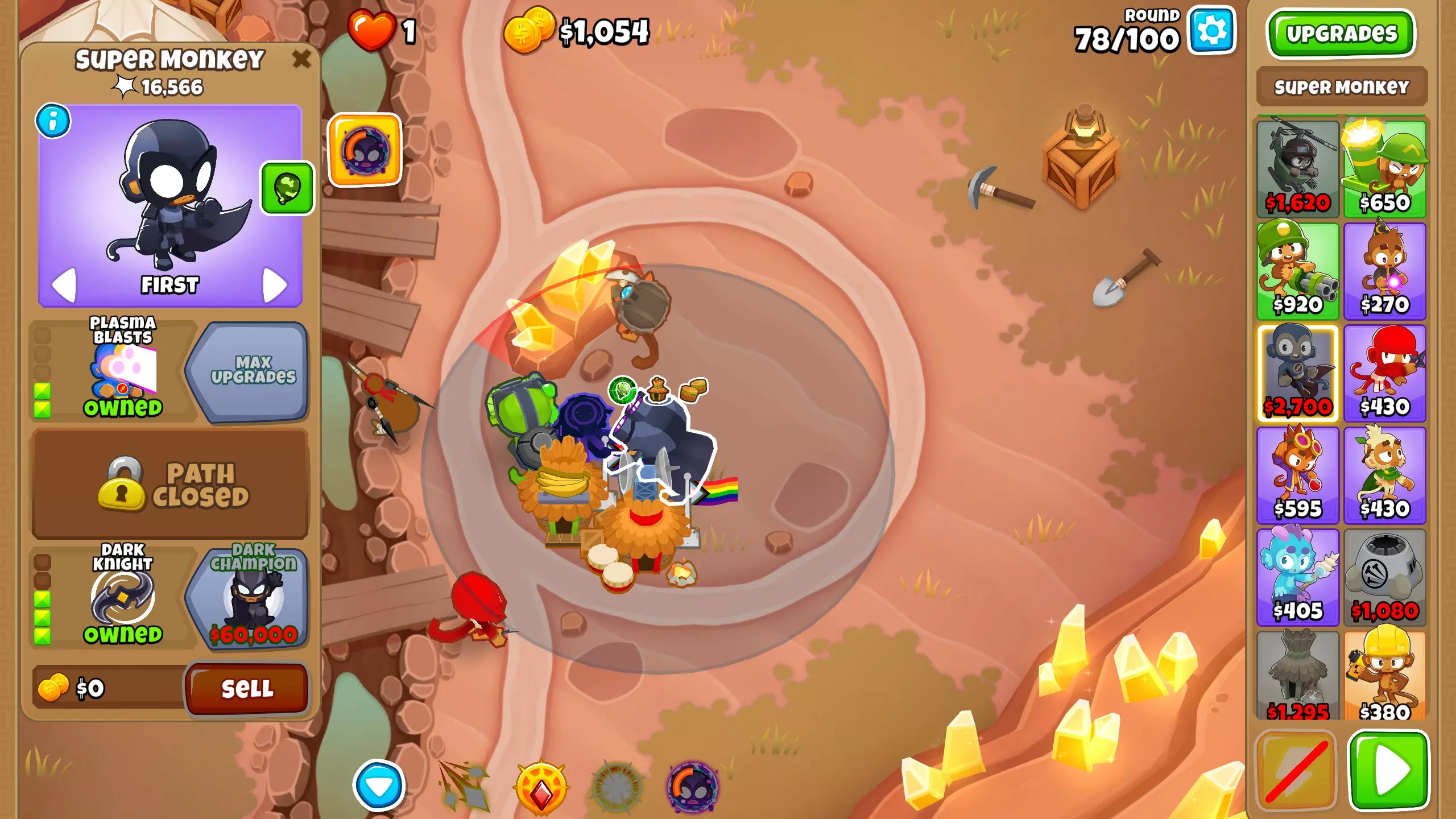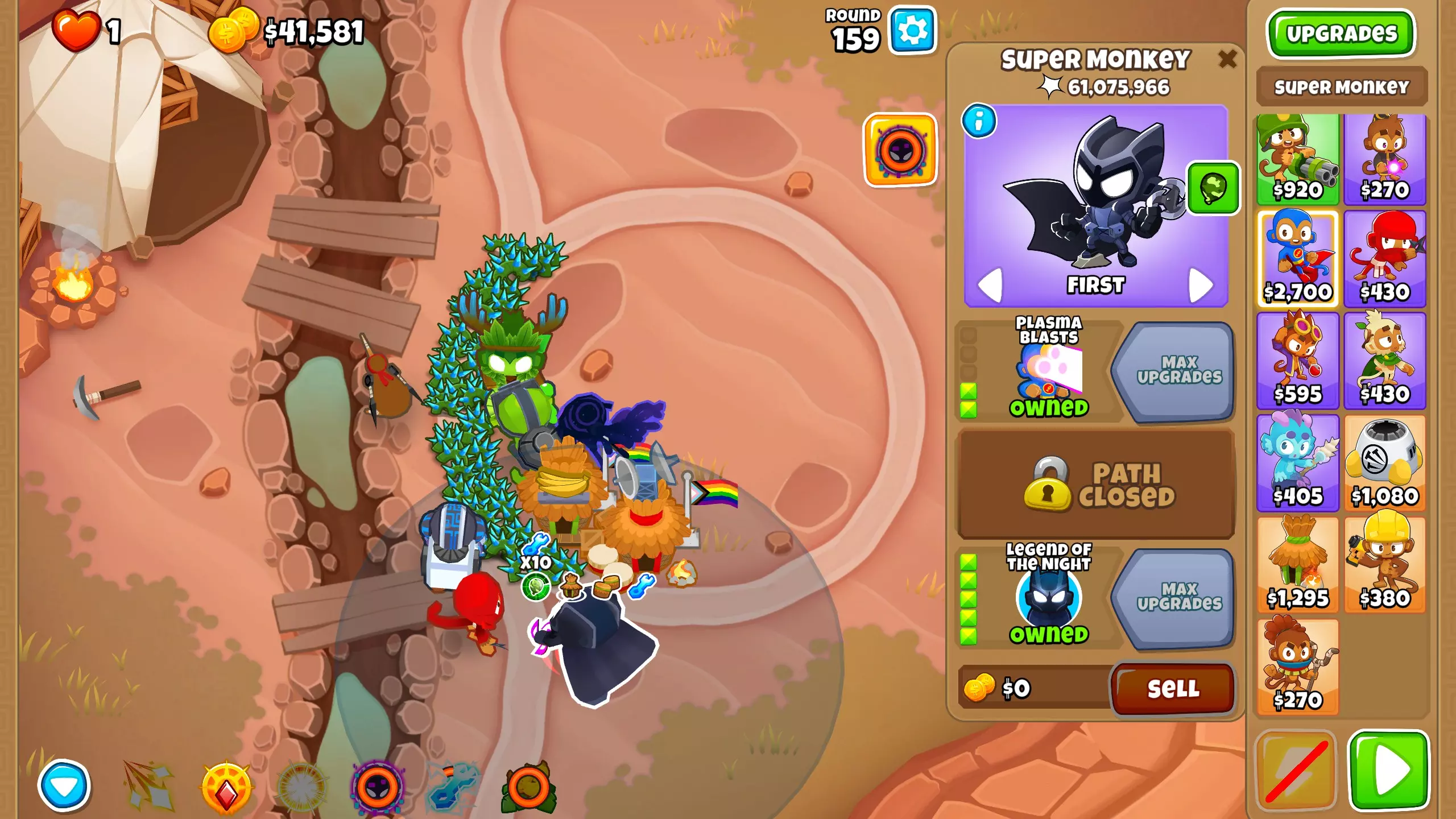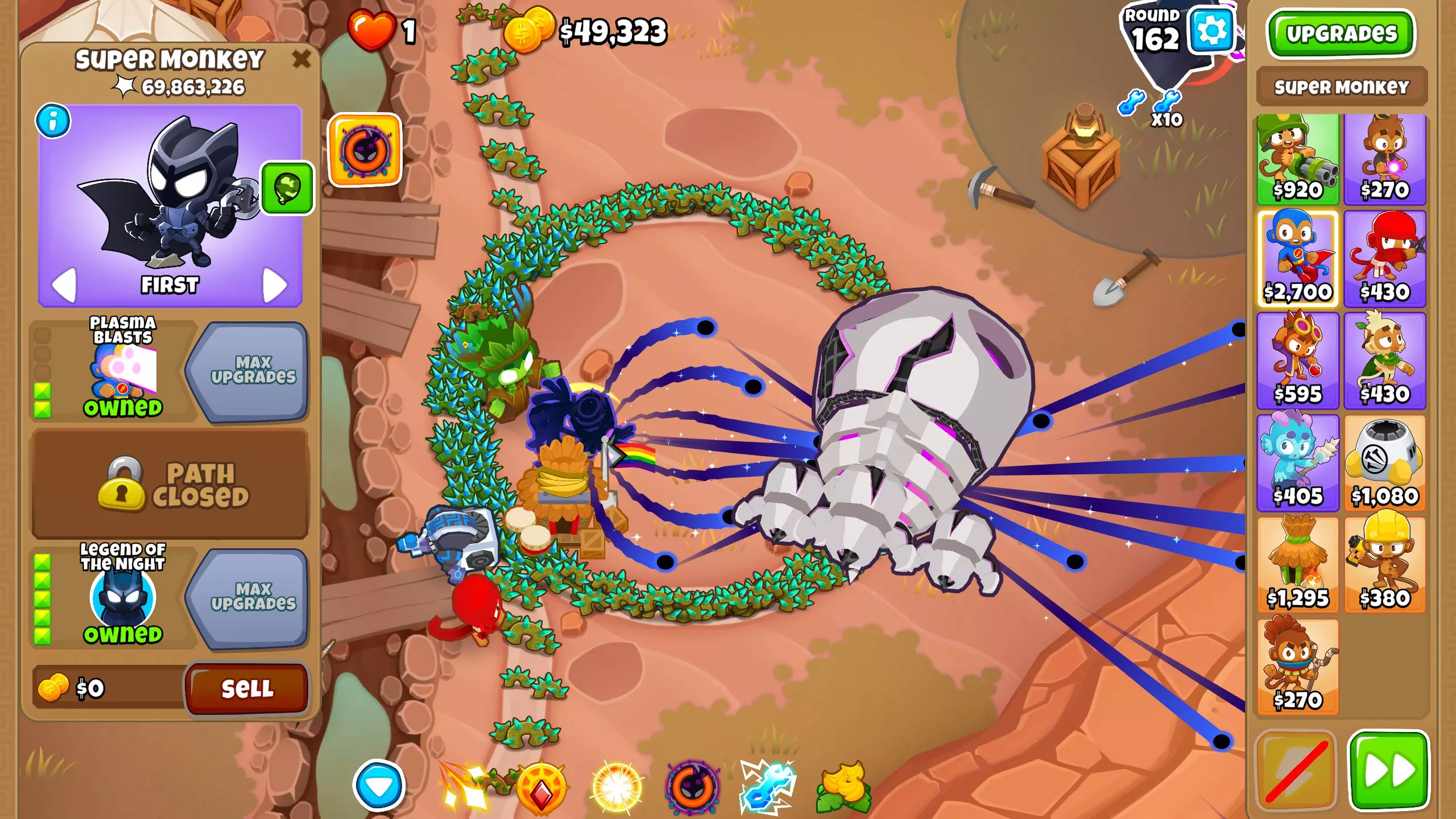 第101波:恭喜你击败了 chimps 模式,现在可以获得新的即时猴子! 第105波:终于从最后一个金矿获得了资金,现在我们有足够的钱来购买能带领我们打到第163波的主力输出——暗夜传说。将超级猴子升级为2-0-5。凭借蝙蝠猴的全部力量,它们将在接下来的波次中消灭所有气球。你可以根据需要使用暗夜传说的传送技能来传送它们。