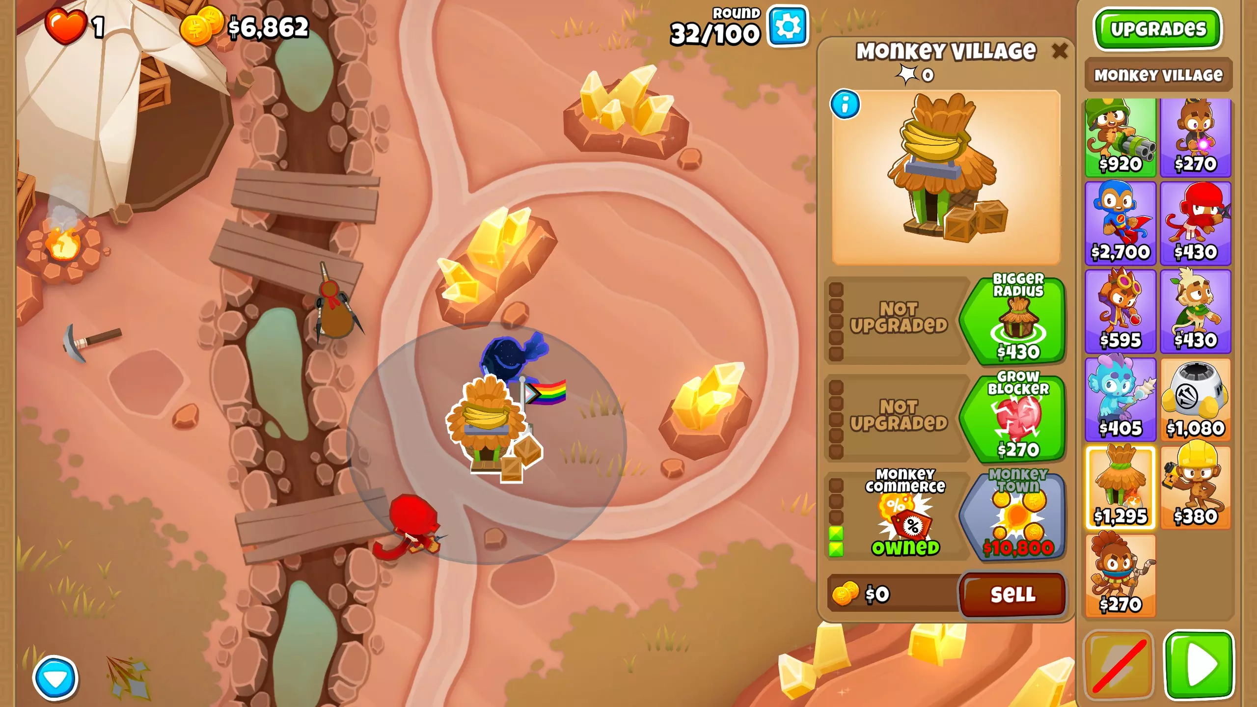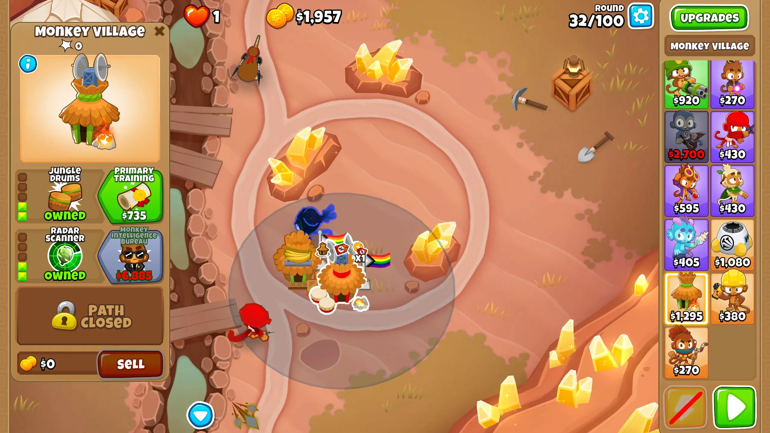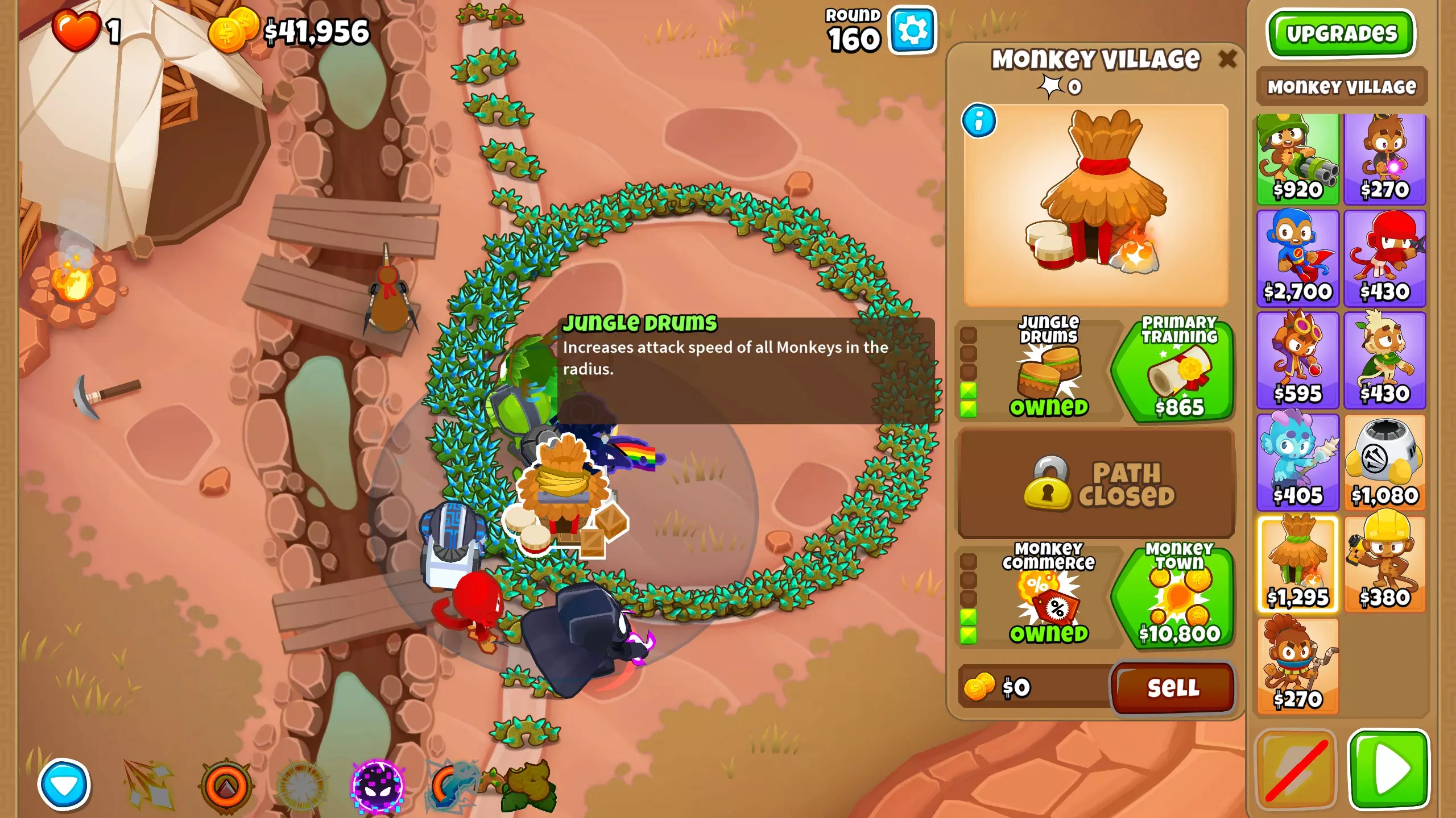 第25波 这是首次出现紫色气球的波次,而阿多拉对紫色气球存在弱点。 我在这一波没有遇到问题,因为我的忍者猴能够击破所有紫色气球。但如果你难以通过这一波,可以将忍者猴的目标设置为【最强】(波次结束后调回【首个】),或者在紫色气球出现时使用阿多拉的3级技能。 第32波 又一波有紫色气球的波次,这次我在未操作的情况下确实失败了。 同样,将忍者猴的目标设置为【最强】或使用阿多拉的3级技能。 这是最后一波需要使用阿多拉技能的波次,从现在开始你可以随时使用它们。 第33波 现在你需要放置两个【村落】。放置第一个村庄并升级至0-0-2。你可能以为开采地图上的黄金对我来说就足够了,但你看我的贪婪是无止境的。说正经的:这个村庄实际上能帮你省下大量金钱,因为从现在开始,你放置的每只猴子在3级之前都会便宜15%。