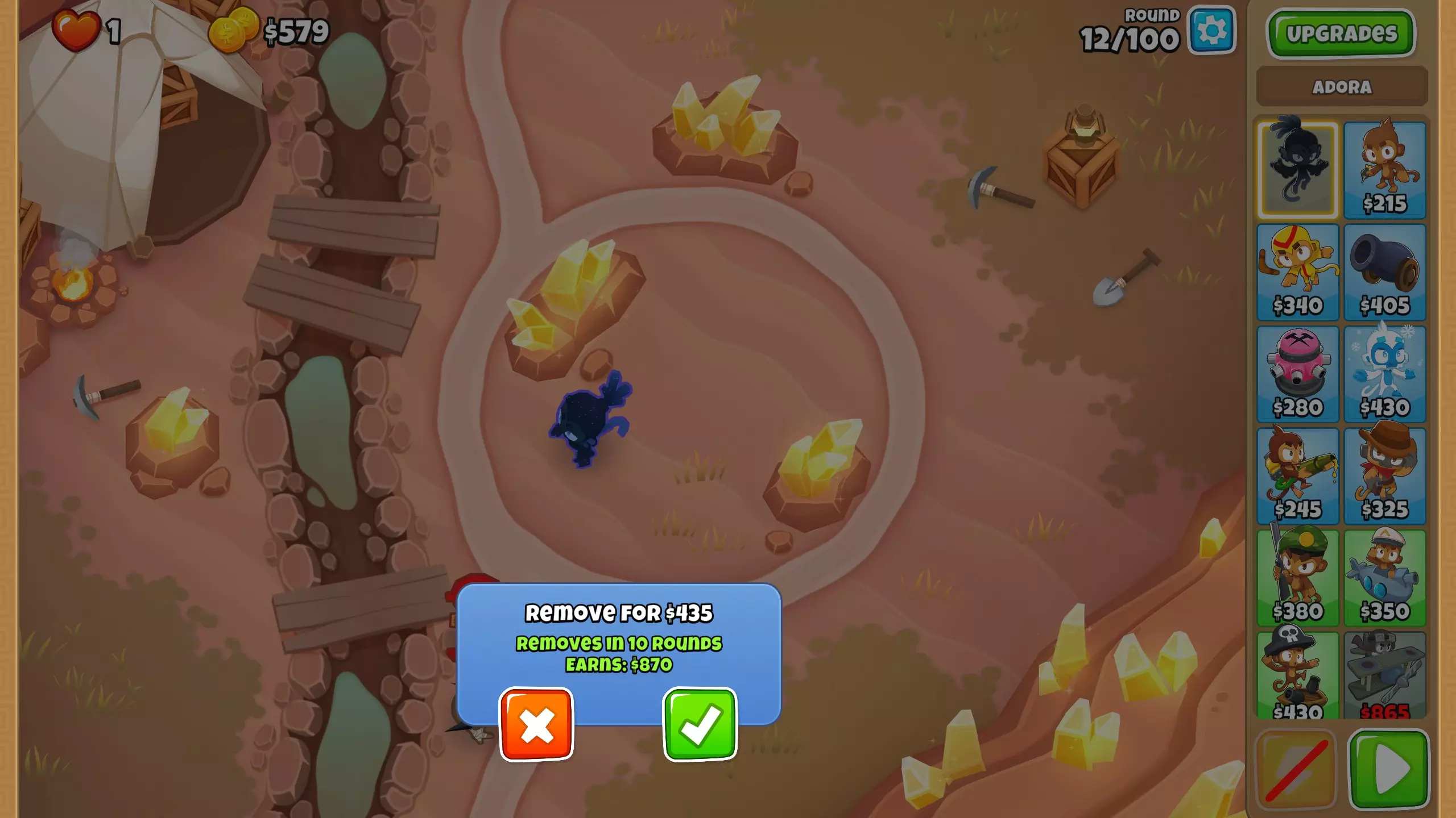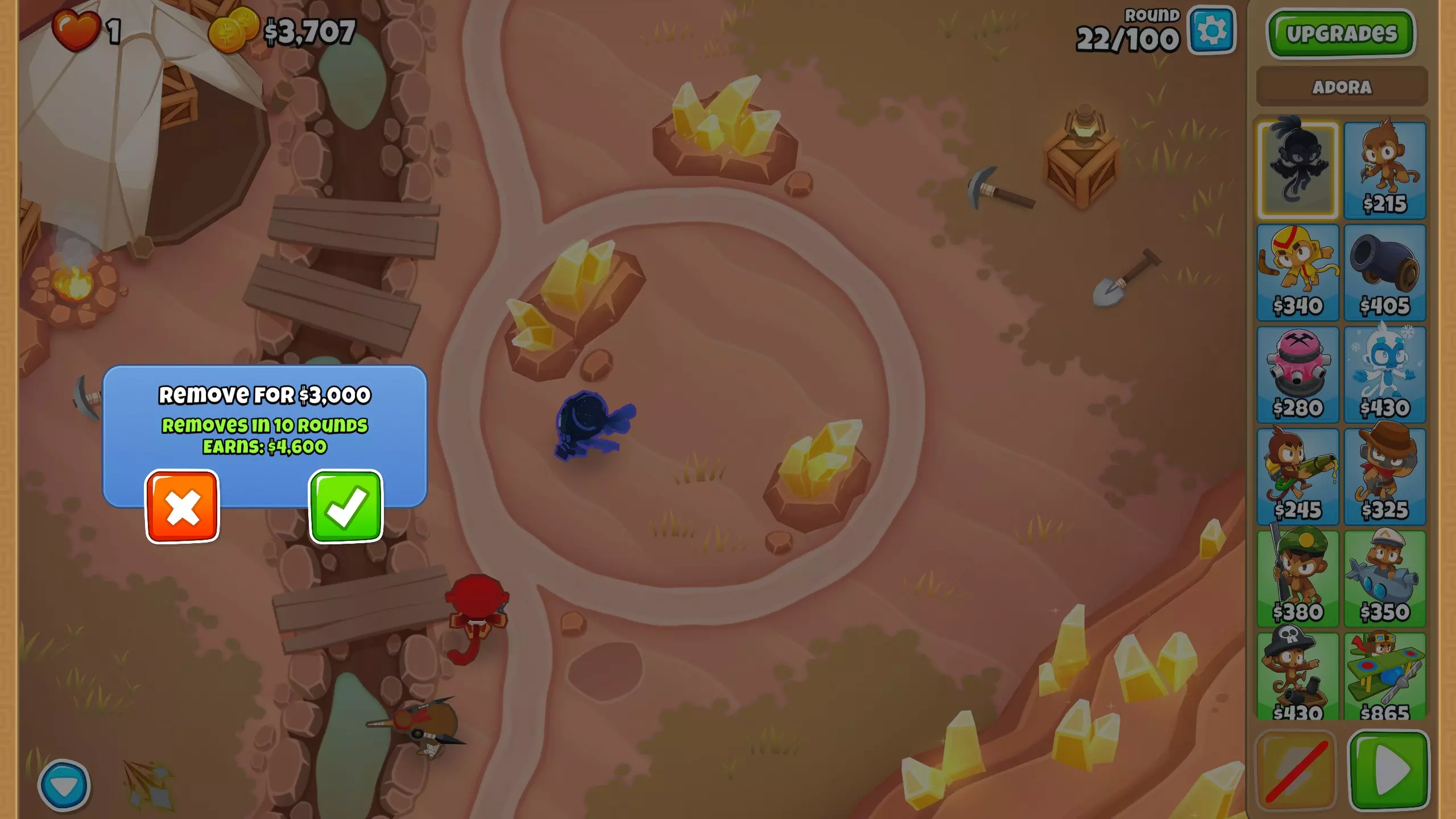 游戏中期 进入游戏中期后,我们必须巩固防御,同时还要加大投入,派遣猴子下矿开采珍贵的黄金。 第43波 现在开始开采第三处金矿。 这种投入会让你彻底没钱,所以如果在这些波次中有漏怪的风险,可以使用adora的3级技能。