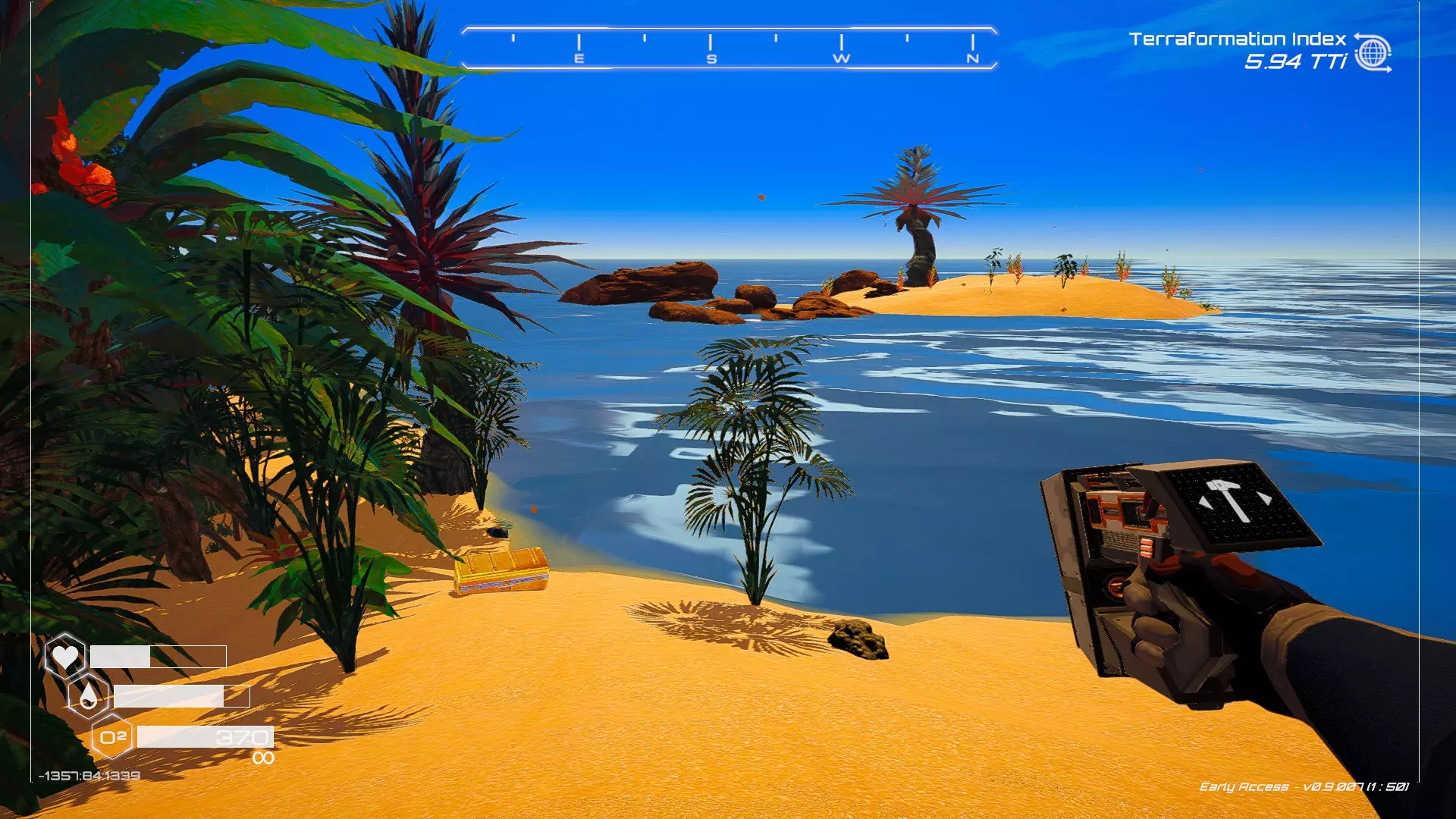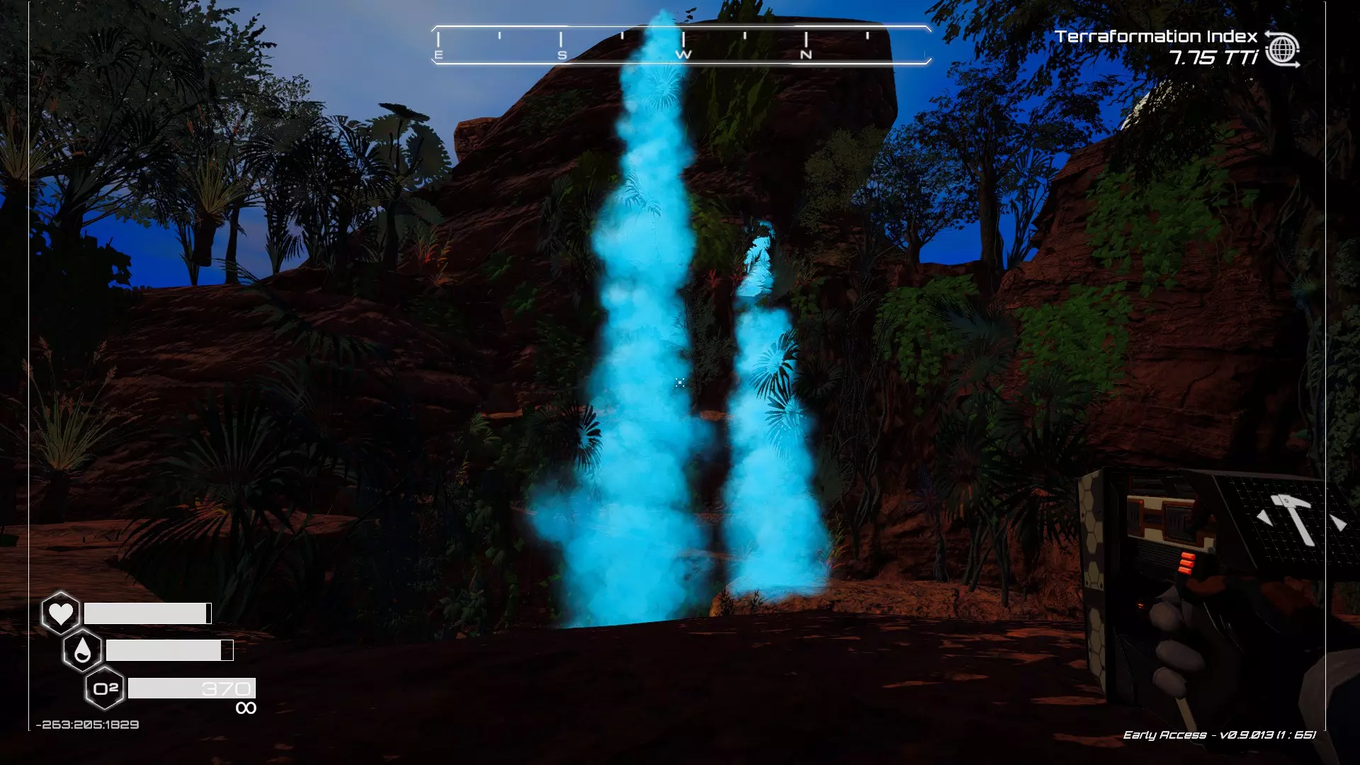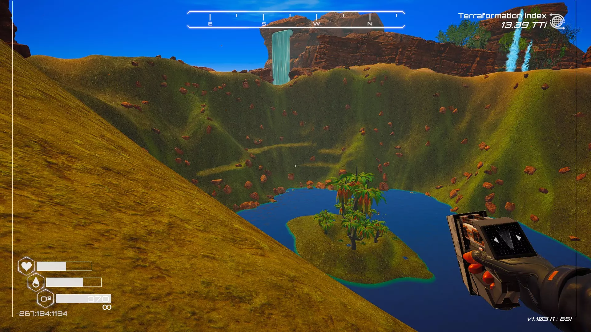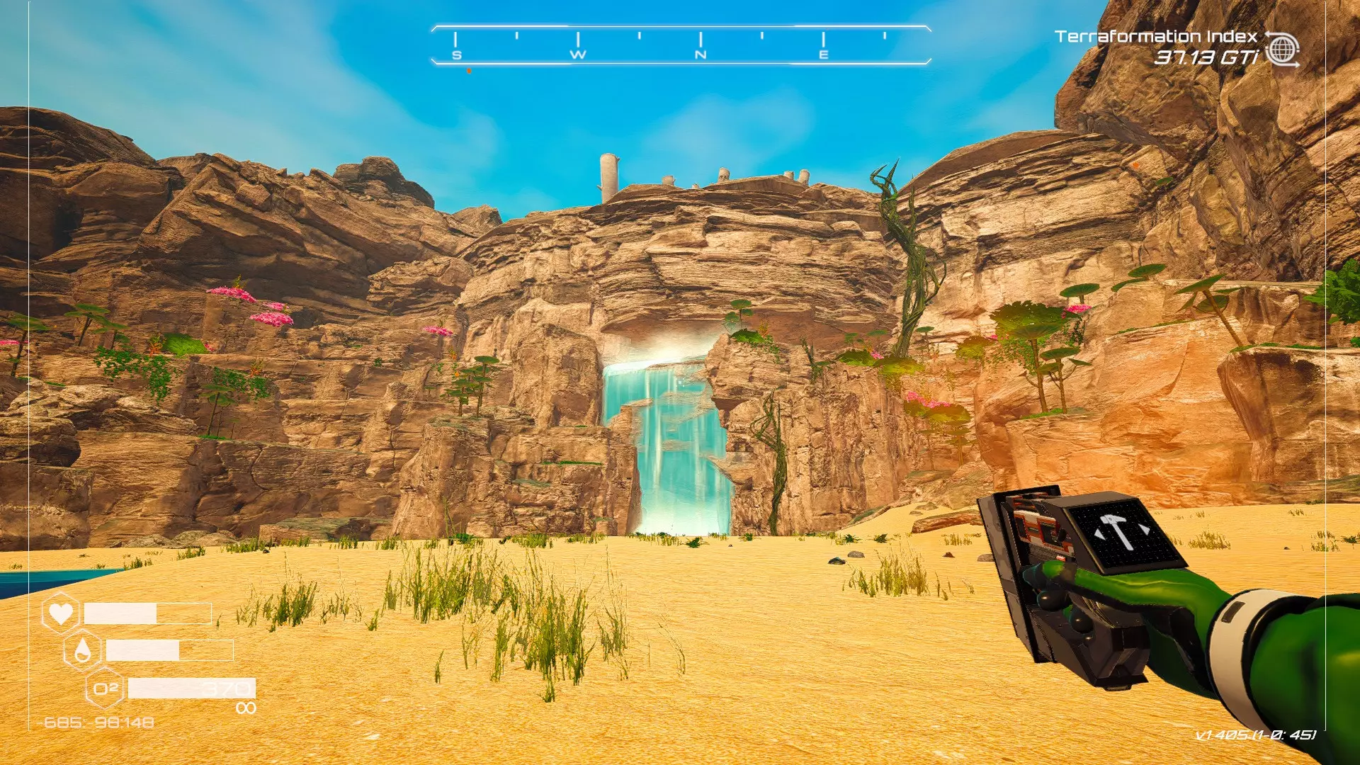 大致坐标:263:333:-692 4. 海滩瀑布宝箱 这个宝箱很容易找到,但需要达到一定的地形改造等级才能发现(我认为是可呼吸大气)。 达到所需的地形改造等级后,地图下方/南部区域的巨大沙尘暴会消散,最终在最低点的悬崖处会有瀑布流下,汇入海滩区域。