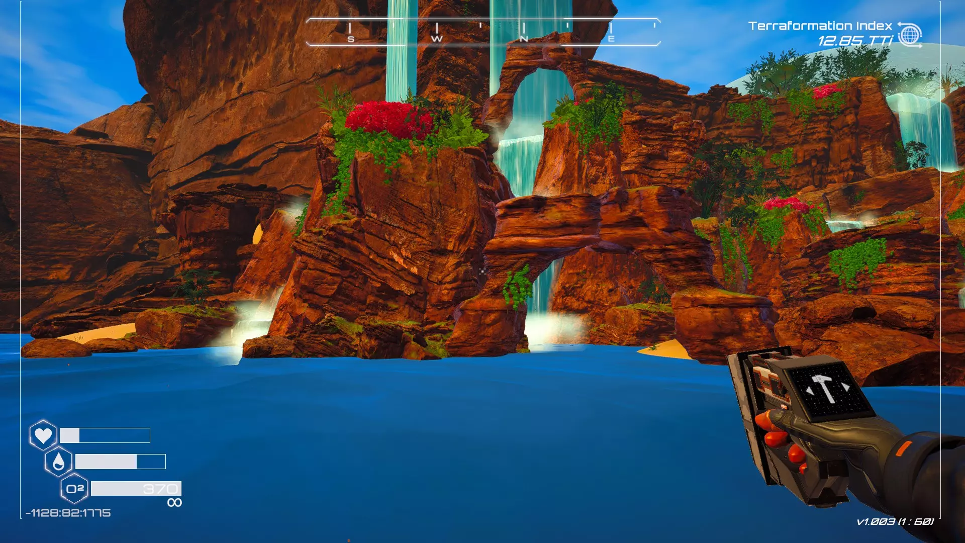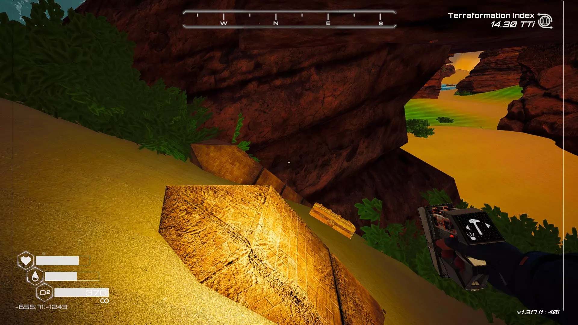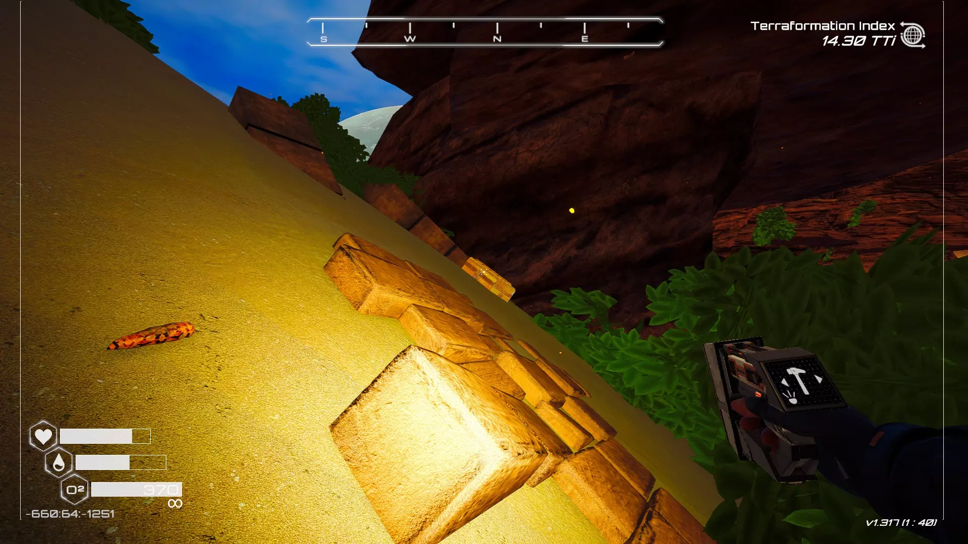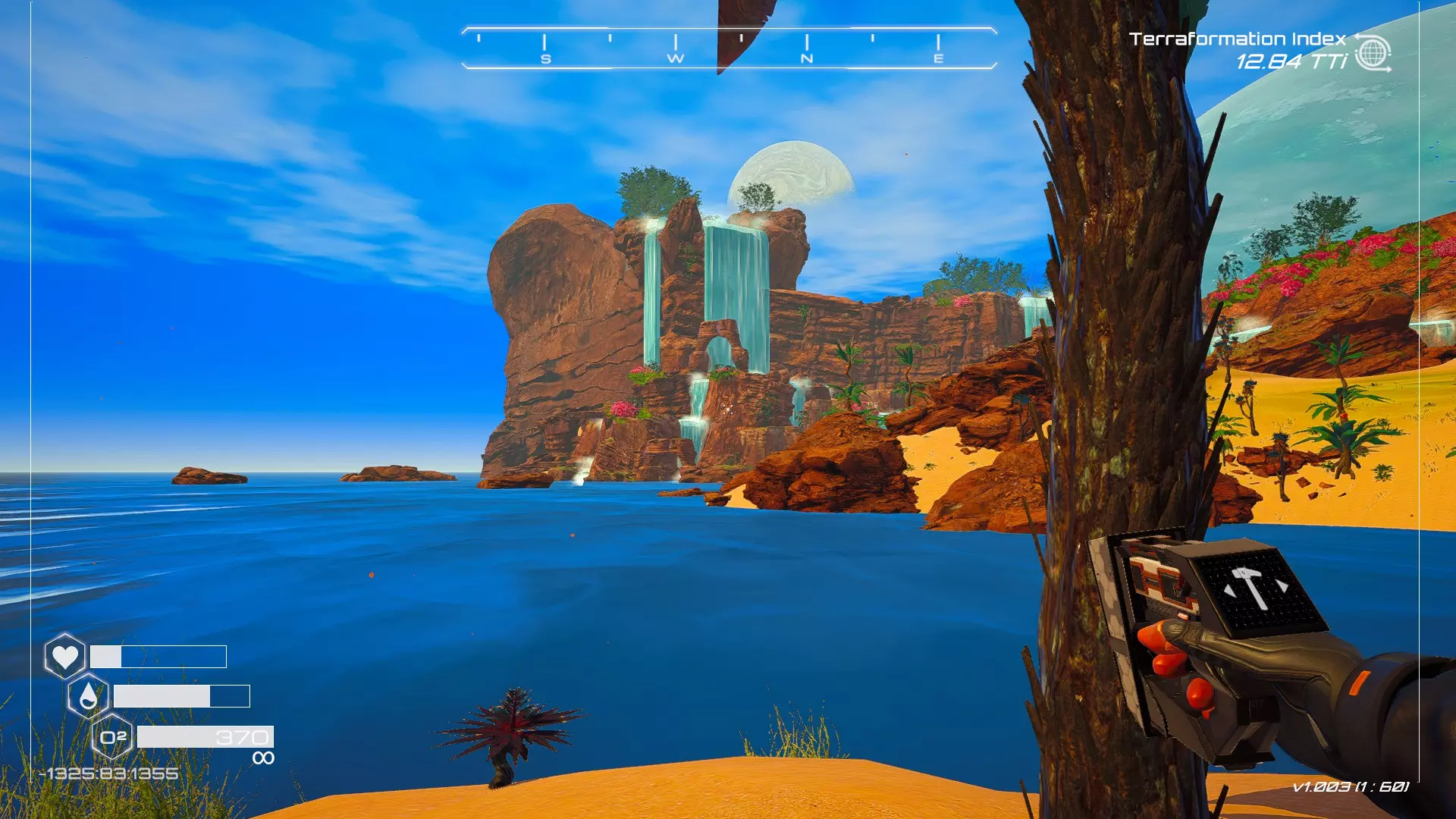 大致坐标:263:333:-692 4. 海滩瀑布宝箱 这个宝箱很容易找到,但需要达到一定的地形改造等级才能发现(我认为是可呼吸大气)。 达到所需的地形改造等级后,地图下方/南部区域的巨大沙尘暴会消散,最终在最低点的悬崖处会有瀑布流下,汇入海滩区域。
