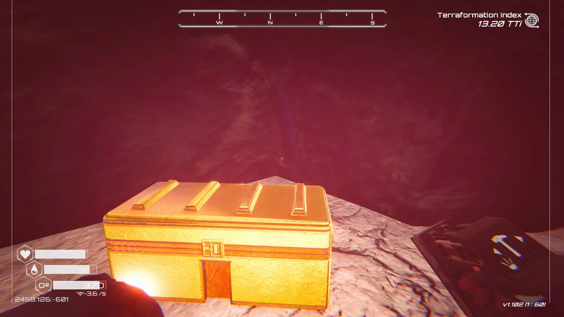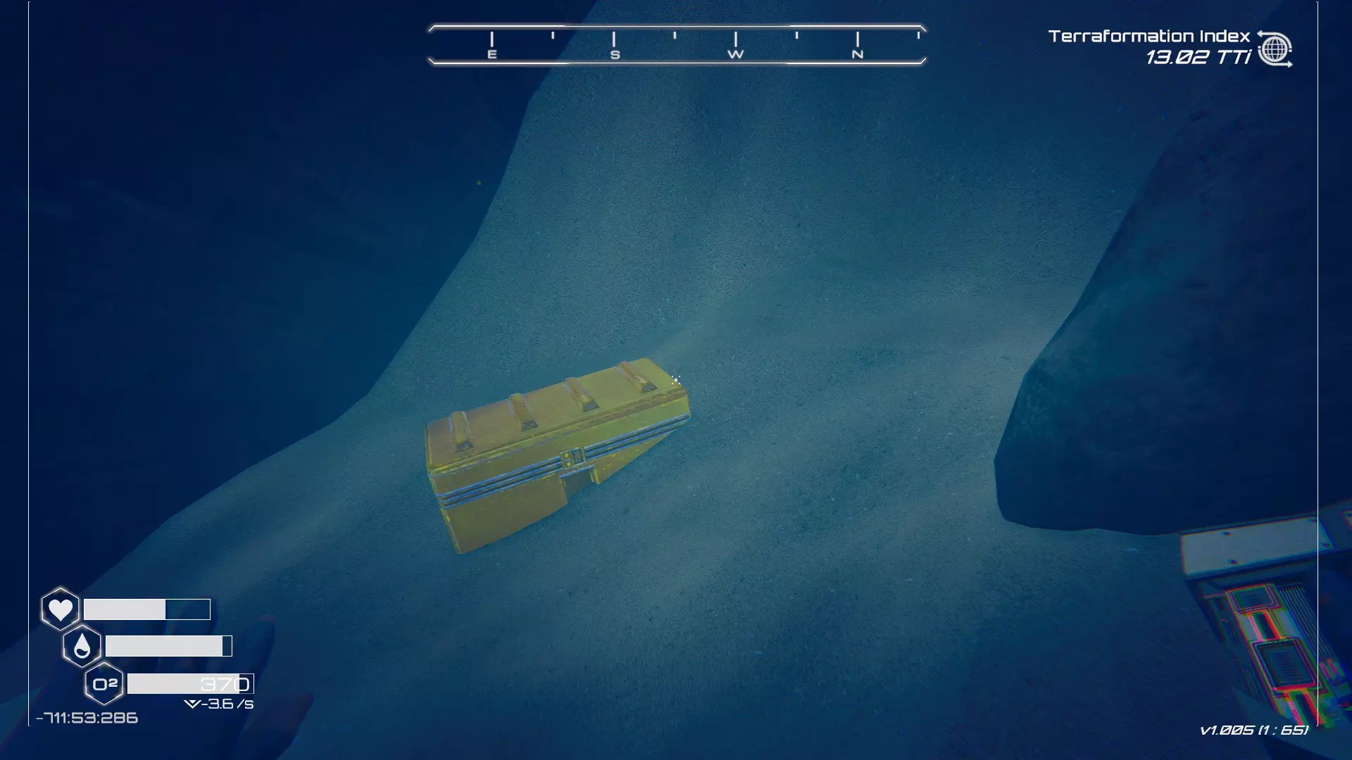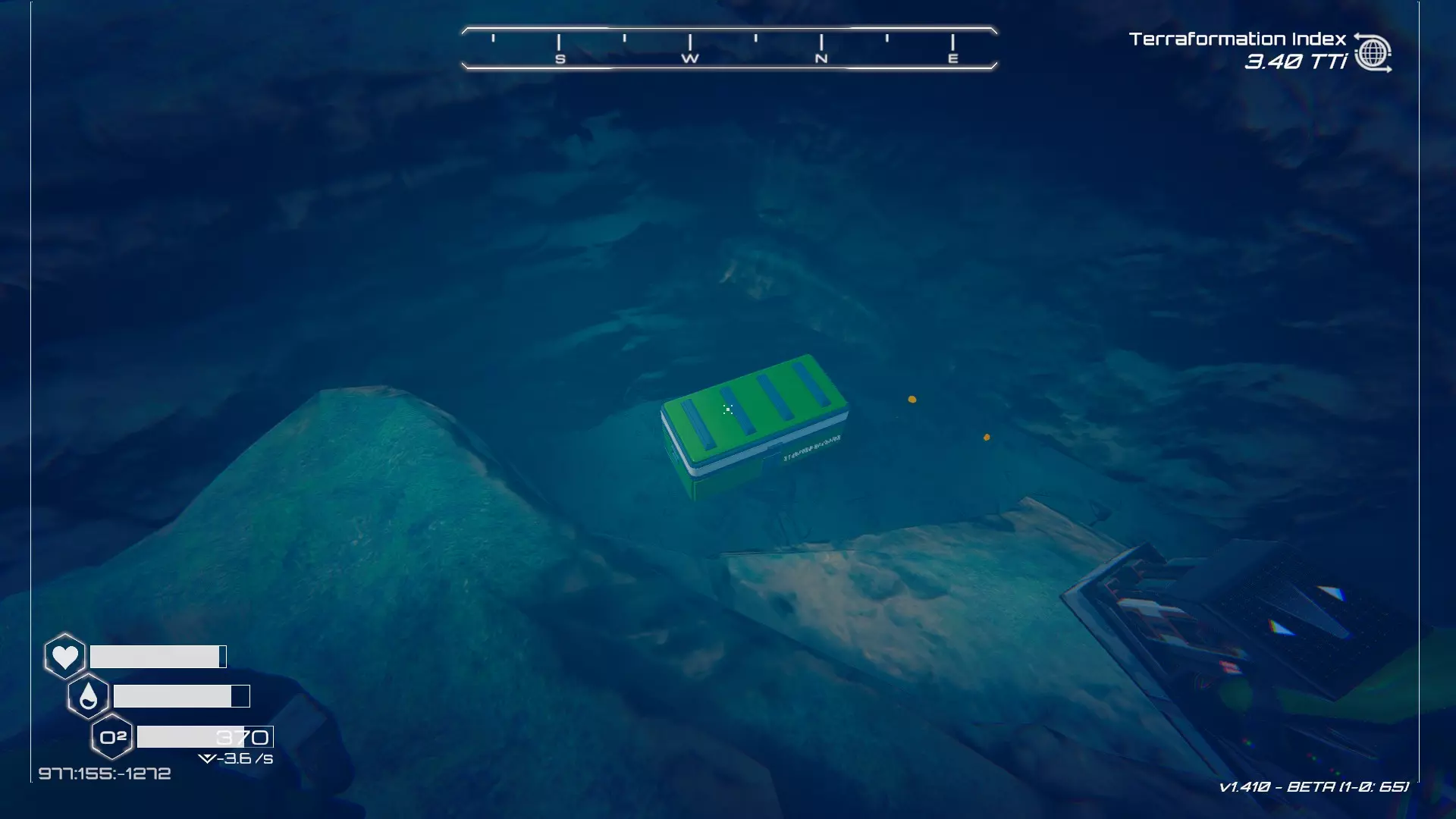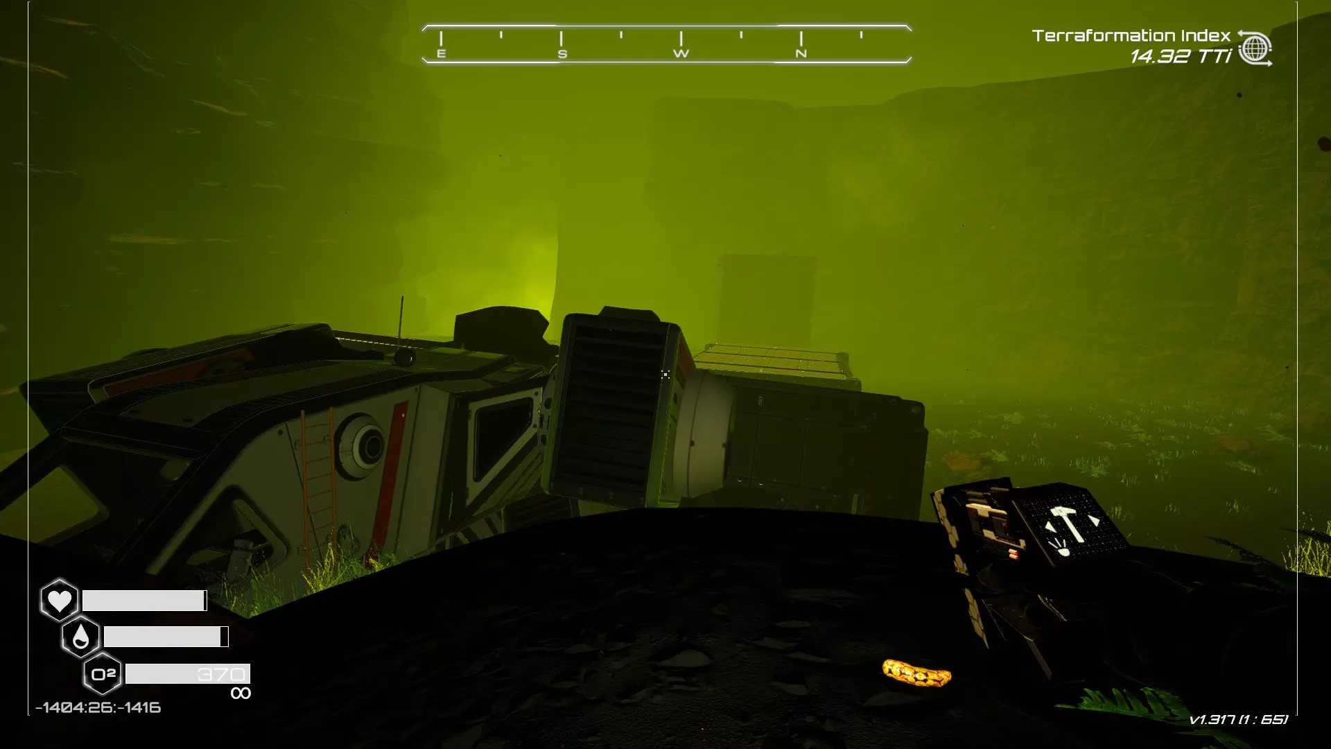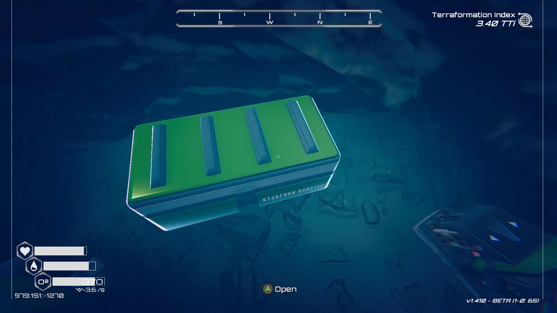 如果你朝北看向宝箱,能在背景中看到登陆舱。 大致坐标:258:27:485 2. 山丘上的坠毁飞船宝箱 从登陆舱位置向西看,你会看到这艘坠毁的飞船在山丘上。