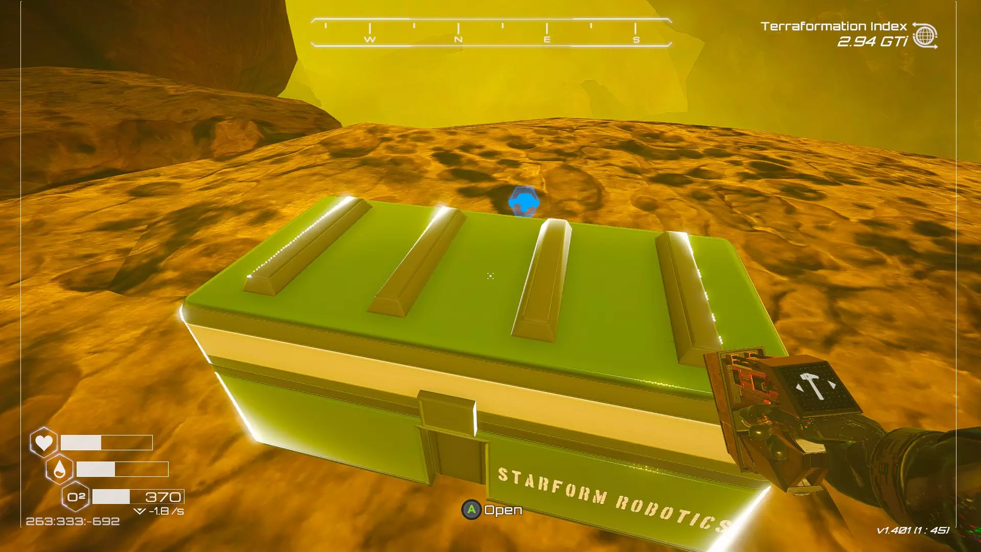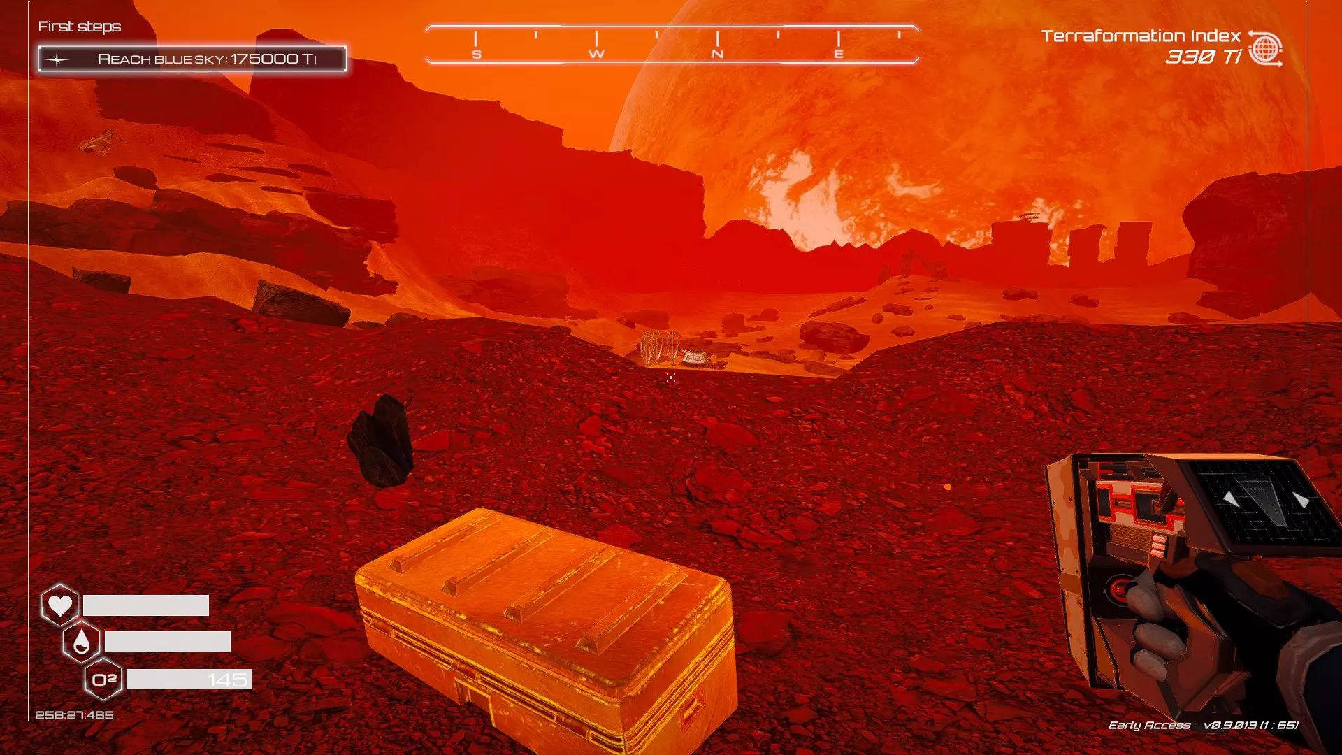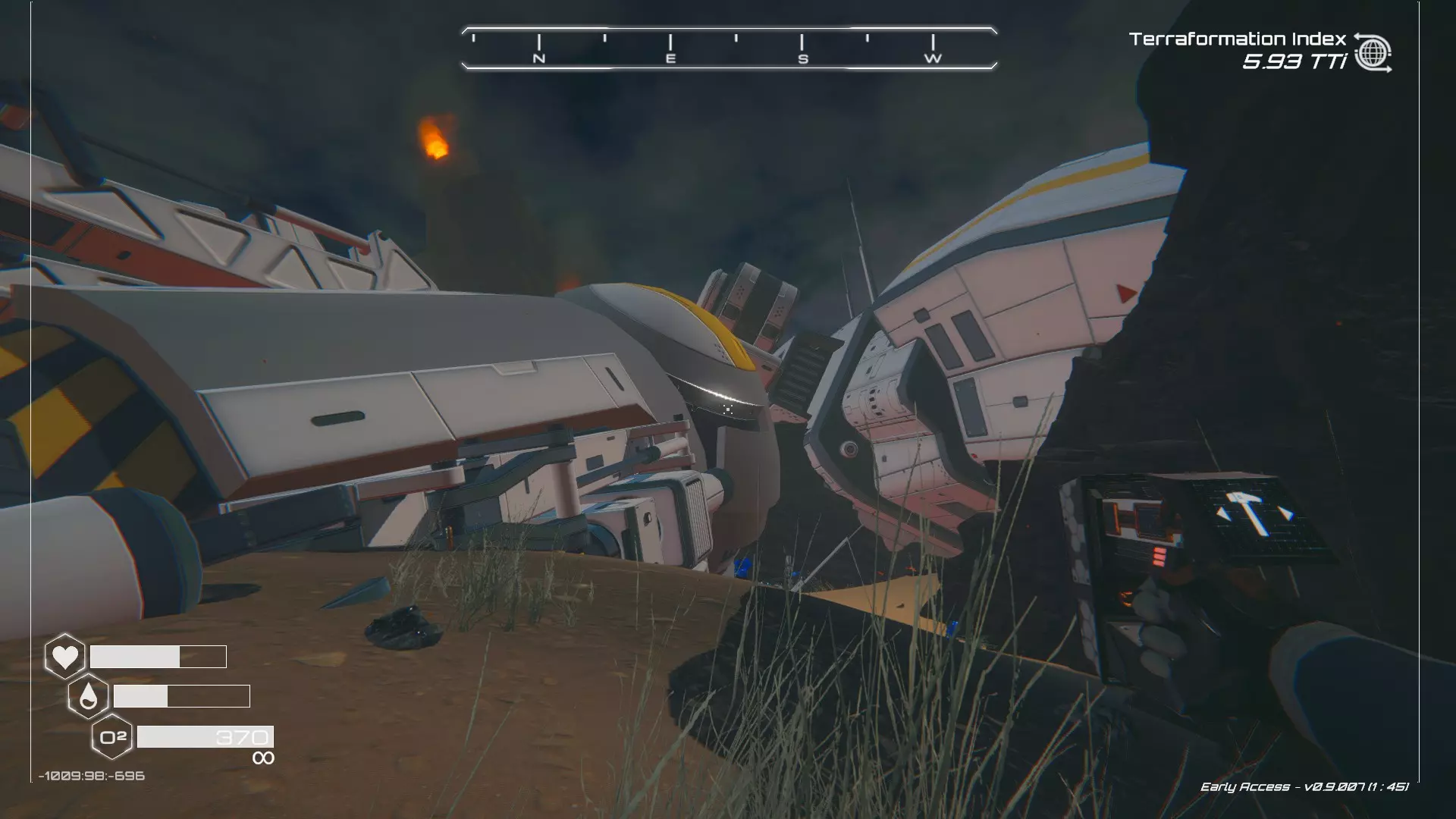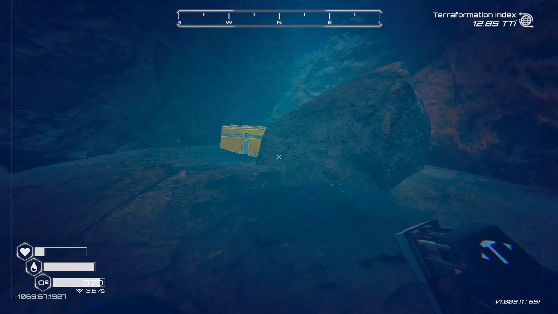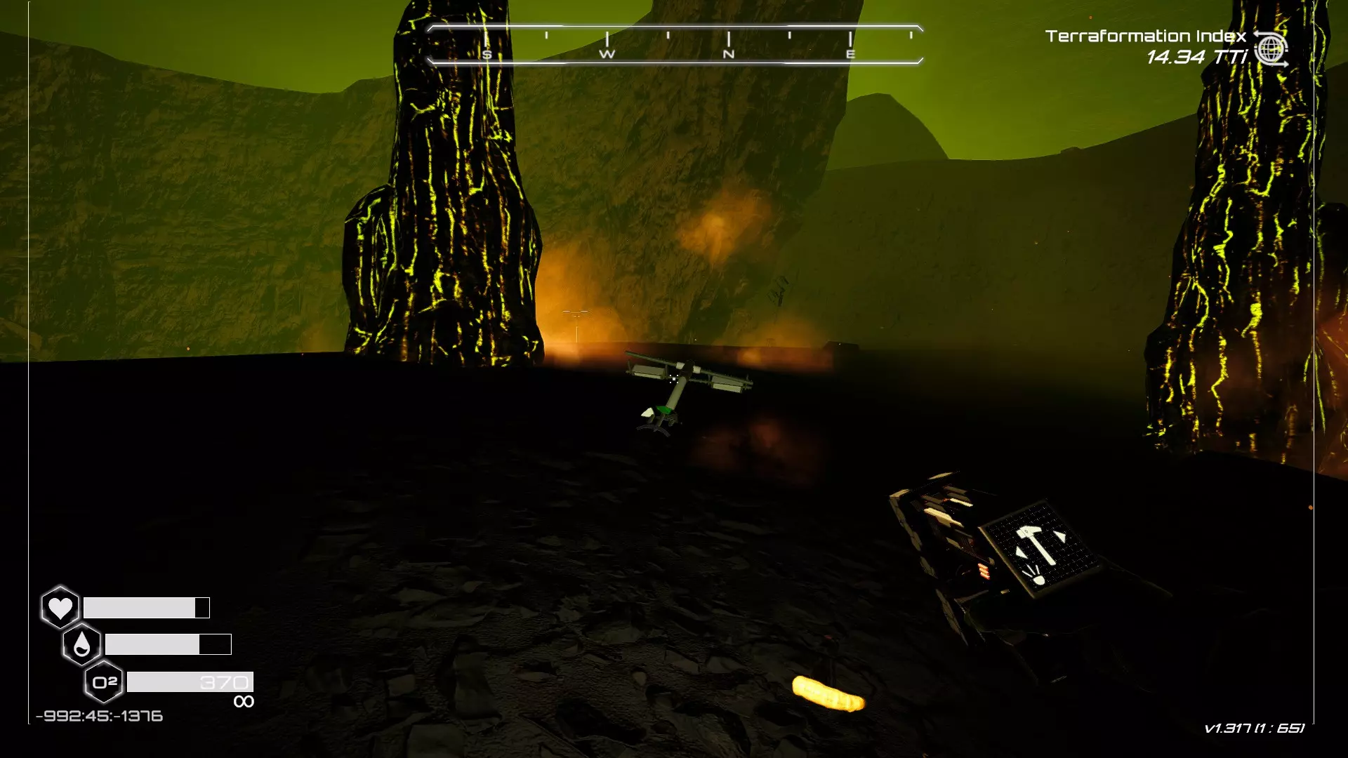 如果你朝北看向宝箱,能在背景中看到登陆舱。 大致坐标:258:27:485 2. 山丘上的坠毁飞船宝箱 从登陆舱位置向西看,你会看到这艘坠毁的飞船在山丘上。