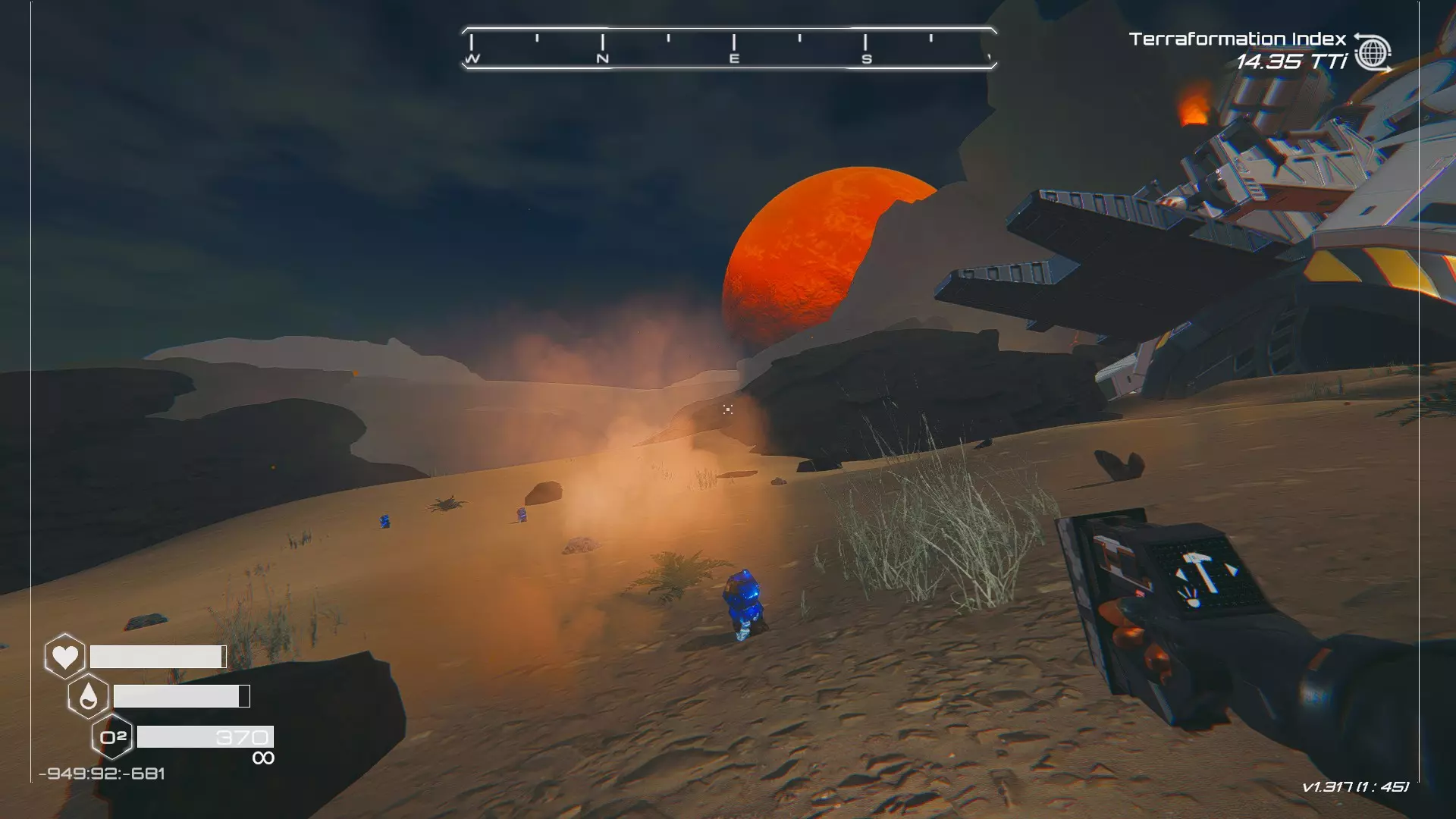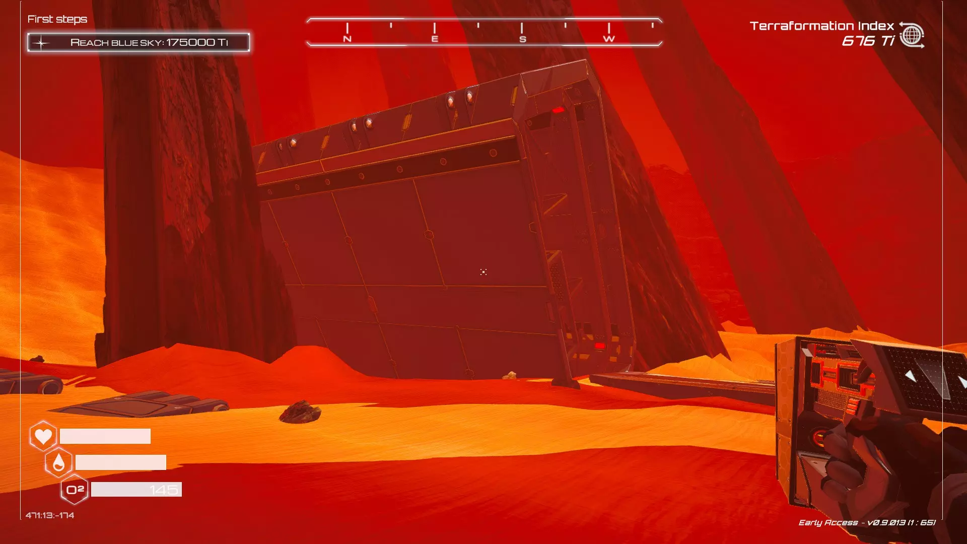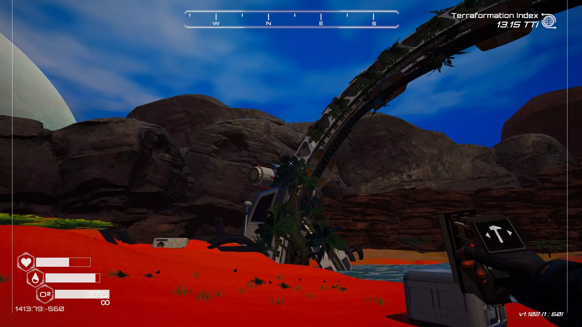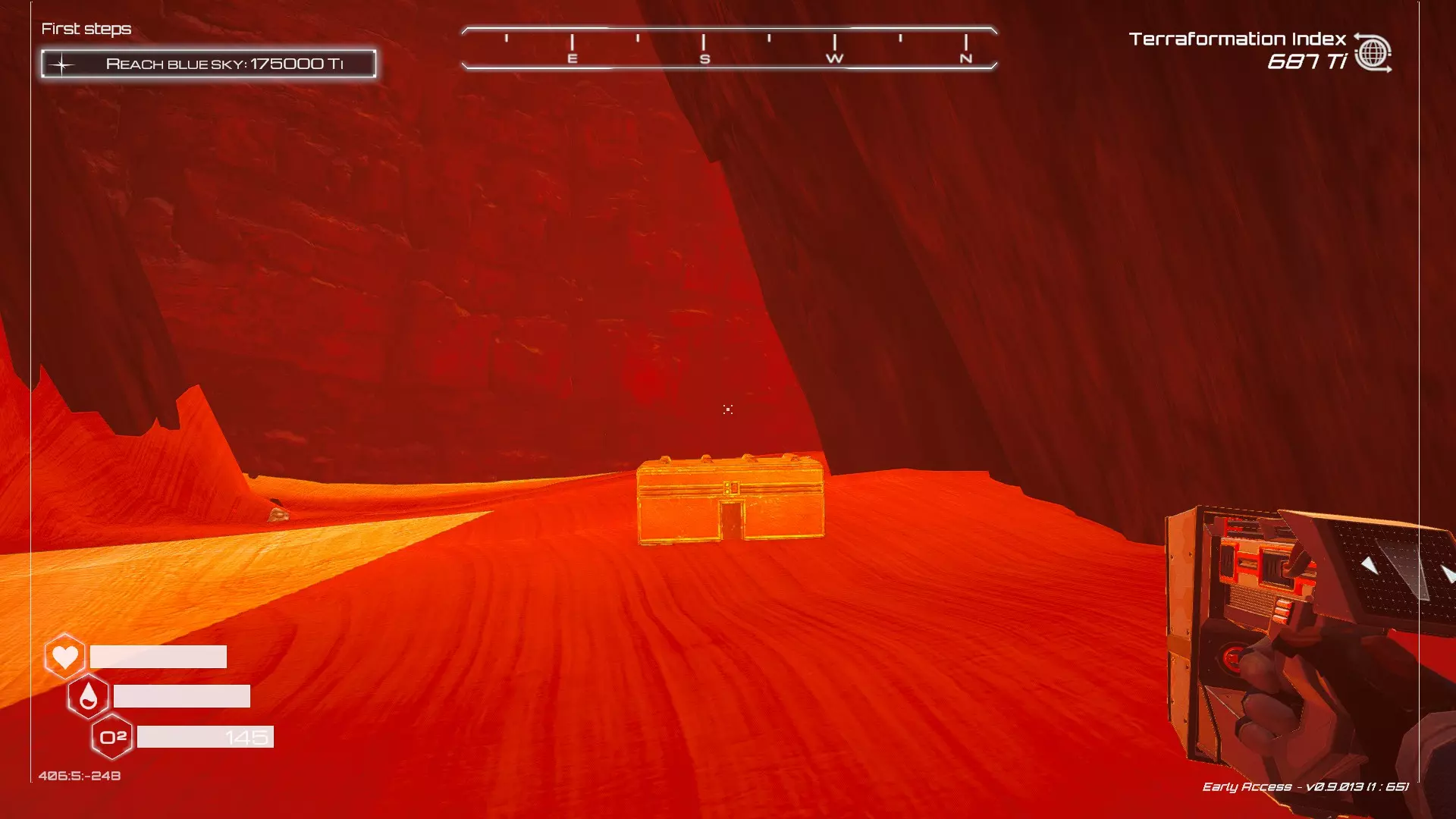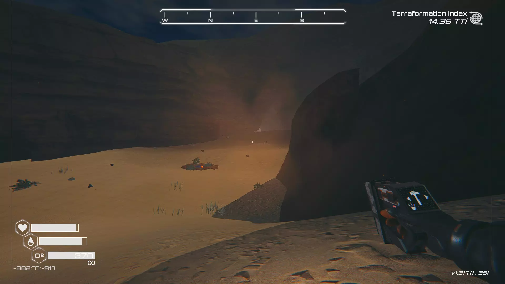 如果你朝北看向宝箱,能在背景中看到登陆舱。 大致坐标:258:27:485 2. 山丘上的坠毁飞船宝箱 从登陆舱位置向西看,你会看到这艘坠毁的飞船在山丘上。