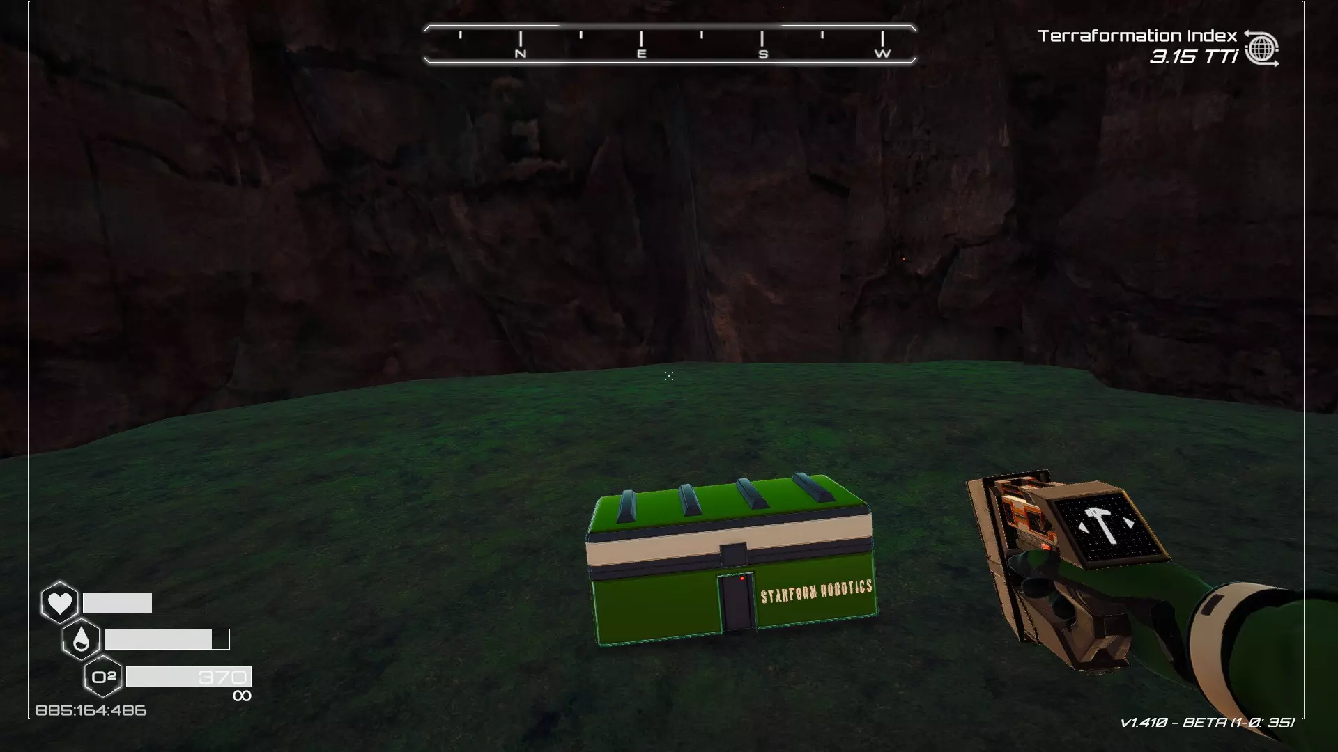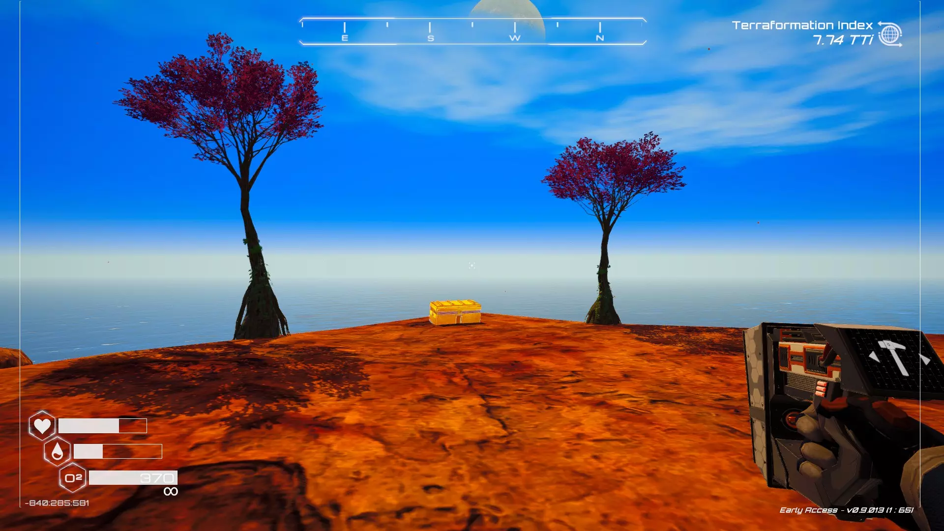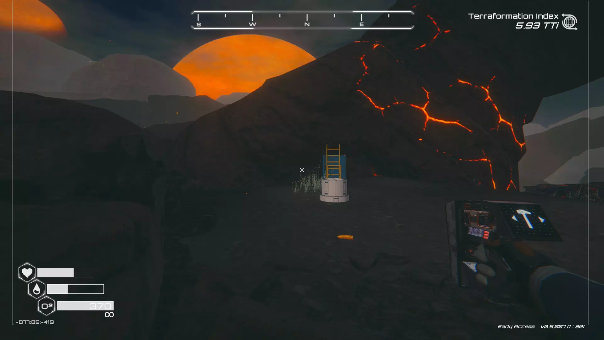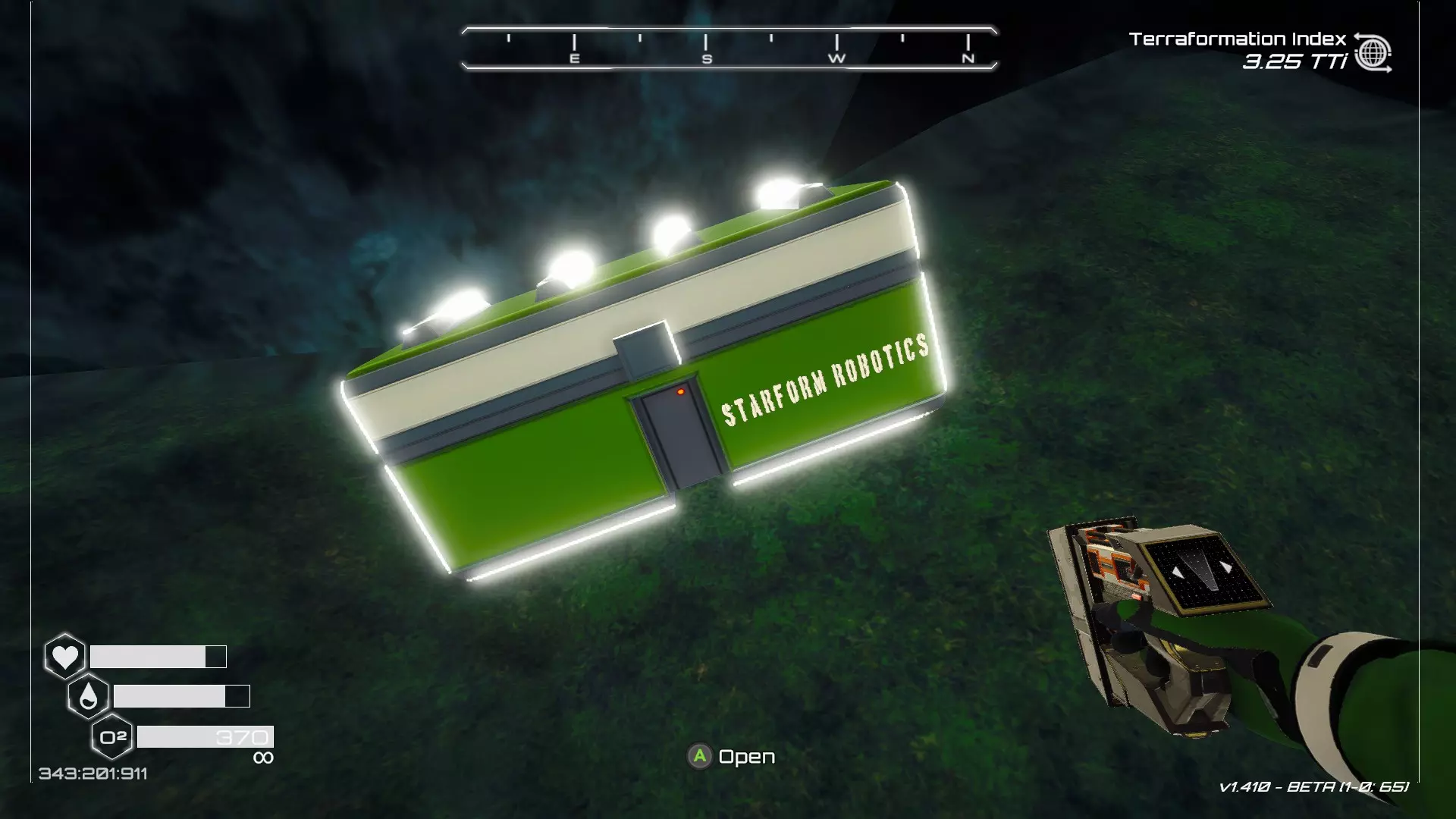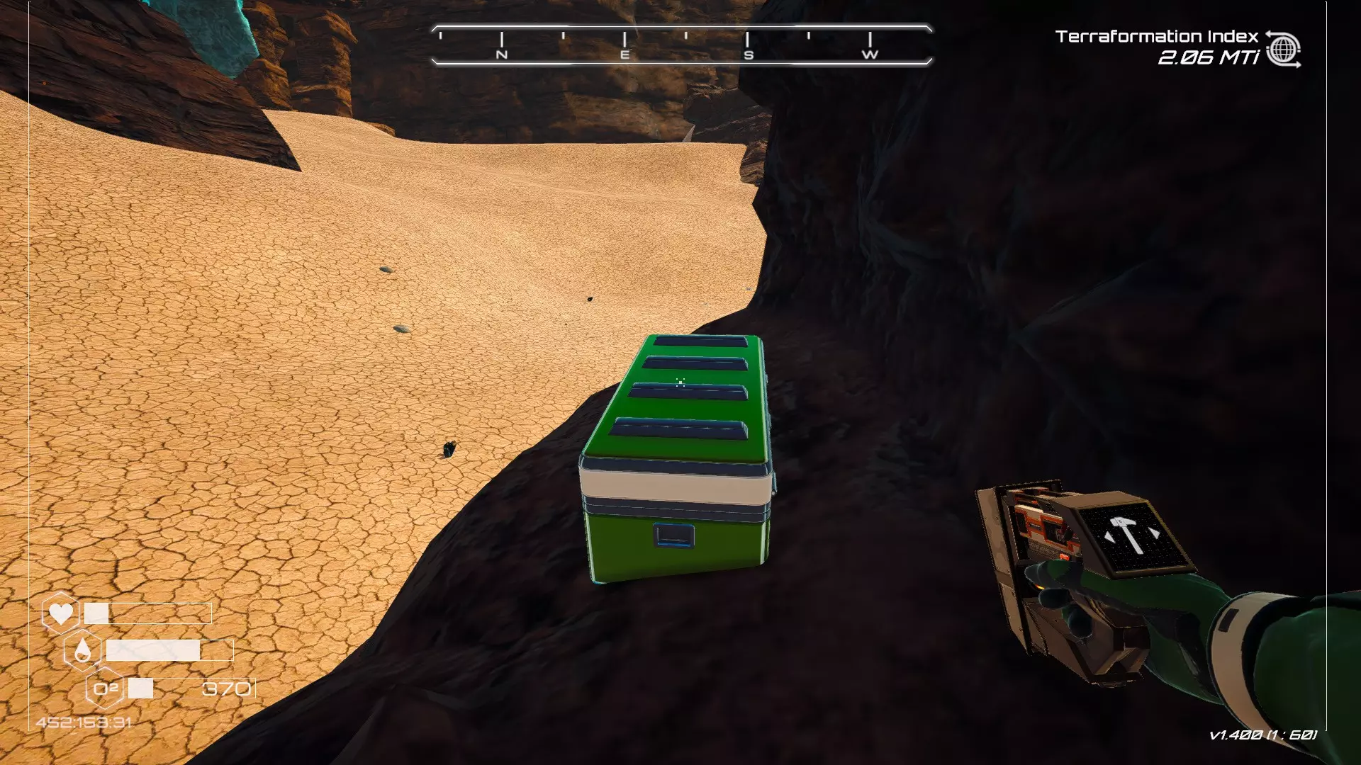 如果你朝北看向宝箱,能在背景中看到登陆舱。 大致坐标:258:27:485 2. 山丘上的坠毁飞船宝箱 从登陆舱位置向西看,你会看到这艘坠毁的飞船在山丘上。