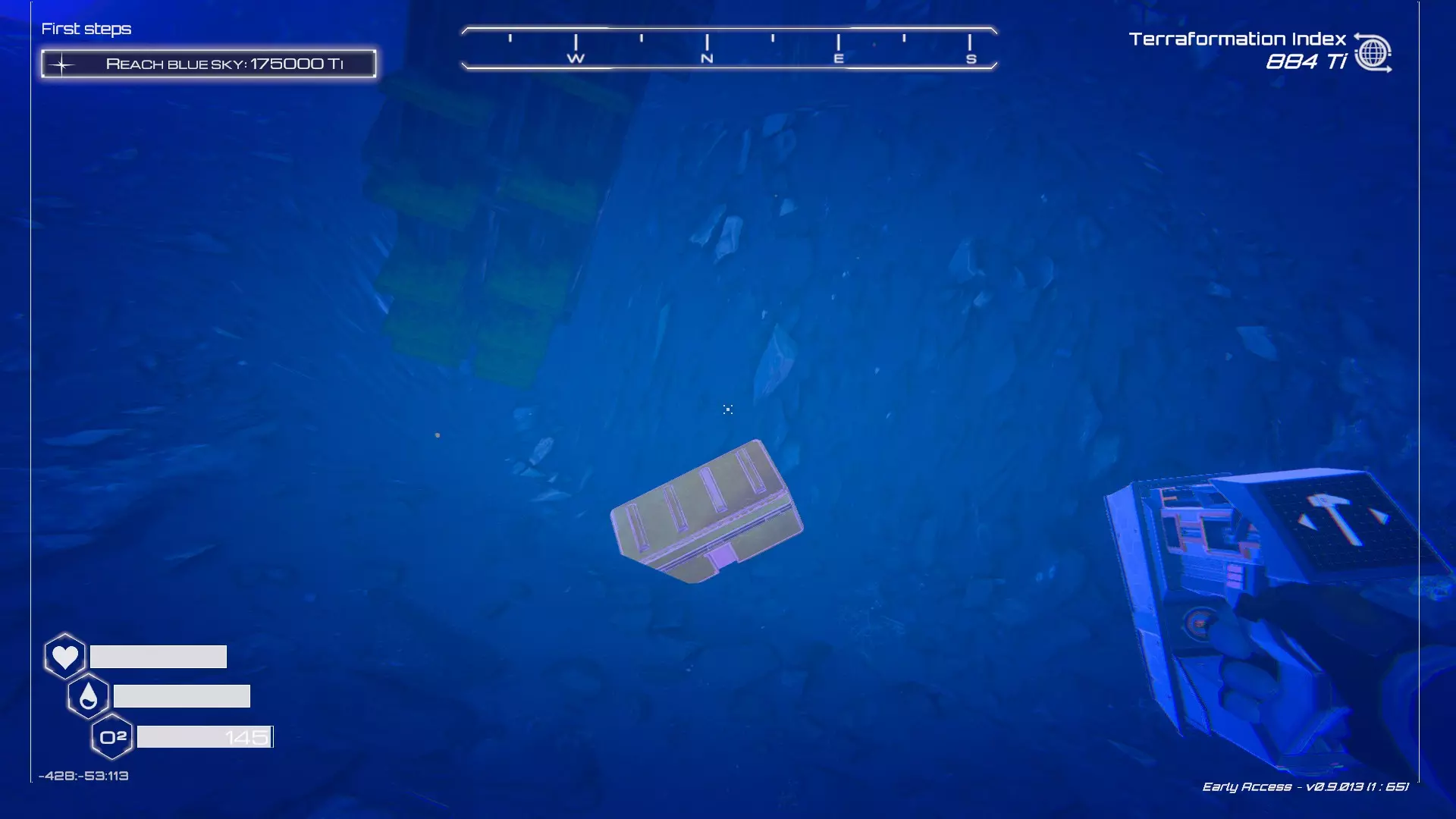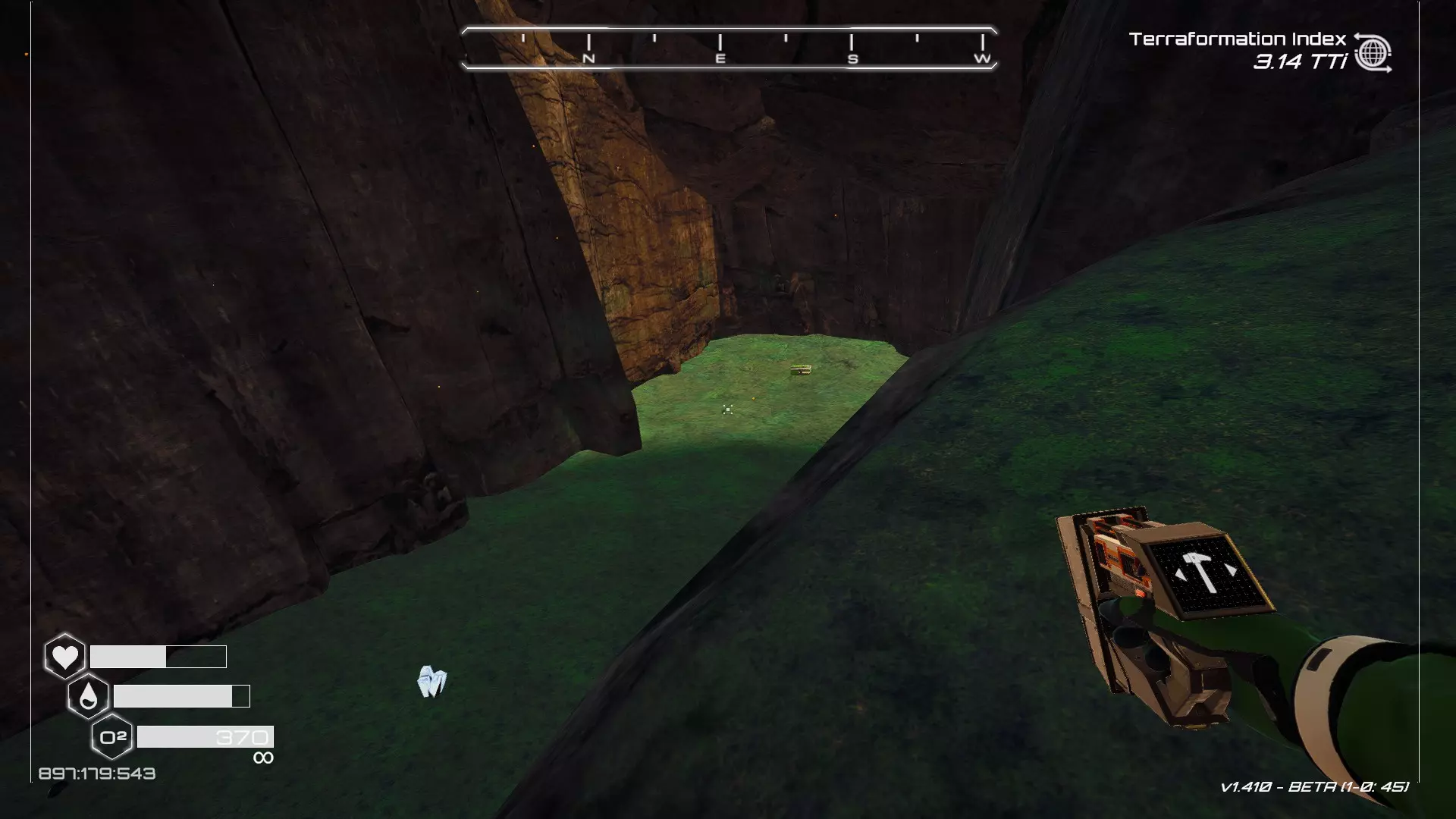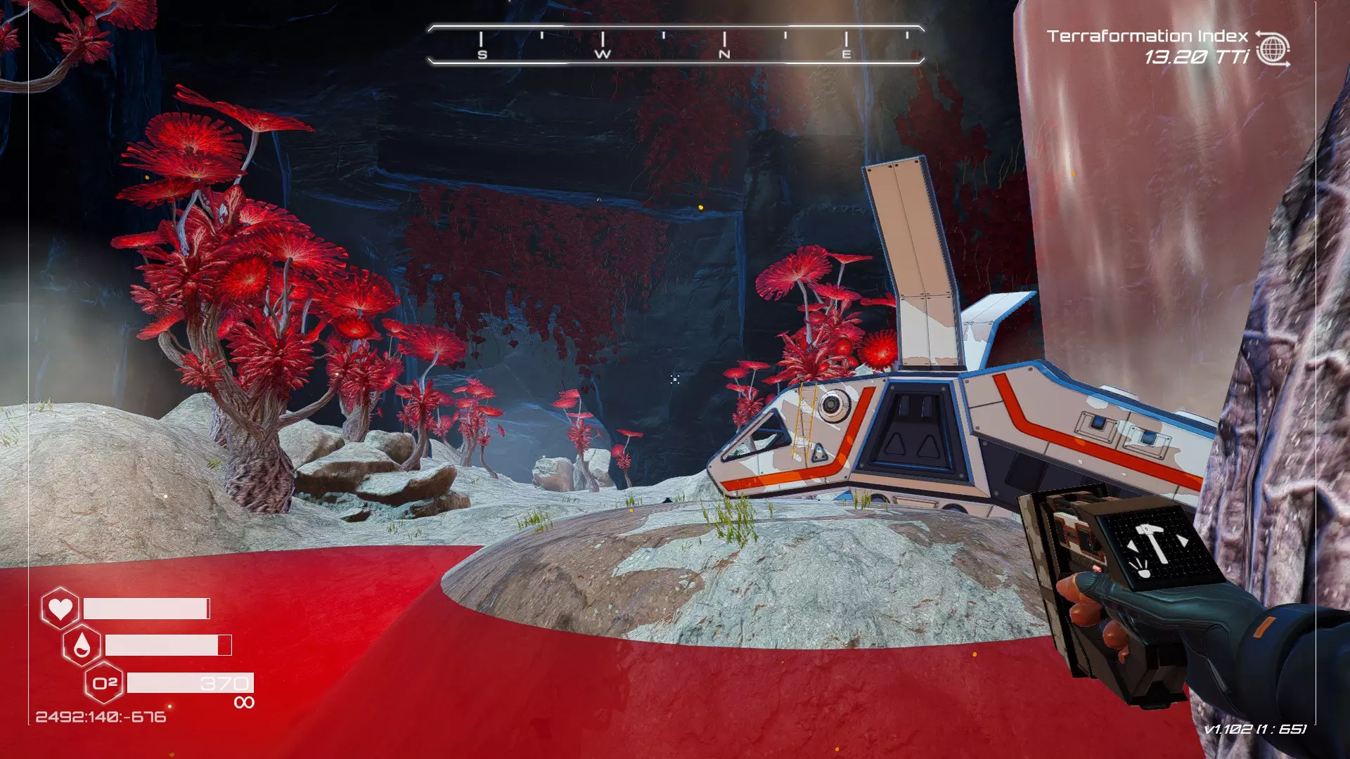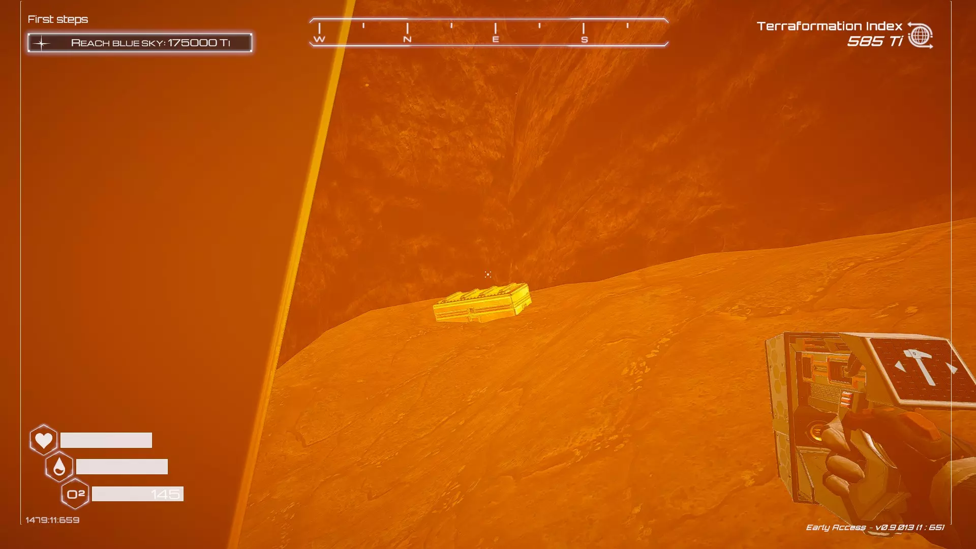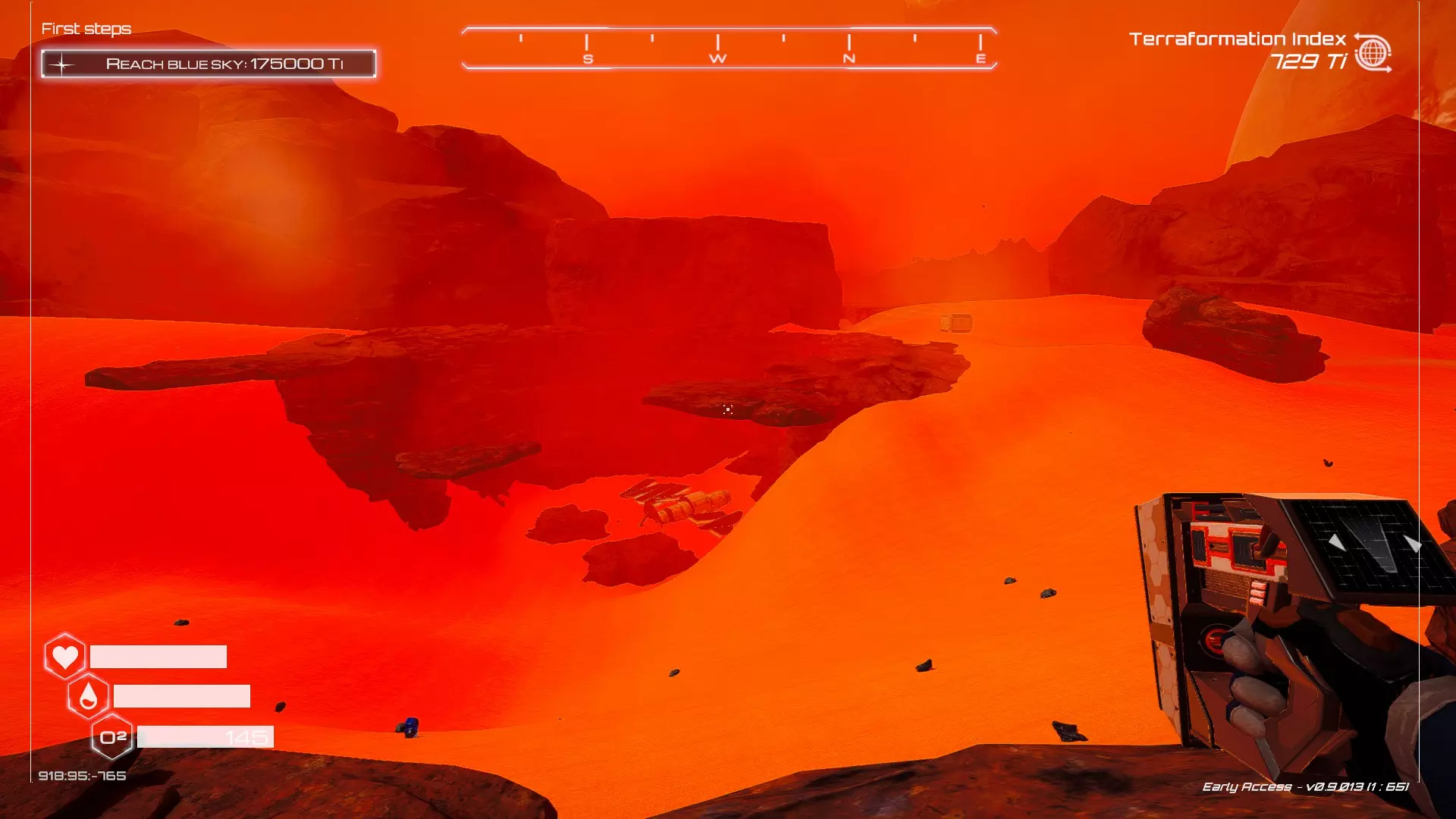 如果你朝北看向宝箱,能在背景中看到登陆舱。 大致坐标:258:27:485 2. 山丘上的坠毁飞船宝箱 从登陆舱位置向西看,你会看到这艘坠毁的飞船在山丘上。