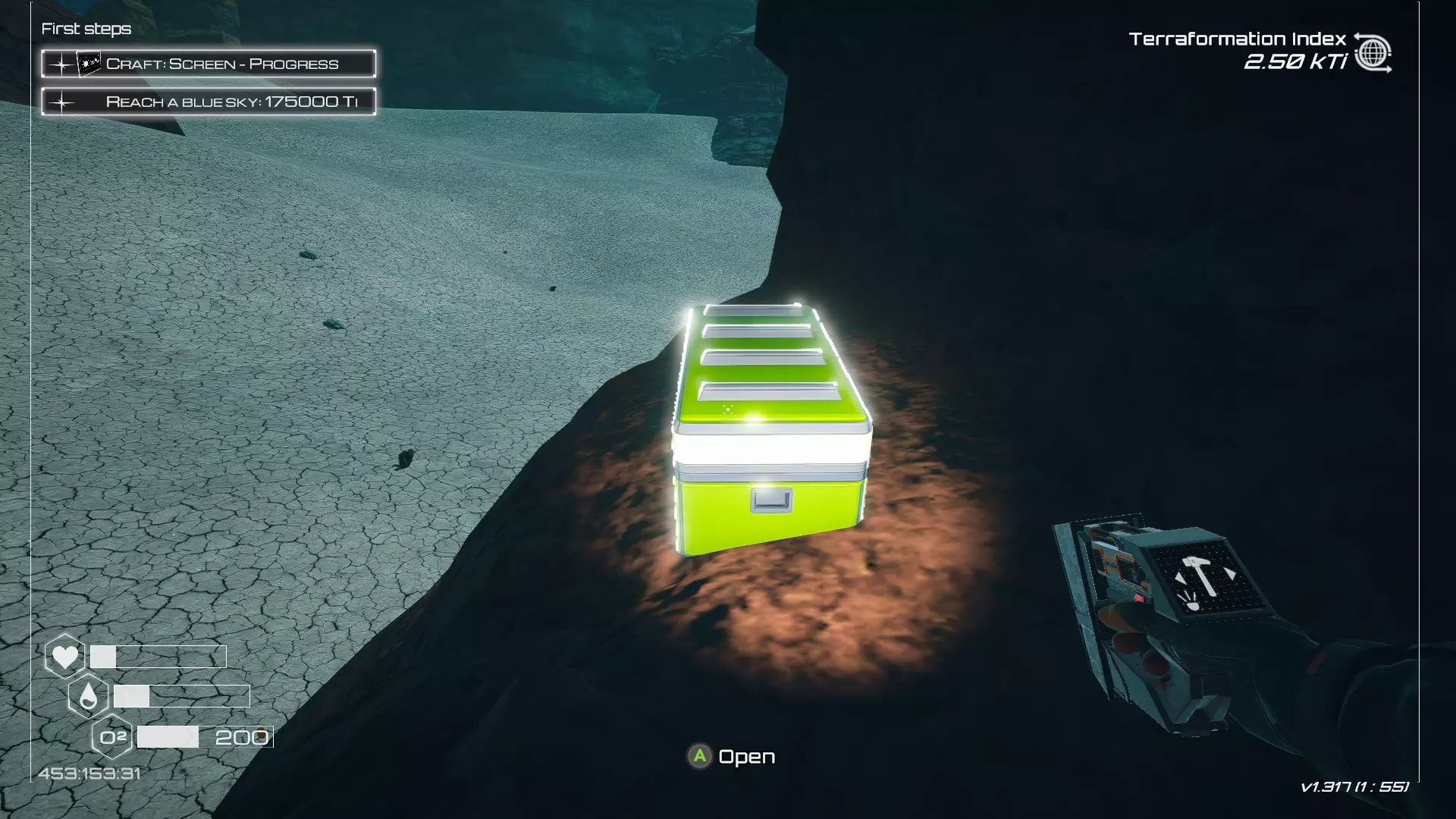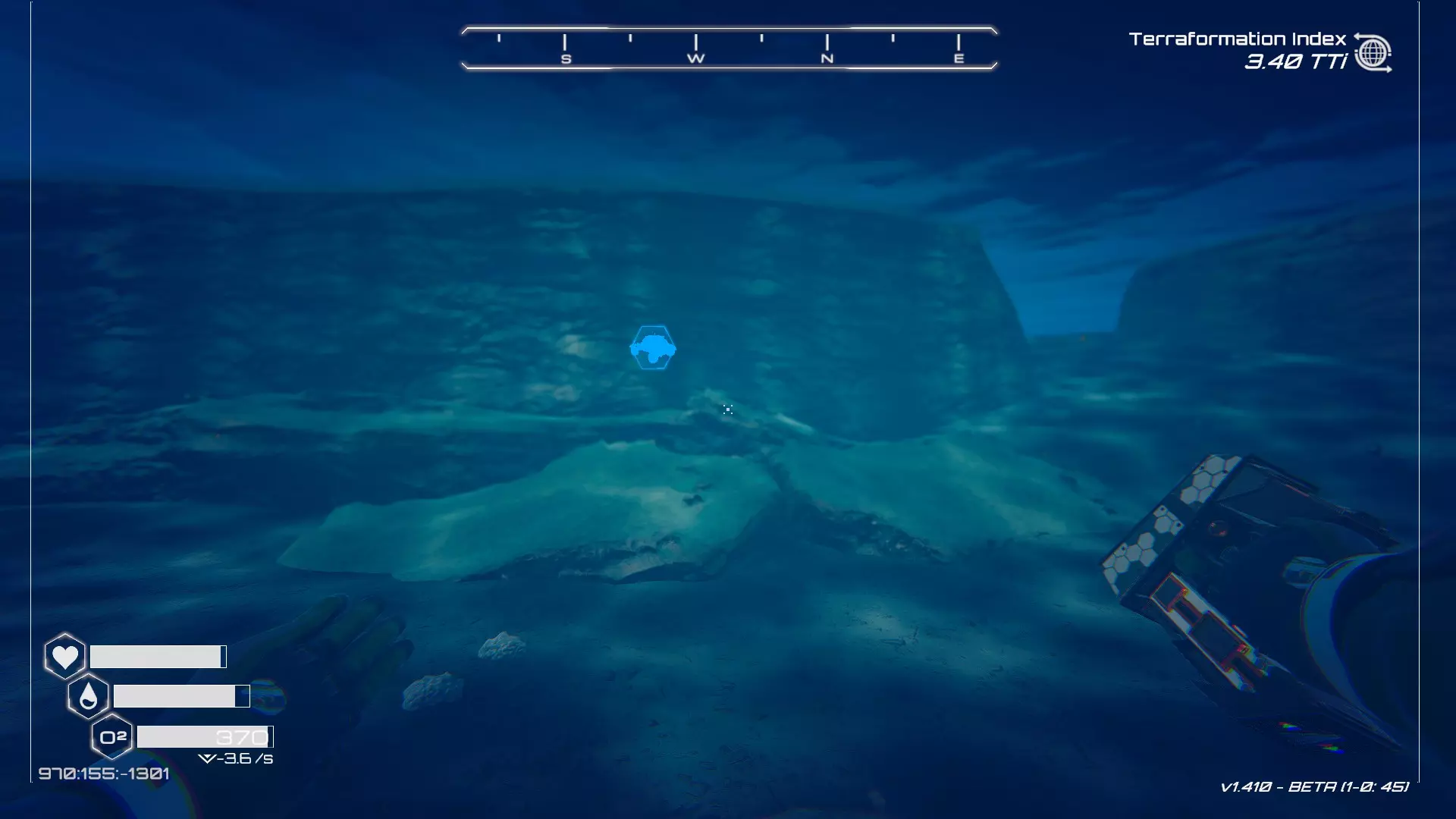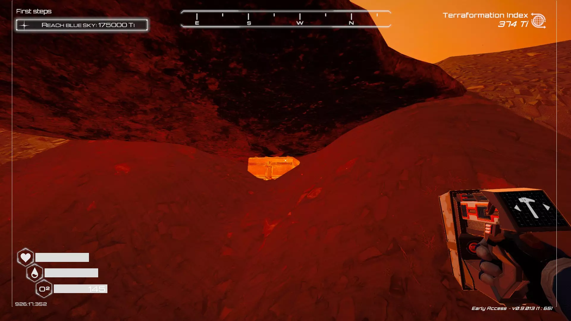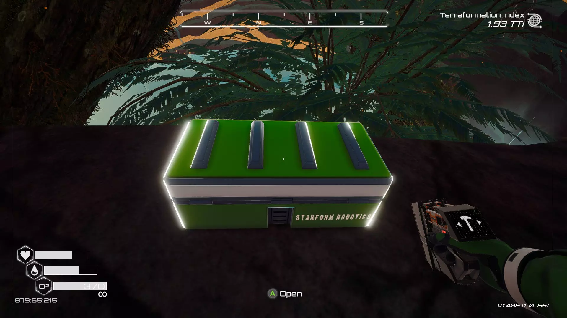 如果你朝北看向宝箱,能在背景中看到登陆舱。 大致坐标:258:27:485 2. 山丘上的坠毁飞船宝箱 从登陆舱位置向西看,你会看到这艘坠毁的飞船在山丘上。