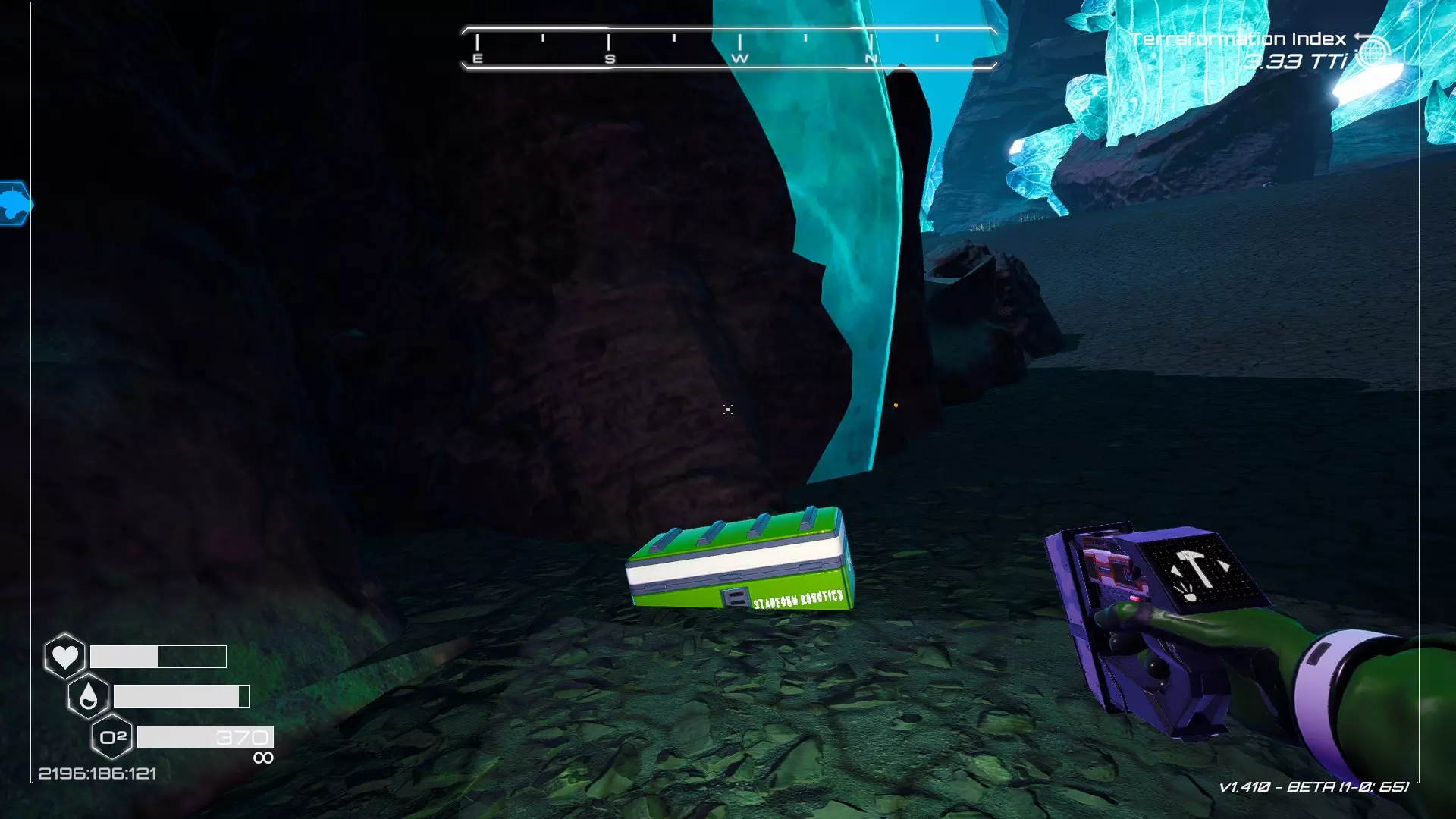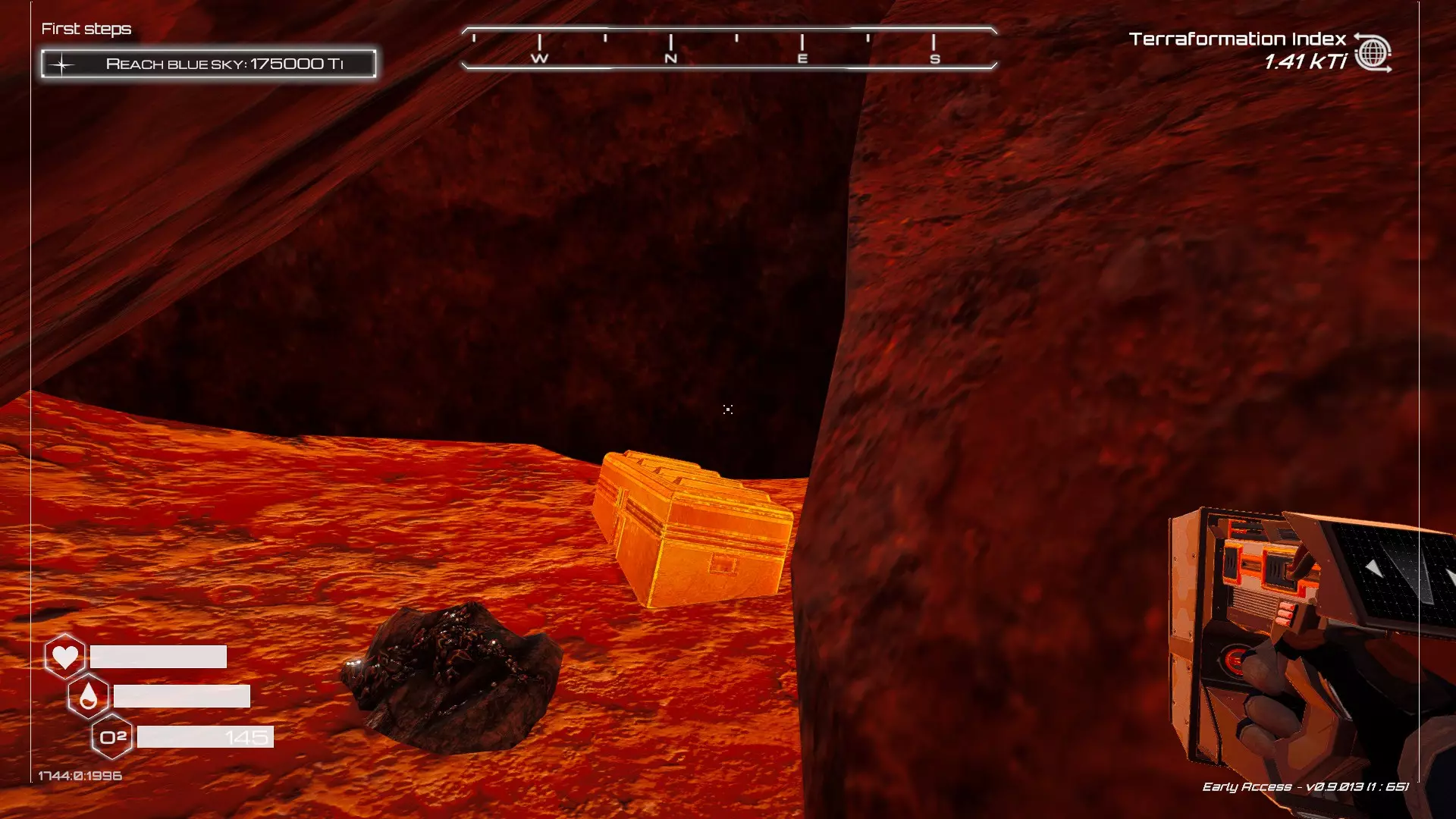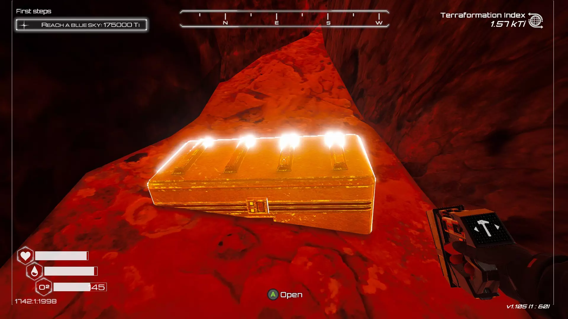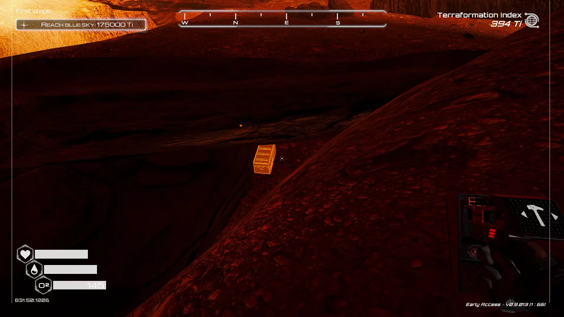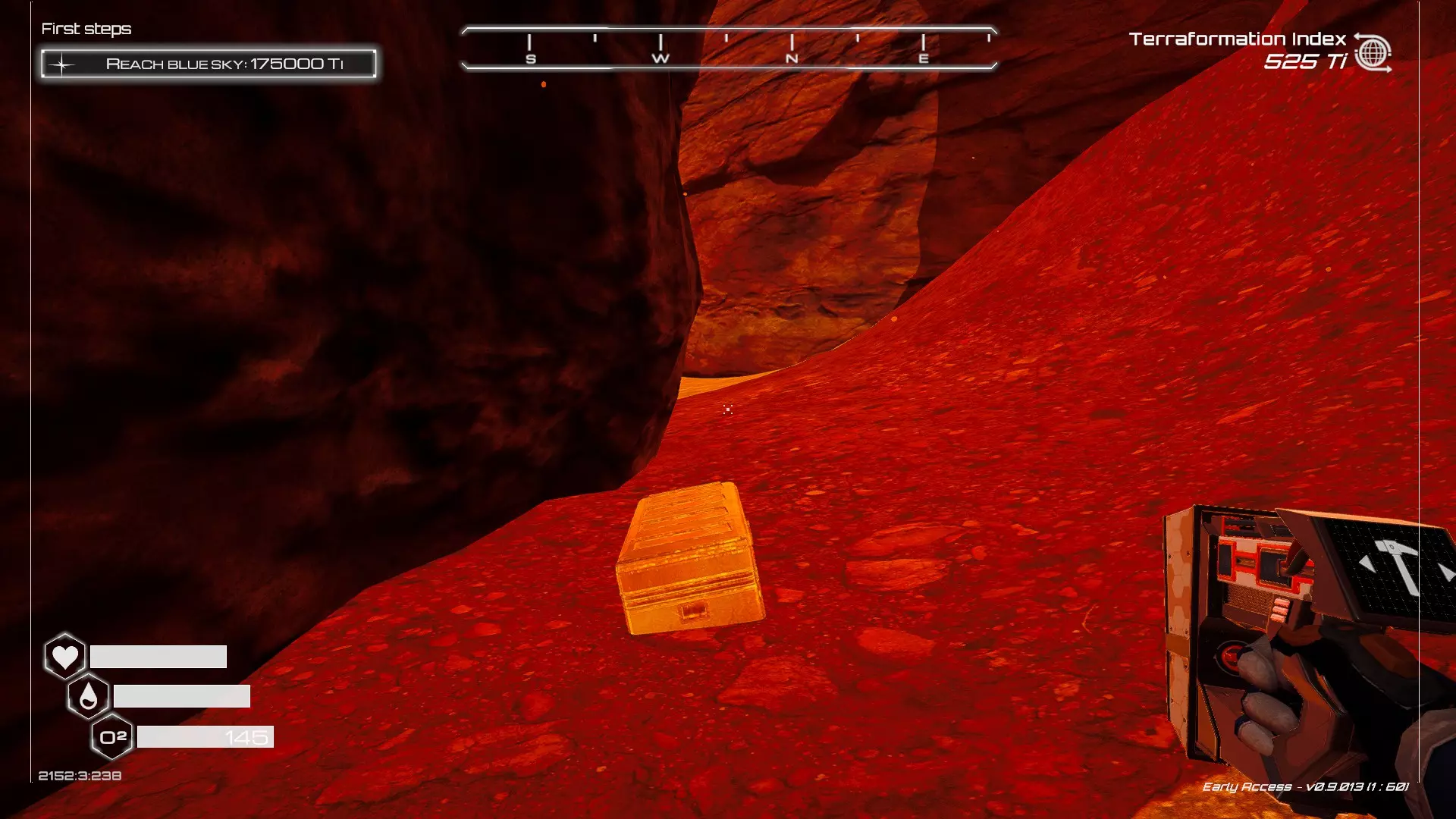 大致坐标:290:161:1008 3. 中央高原东部宝箱 在登陆舱的正北方,有一片平坦区域(高原),适合建造早期基地。这片高原的东部是铝矿开采区(布满大型灰色岩石)。 高原和铝矿开采区之间有一条小裂缝或河床。 裂缝中间有一组大型深色岩石(见图底部的那块)。
