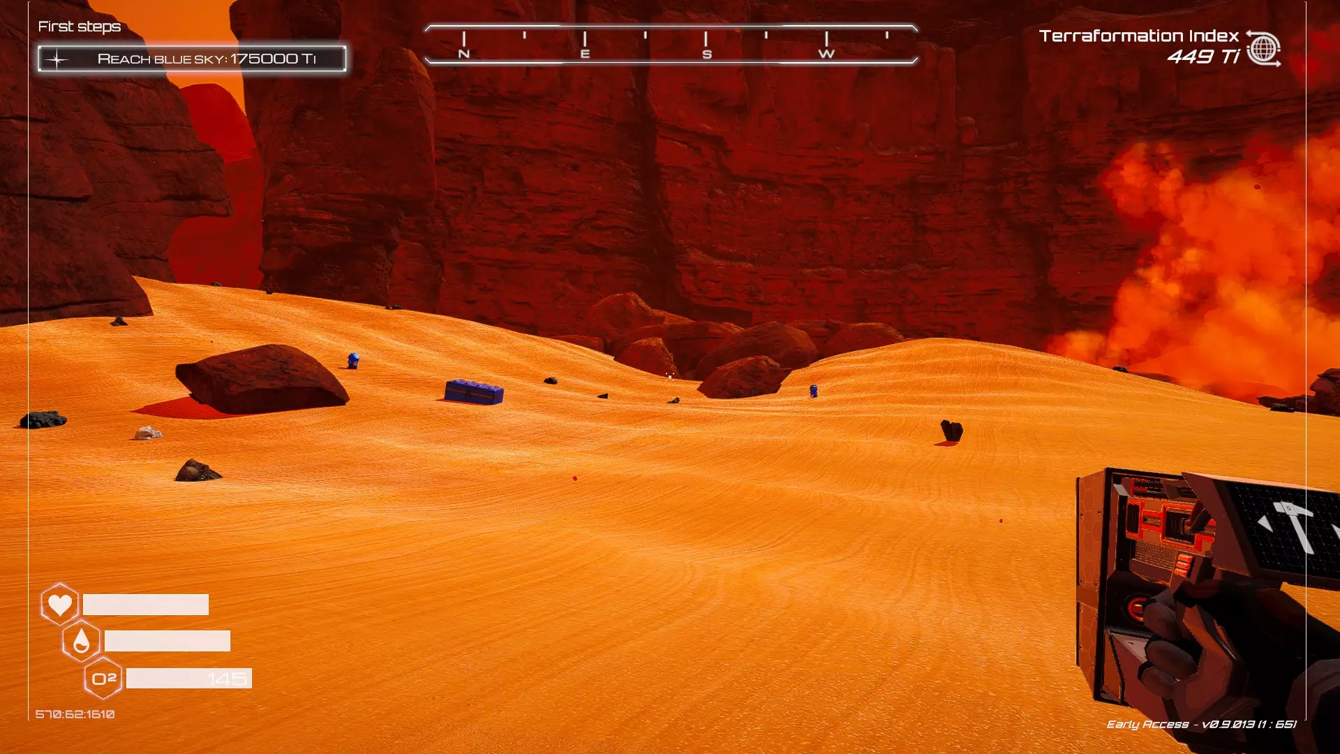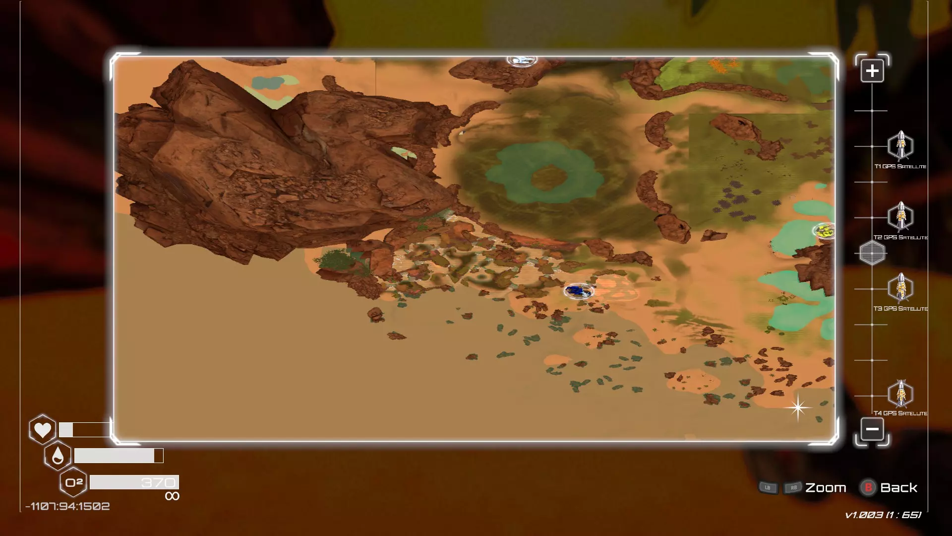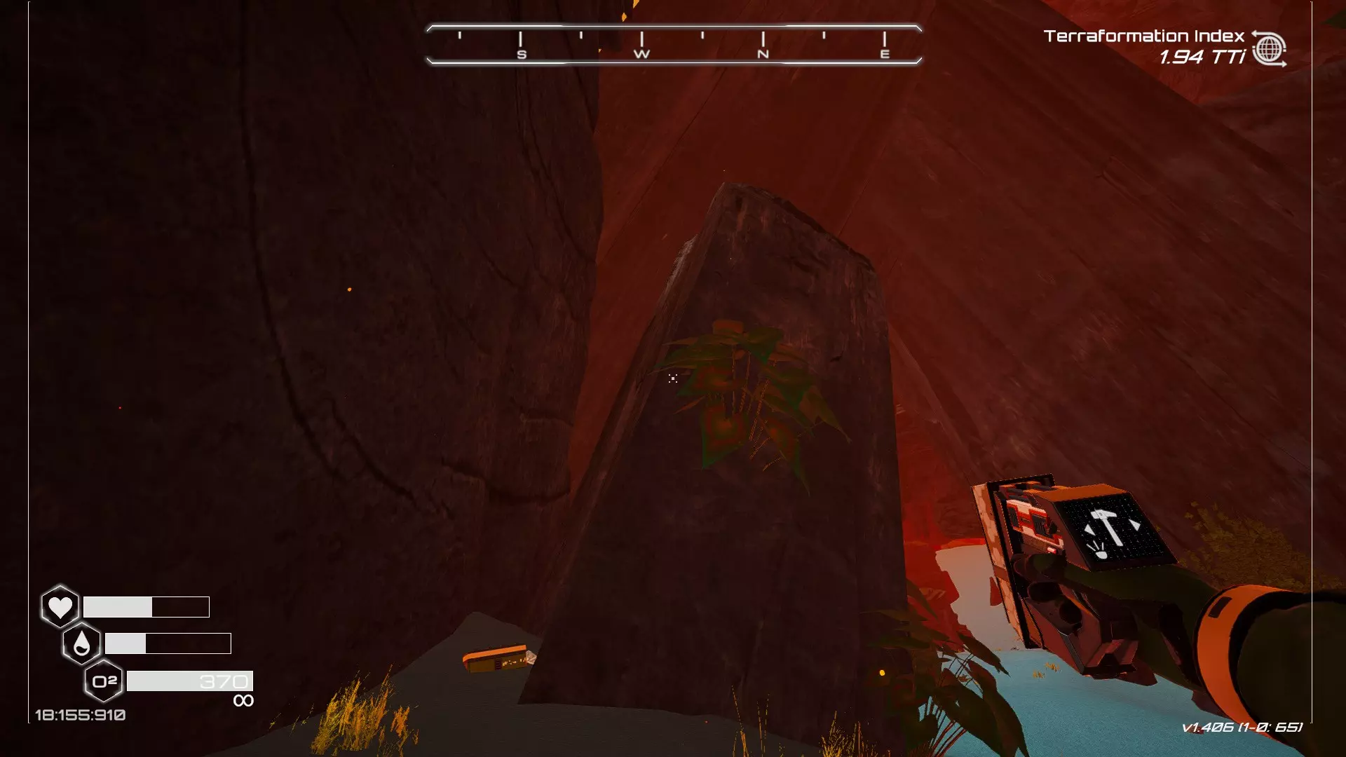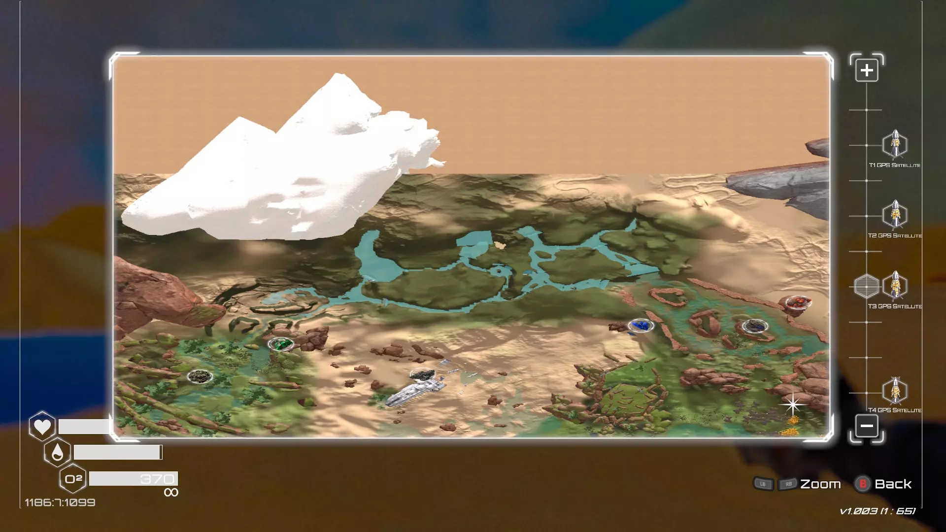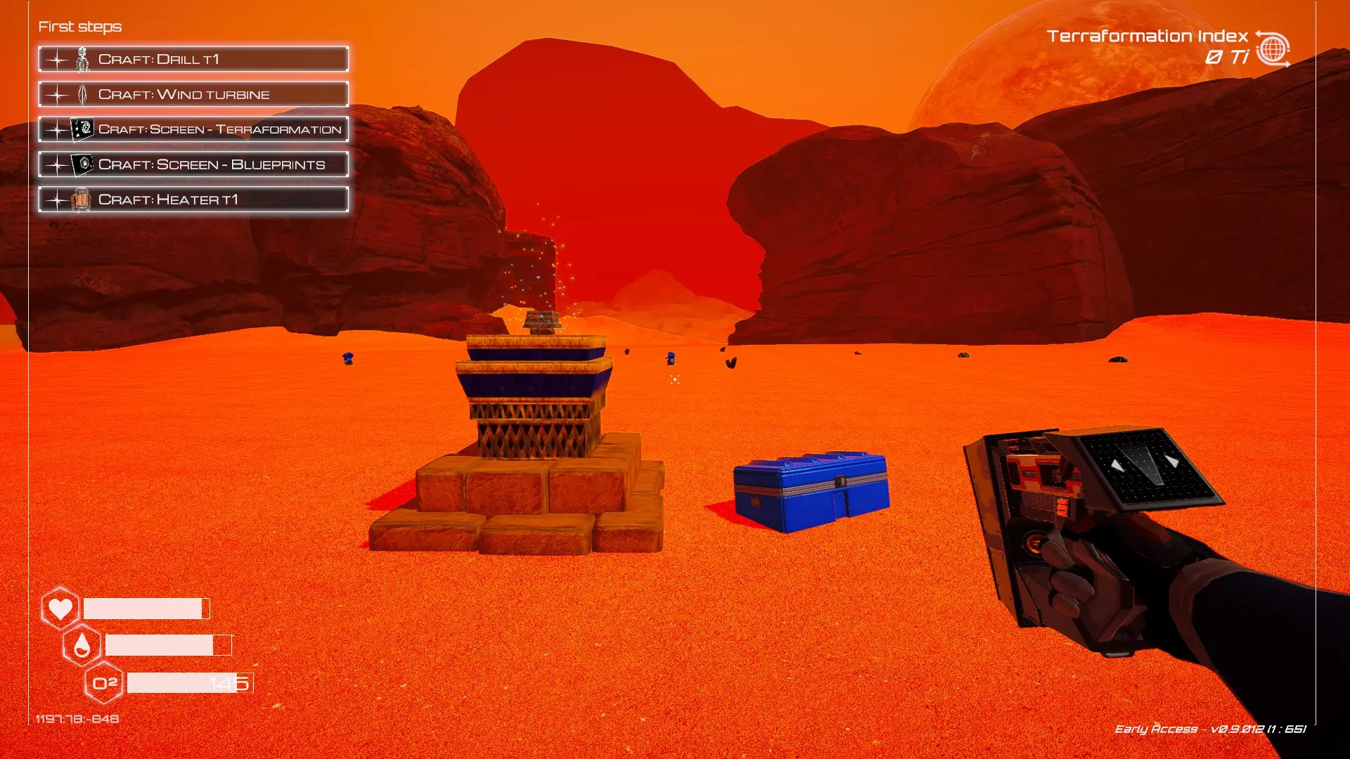 大致坐标:290:161:1008 3. 中央高原东部宝箱 在登陆舱的正北方,有一片平坦区域(高原),适合建造早期基地。这片高原的东部是铝矿开采区(布满大型灰色岩石)。 高原和铝矿开采区之间有一条小裂缝或河床。 裂缝中间有一组大型深色岩石(见图底部的那块)。