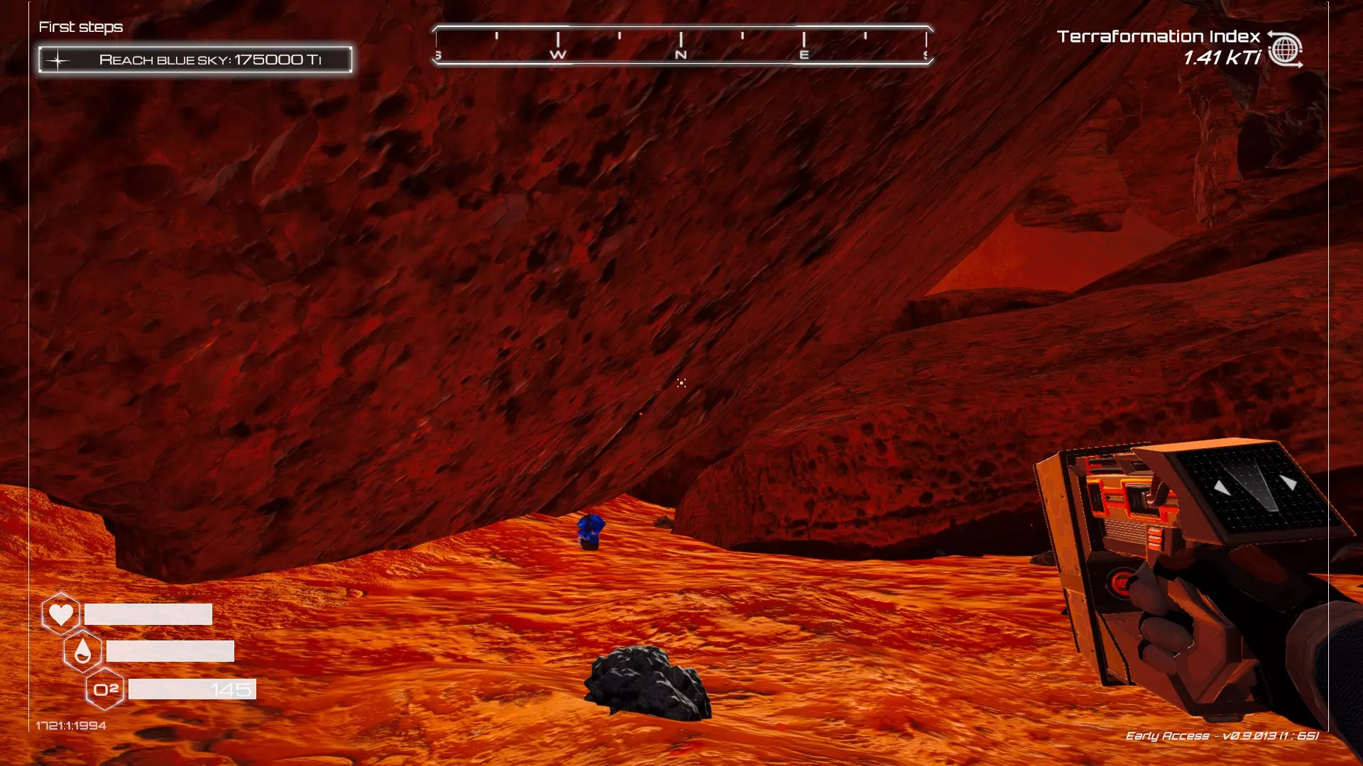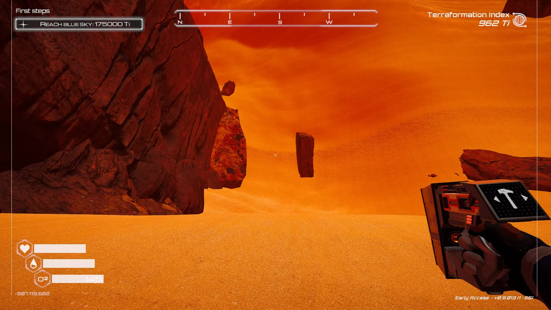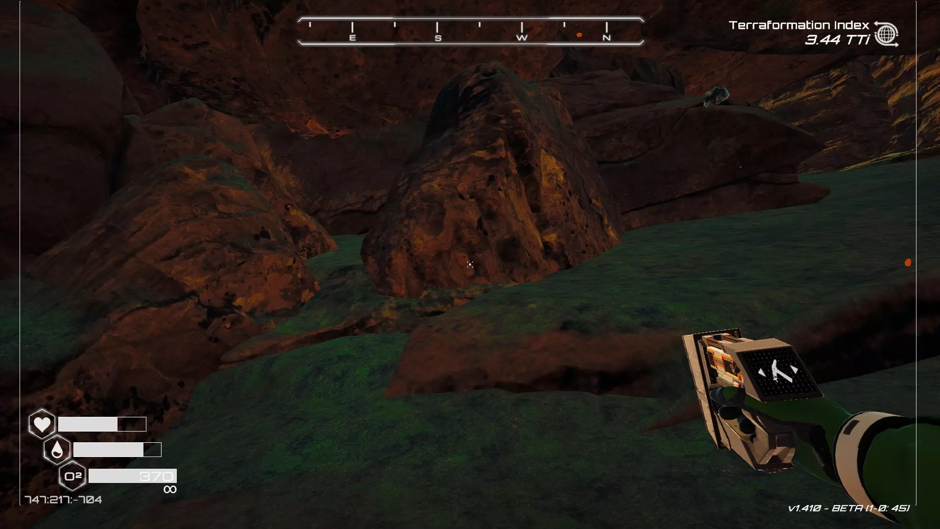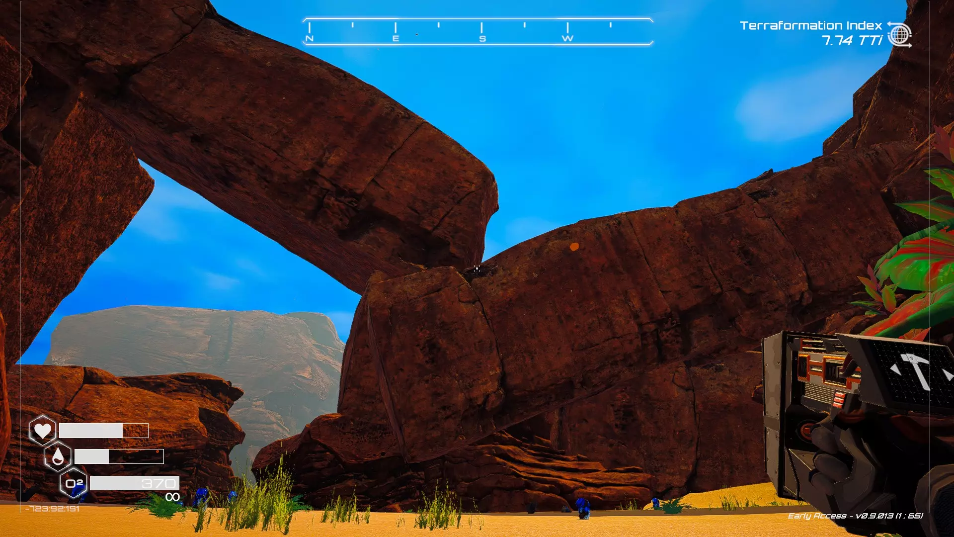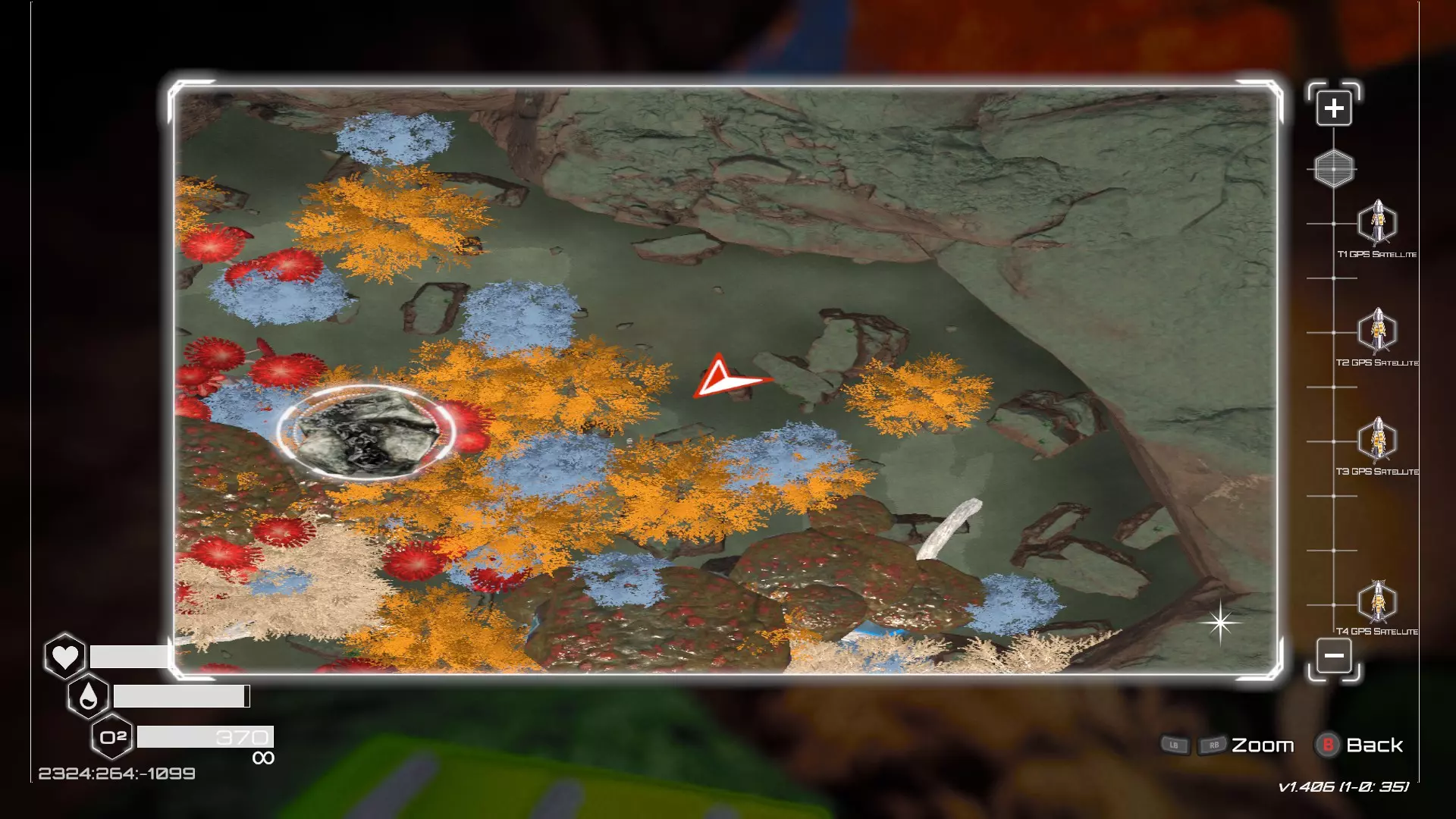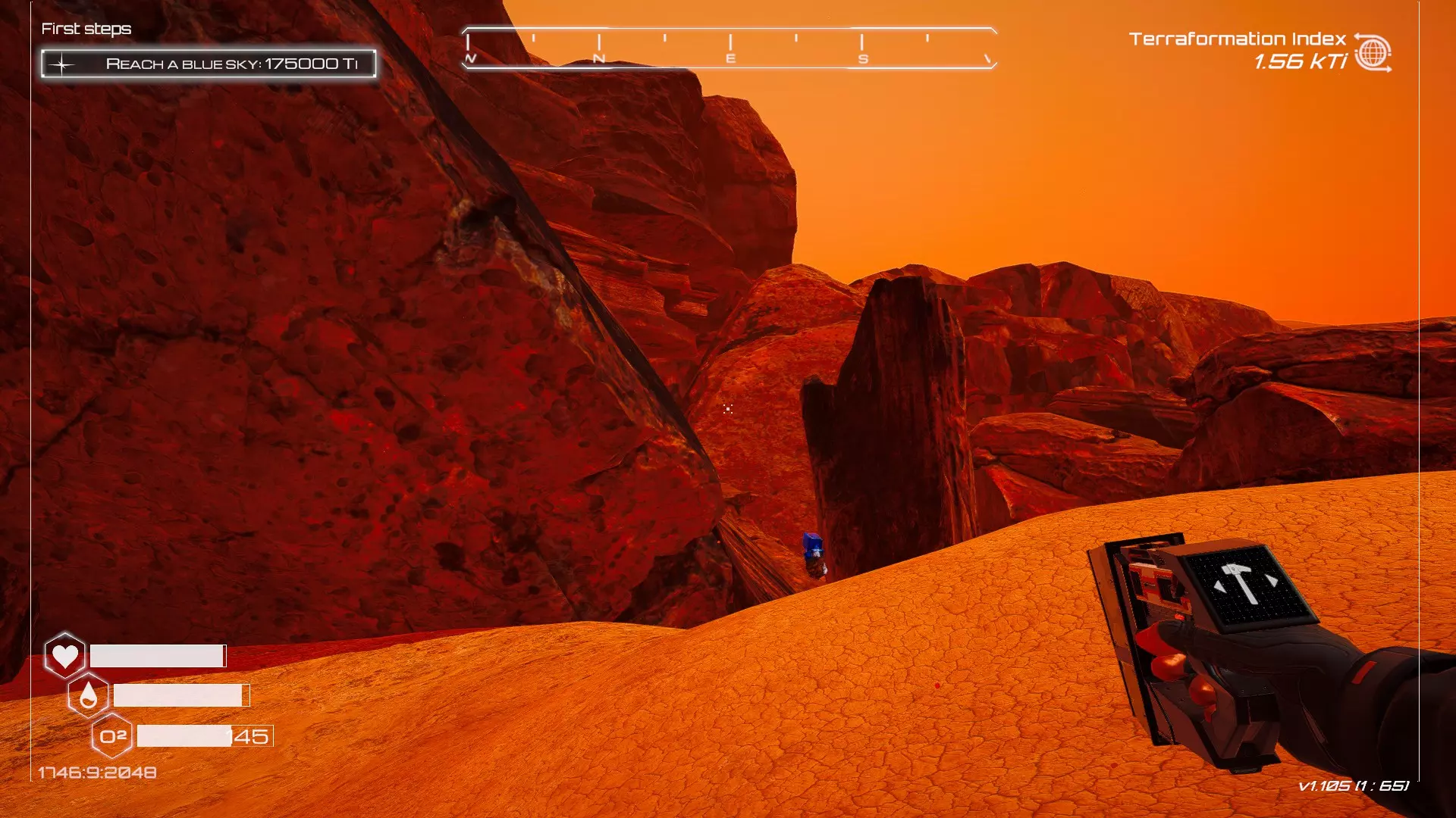 大致坐标:290:161:1008 3. 中央高原东部宝箱 在登陆舱的正北方,有一片平坦区域(高原),适合建造早期基地。这片高原的东部是铝矿开采区(布满大型灰色岩石)。 高原和铝矿开采区之间有一条小裂缝或河床。 裂缝中间有一组大型深色岩石(见图底部的那块)。