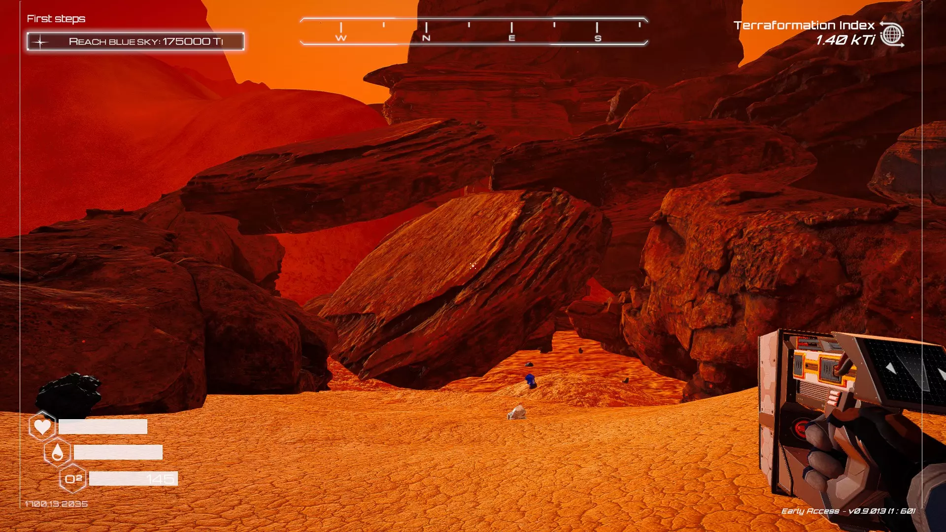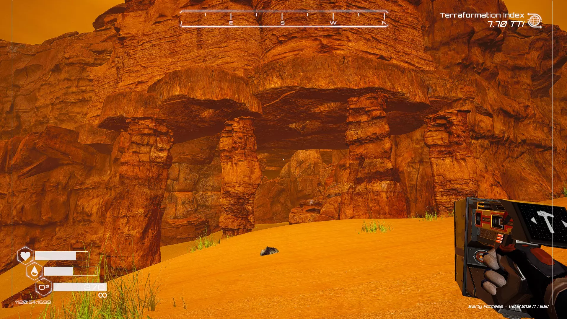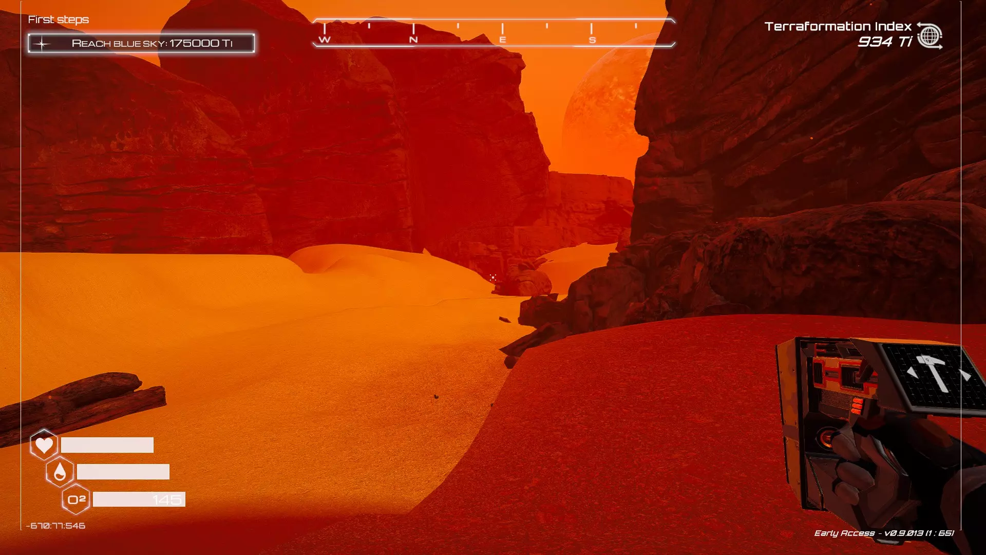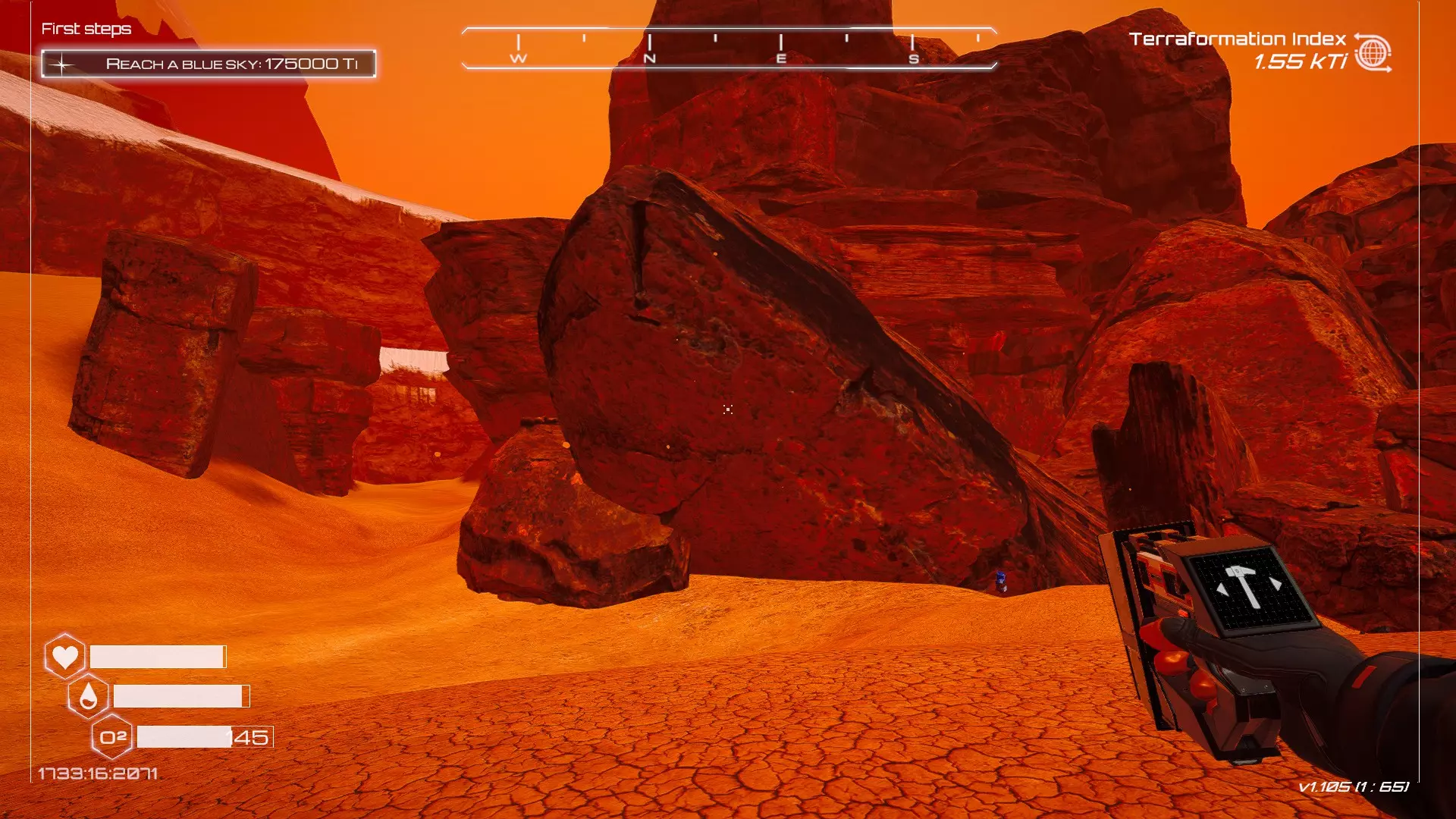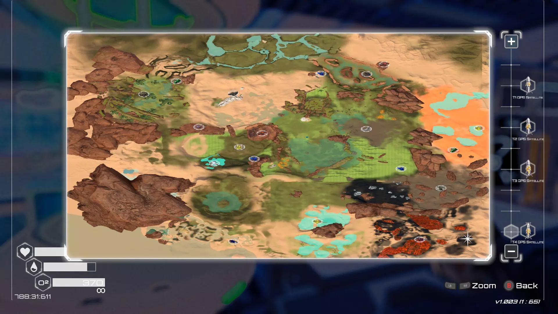 大致坐标:290:161:1008 3. 中央高原东部宝箱 在登陆舱的正北方,有一片平坦区域(高原),适合建造早期基地。这片高原的东部是铝矿开采区(布满大型灰色岩石)。 高原和铝矿开采区之间有一条小裂缝或河床。 裂缝中间有一组大型深色岩石(见图底部的那块)。