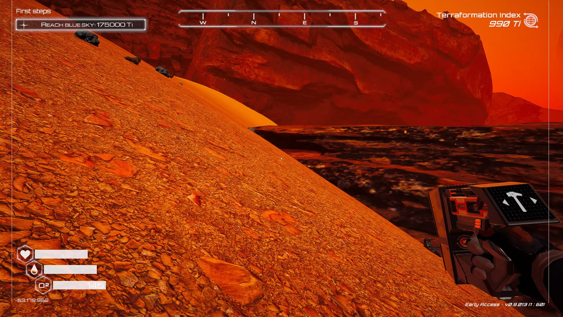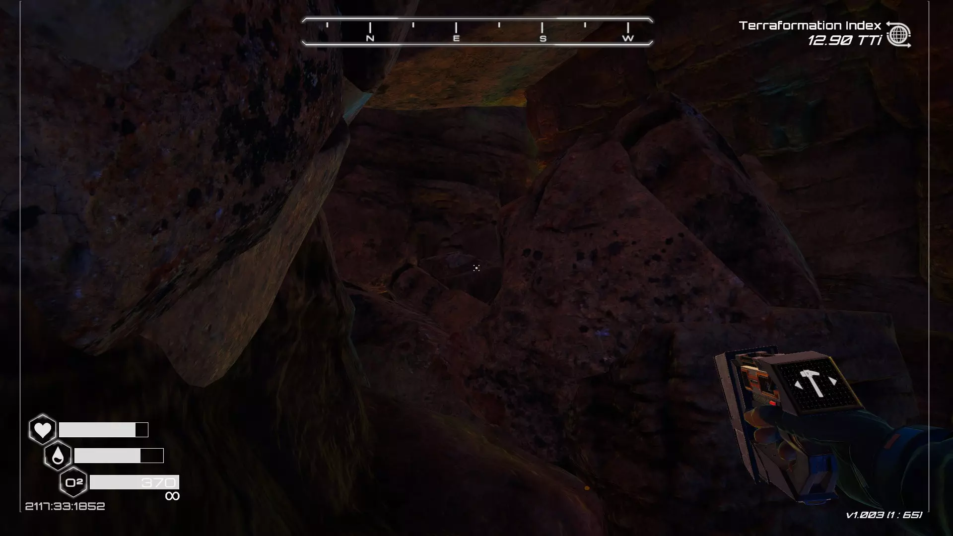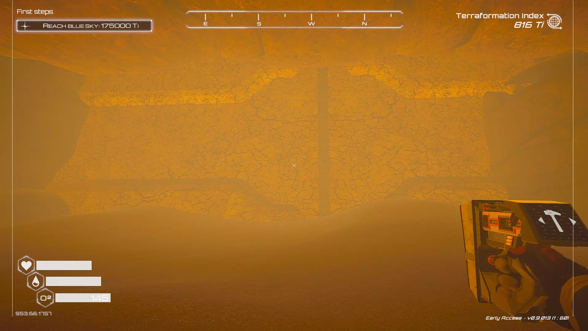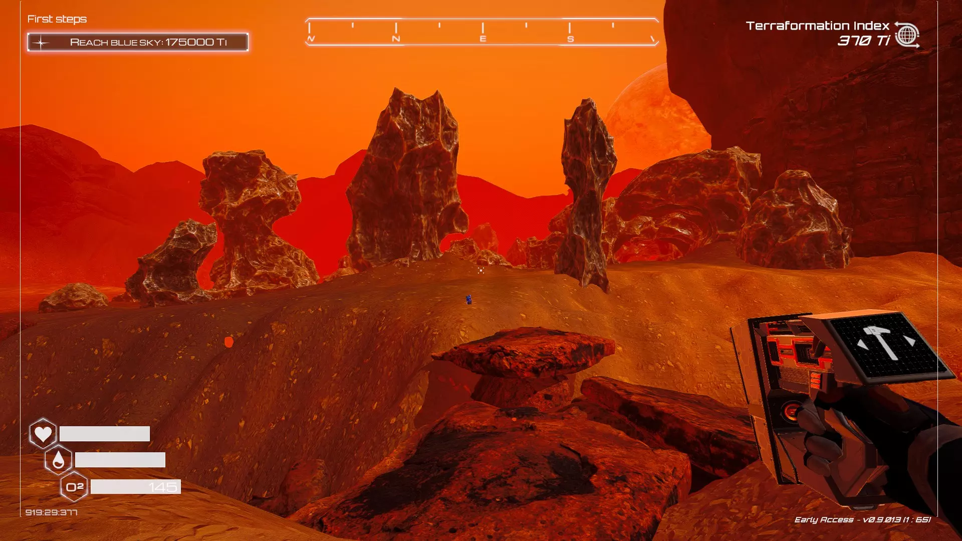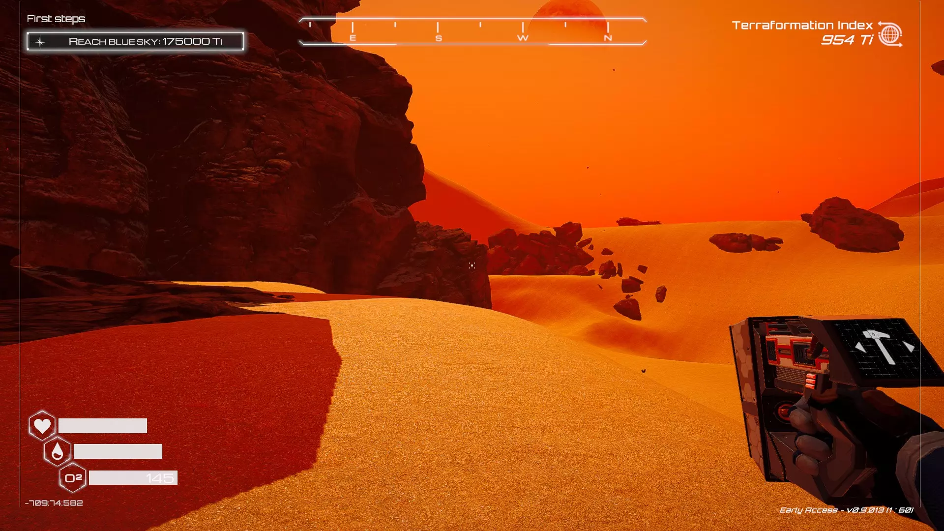 大致坐标:290:161:1008 3. 中央高原东部宝箱 在登陆舱的正北方,有一片平坦区域(高原),适合建造早期基地。这片高原的东部是铝矿开采区(布满大型灰色岩石)。 高原和铝矿开采区之间有一条小裂缝或河床。 裂缝中间有一组大型深色岩石(见图底部的那块)。