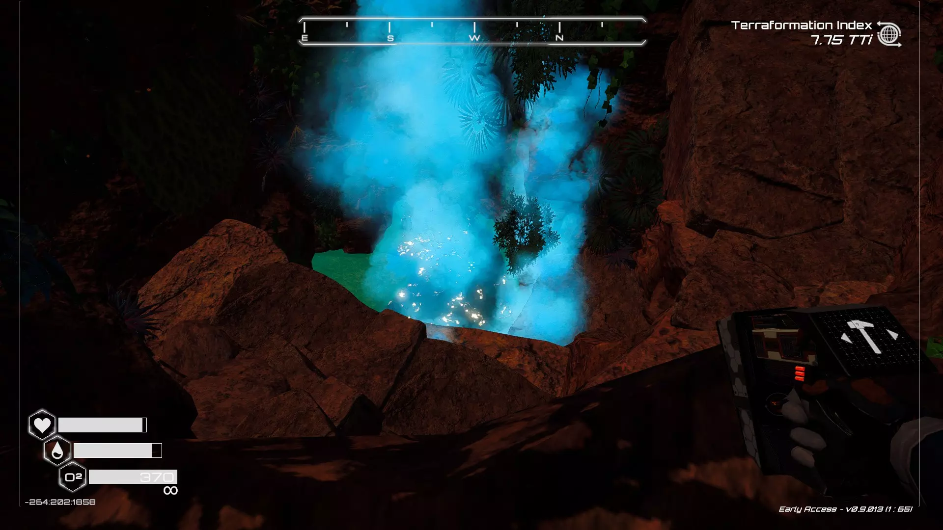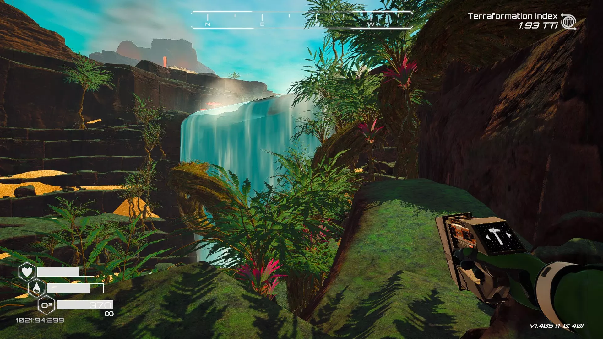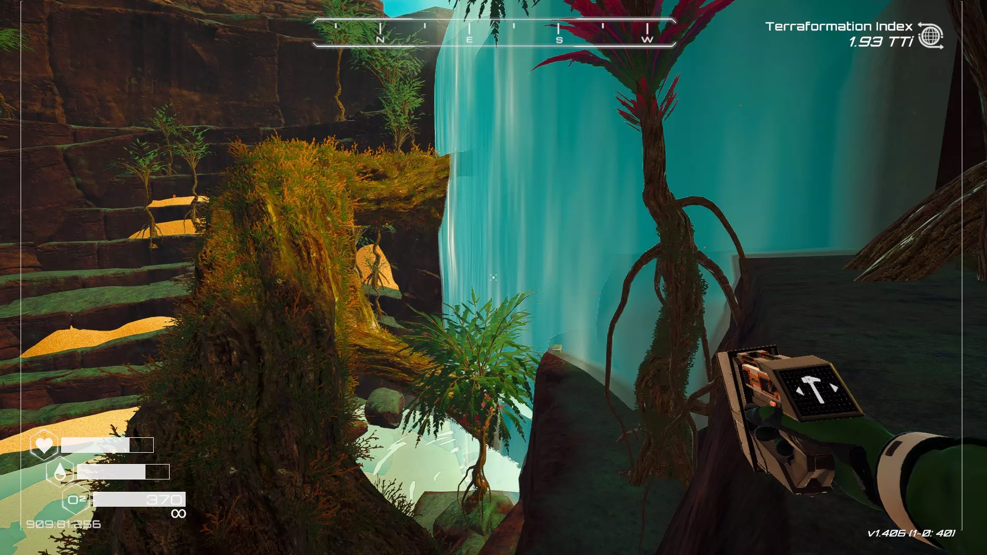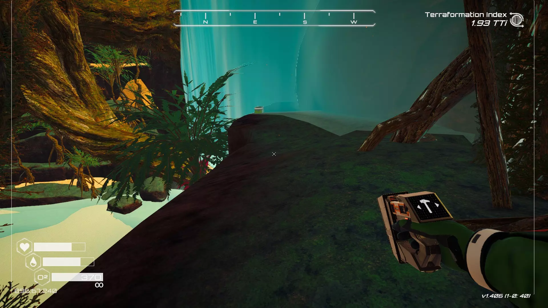在地球化改造的某个阶段,你会看到瀑布上方有一根粗大的树枝向上延伸,继续往前走就行。下一张图里,你能在瀑布中看到宝箱。