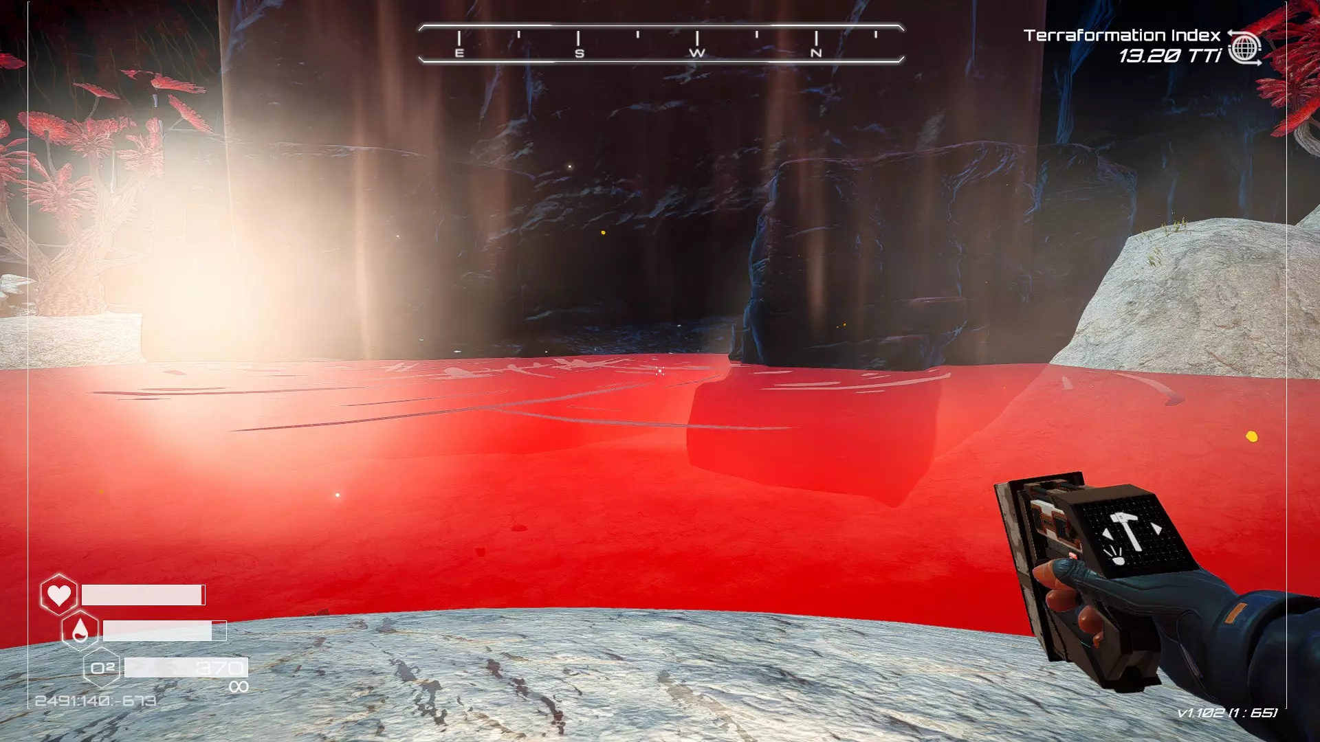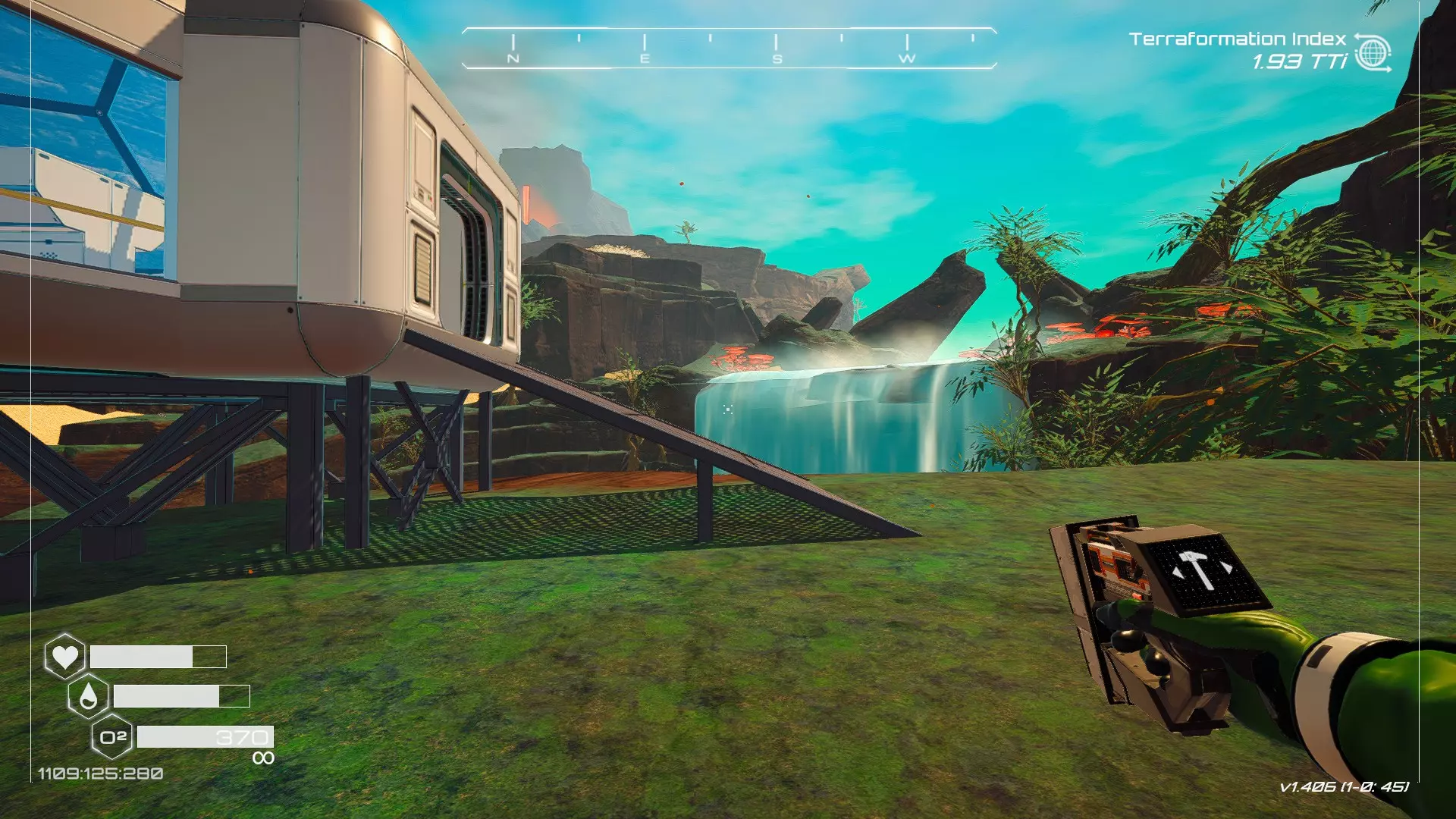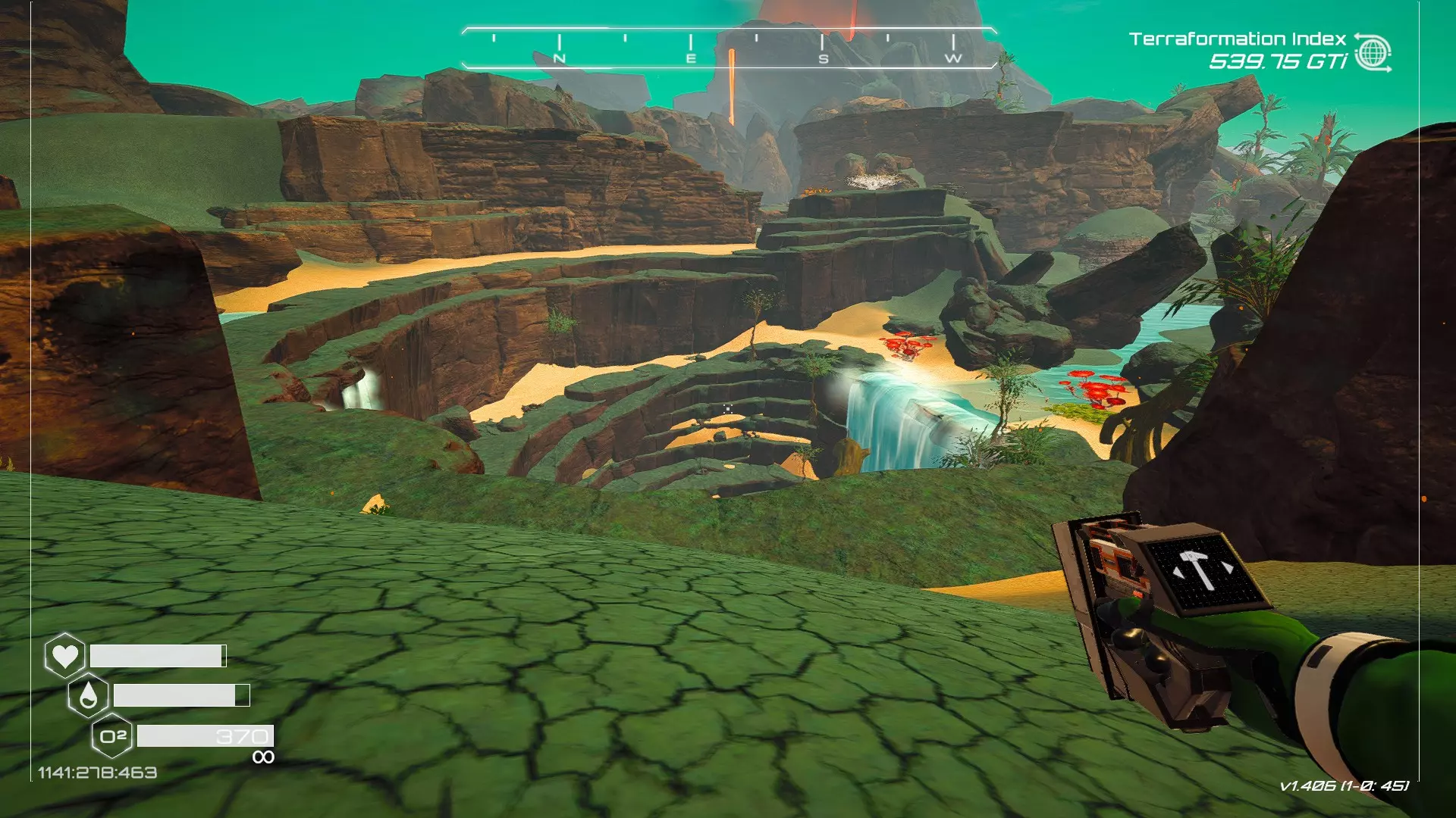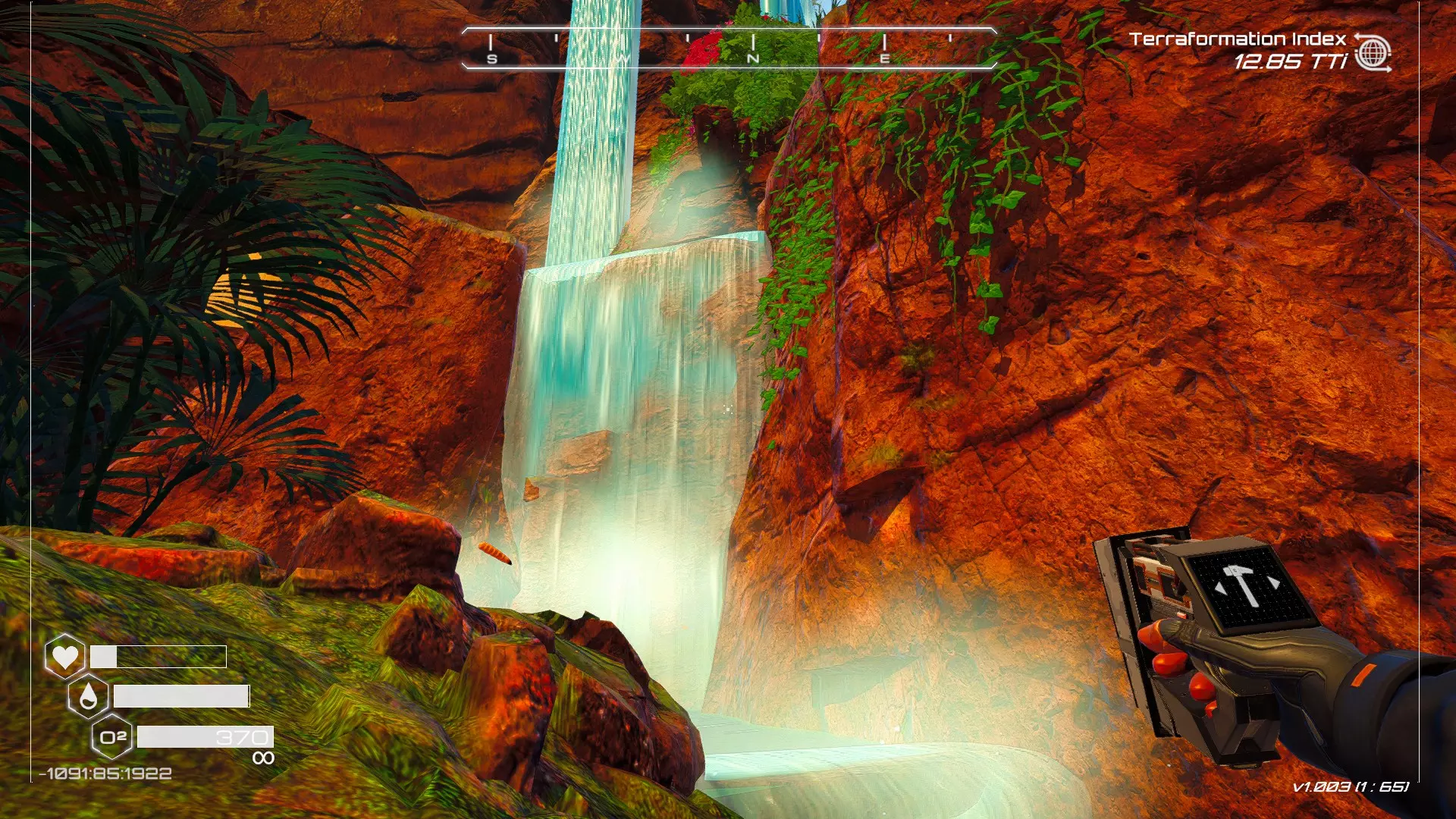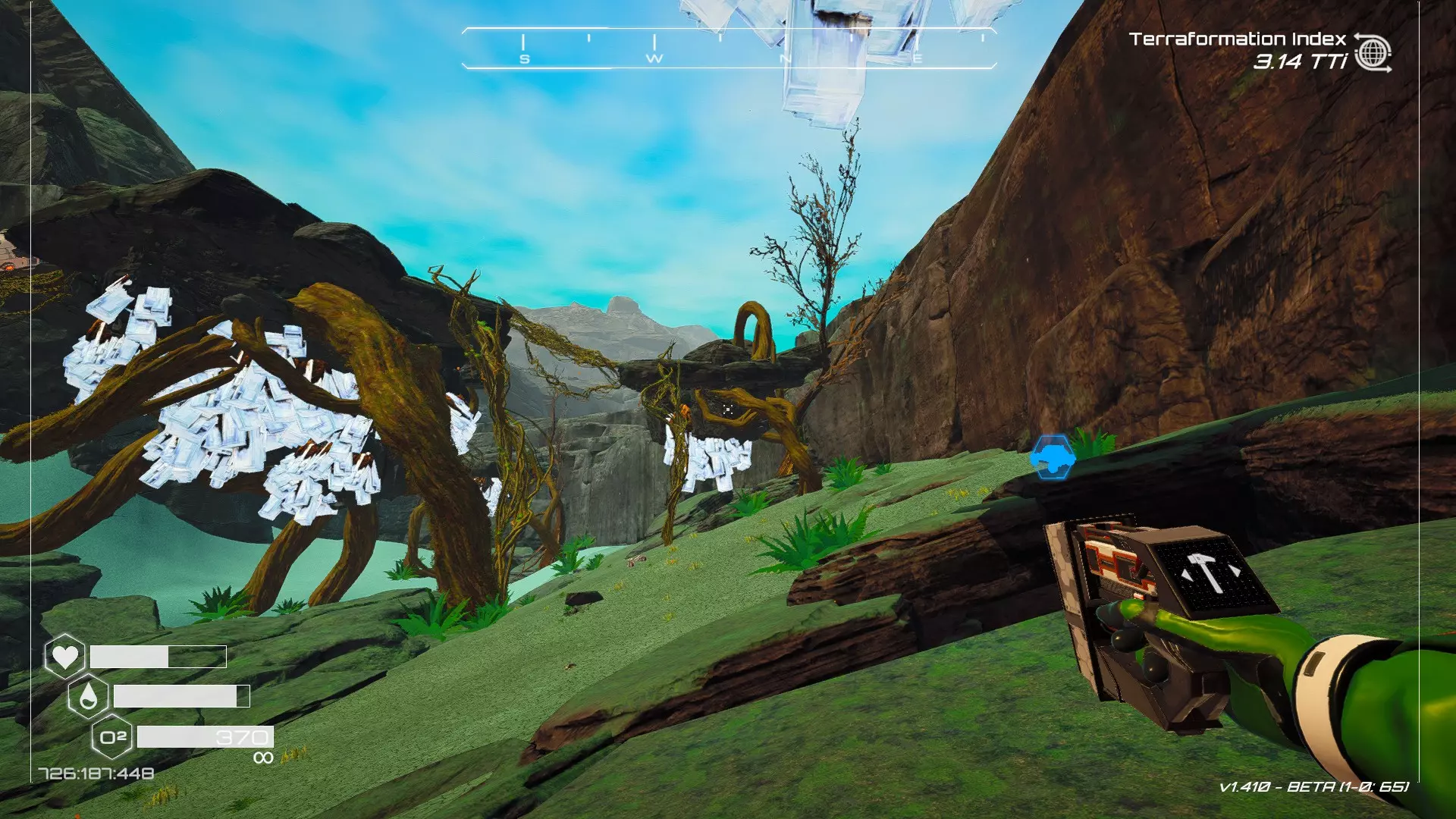 在地球化改造的某个阶段,你会看到瀑布上方有一根粗大的树枝向上延伸,继续往前走就行。下一张图里,你能在瀑布中看到宝箱。