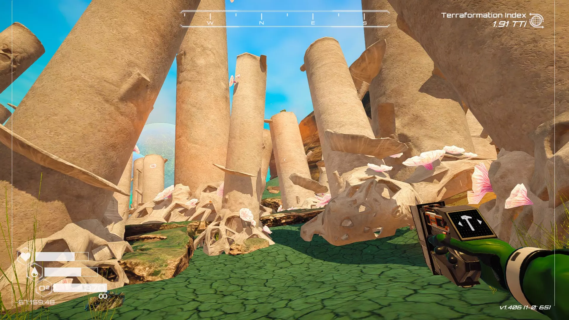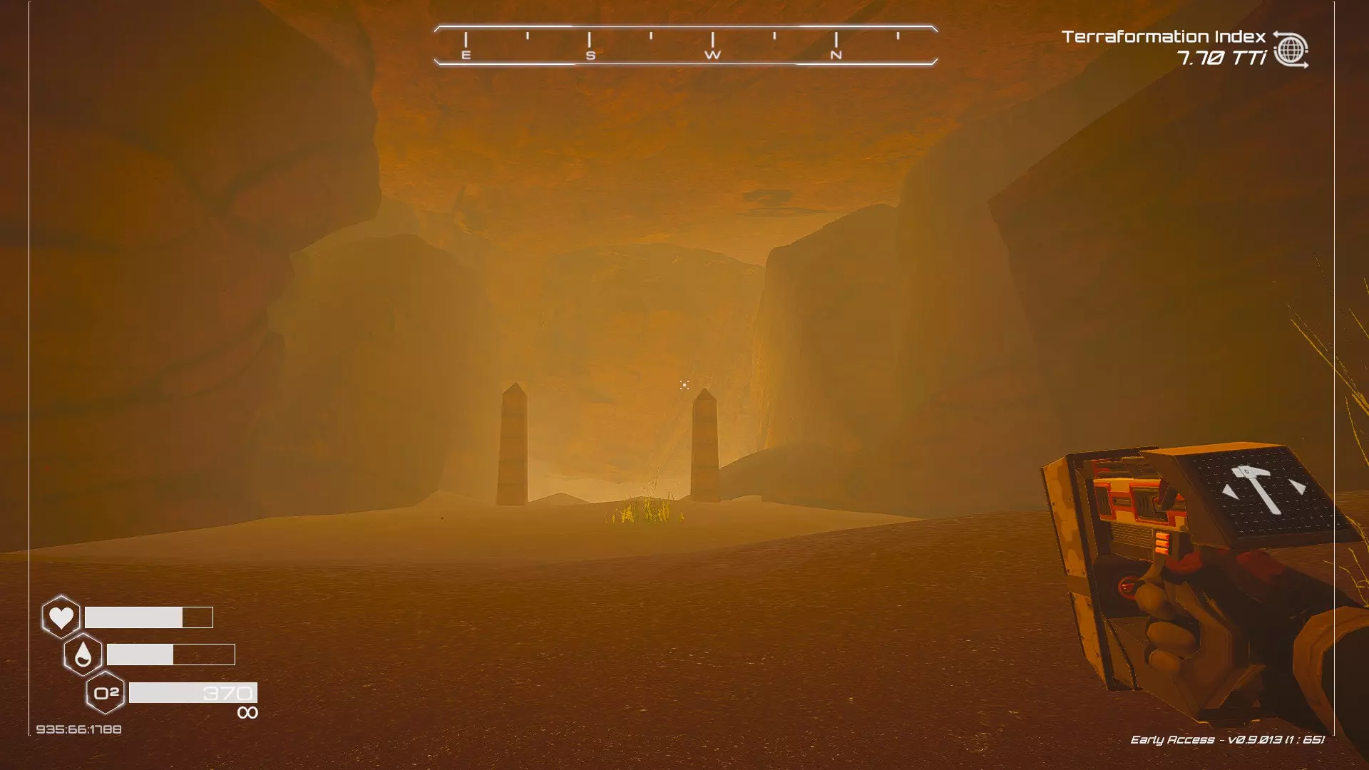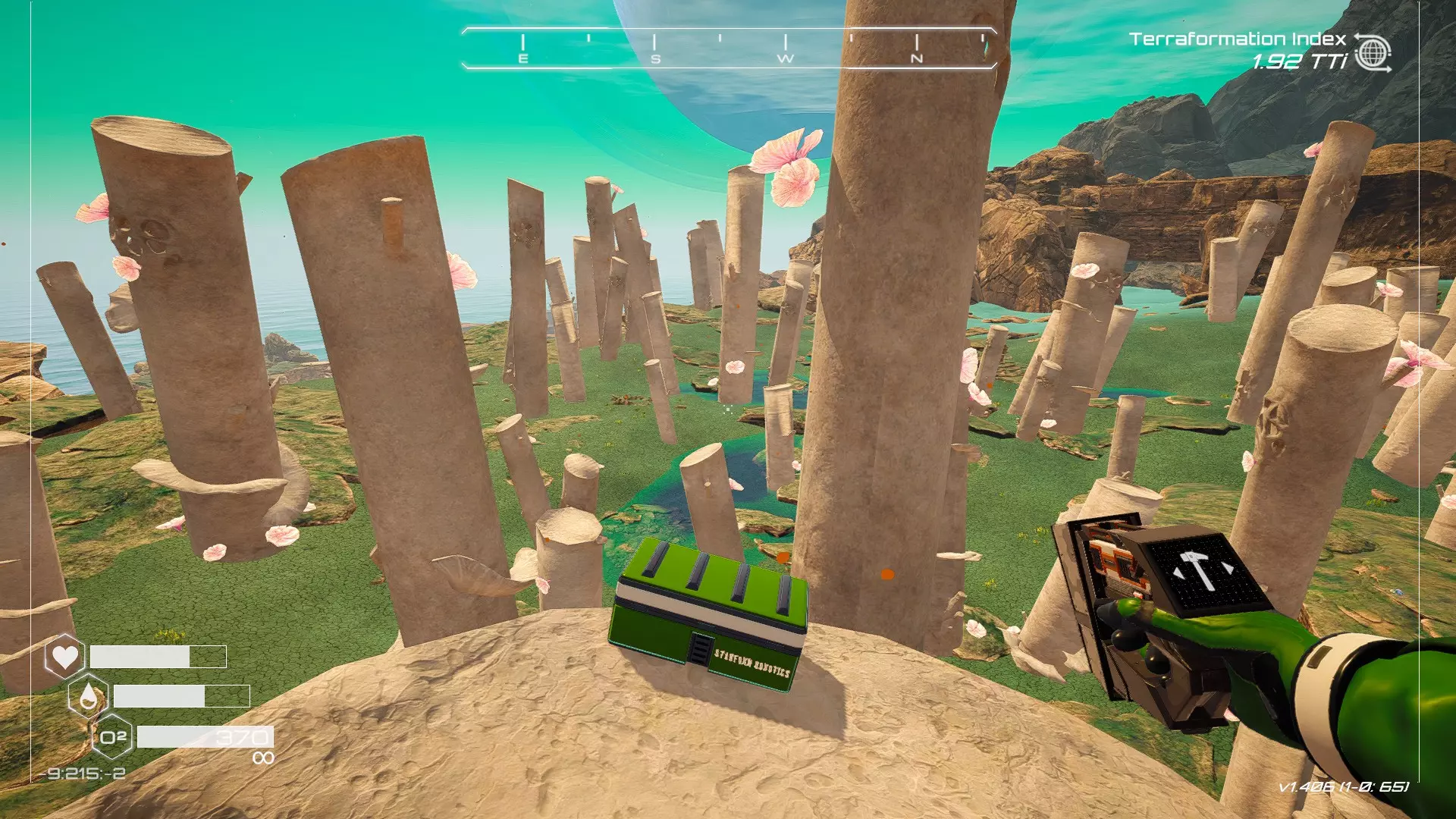 大致坐标:-1266:-102:-989 7. 石柱宝箱 如果在Humble存档中选择默认起始区域,这个宝箱位于有石柱的区域内。 遗憾的是,由于宝箱位于石柱顶部,确实需要在游戏后期获得更好的装备(如喷气背包)才能获取。 从舱体着陆点出发,朝东北偏北方向(指南针上N和E之间的刻度线中点)望去,右侧有一处悬崖。