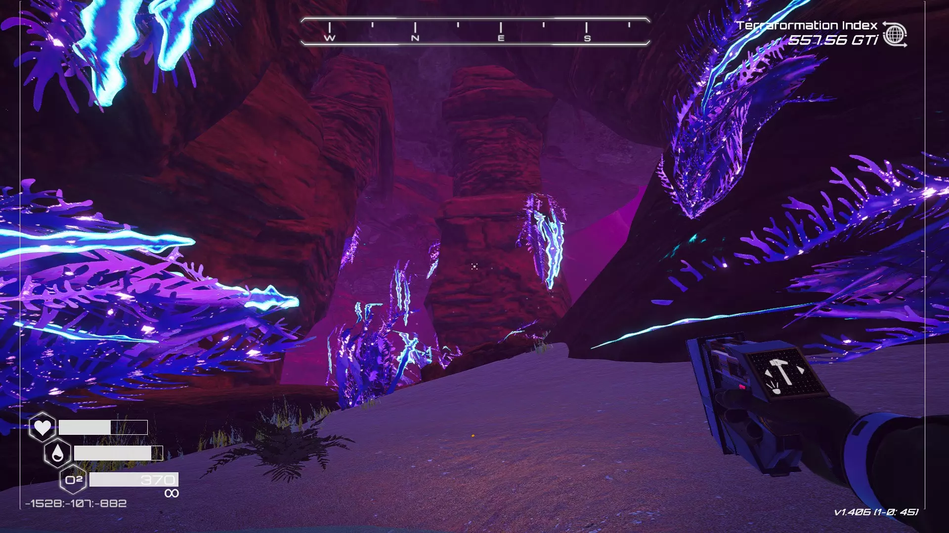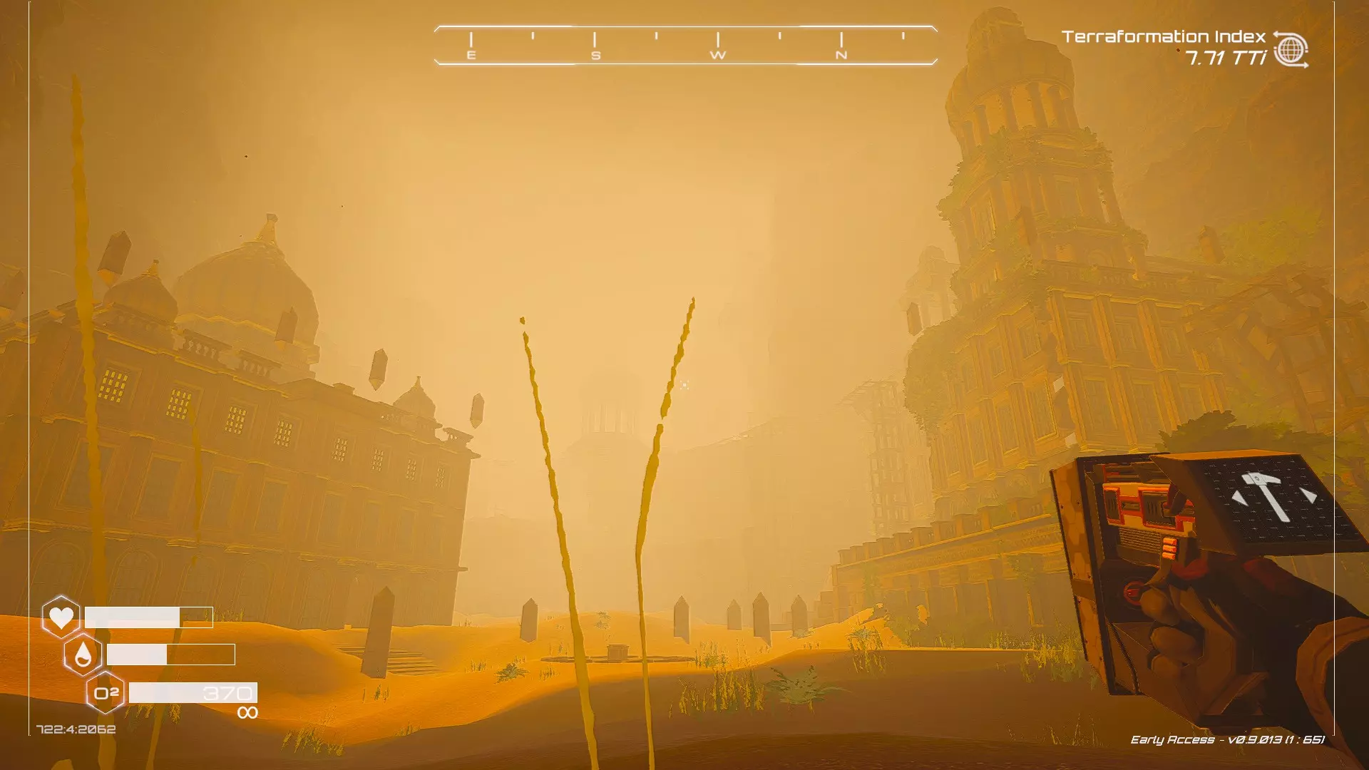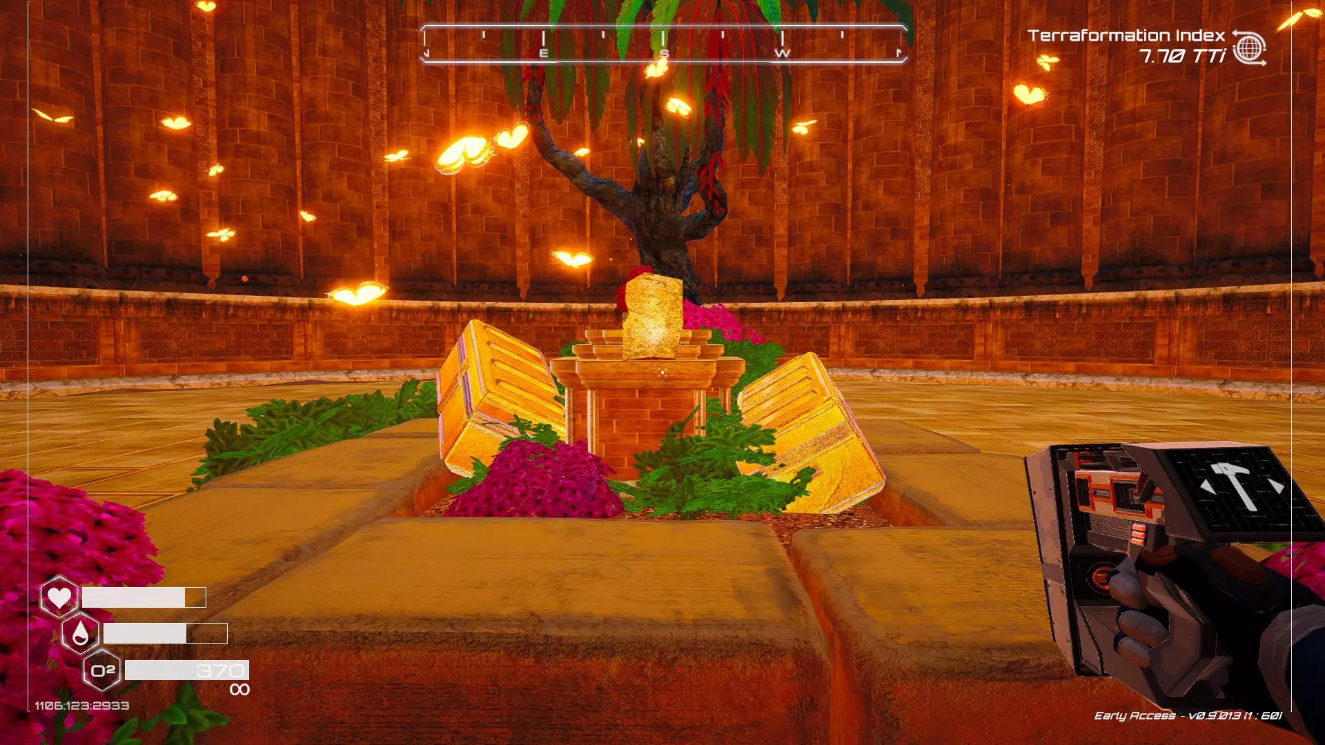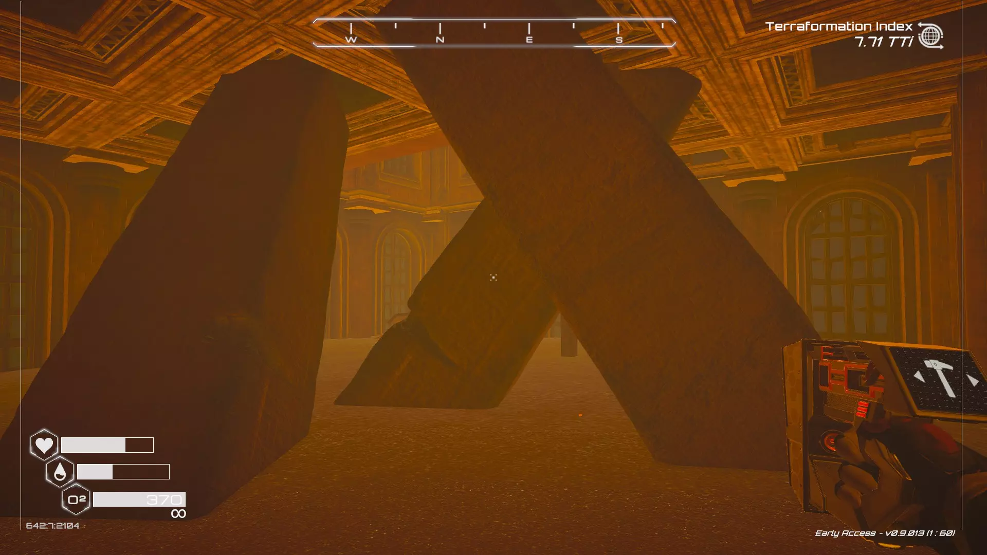 大致坐标:-1266:-102:-989 7. 石柱宝箱 如果在Humble存档中选择默认起始区域,这个宝箱位于有石柱的区域内。 遗憾的是,由于宝箱位于石柱顶部,确实需要在游戏后期获得更好的装备(如喷气背包)才能获取。 从舱体着陆点出发,朝东北偏北方向(指南针上N和E之间的刻度线中点)望去,右侧有一处悬崖。