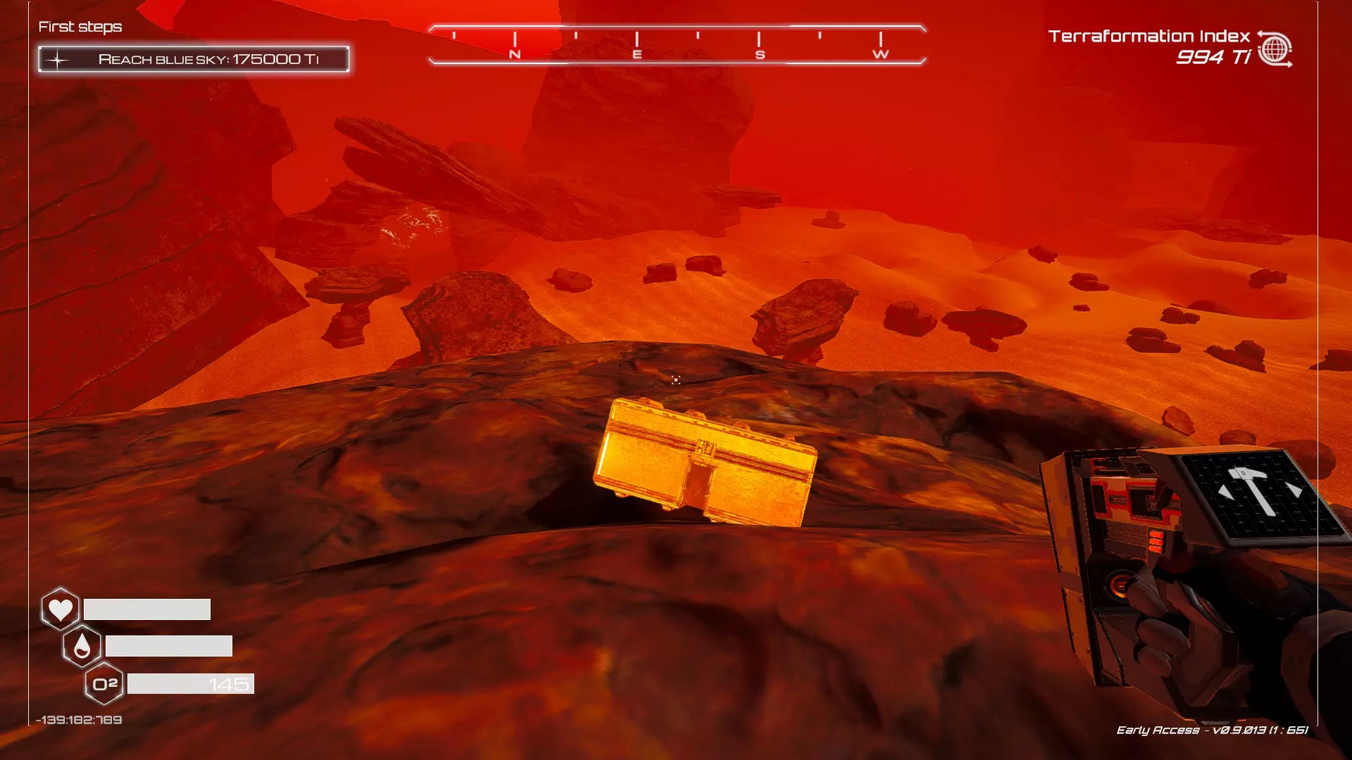 大致坐标:-428:-53:113 17. 高地宝箱 高地位于地图最西侧区域,靠近有坠毁飞船的沙地区域,毗邻失落天堂区域入口。该区域地势崎岖不平。这个宝箱我认为是最难找到的,因为它隐藏得非常好,而且地处偏僻。 在坠毁飞船和失落天堂入口之间,大致有一堆巨大的岩石相互堆叠。
