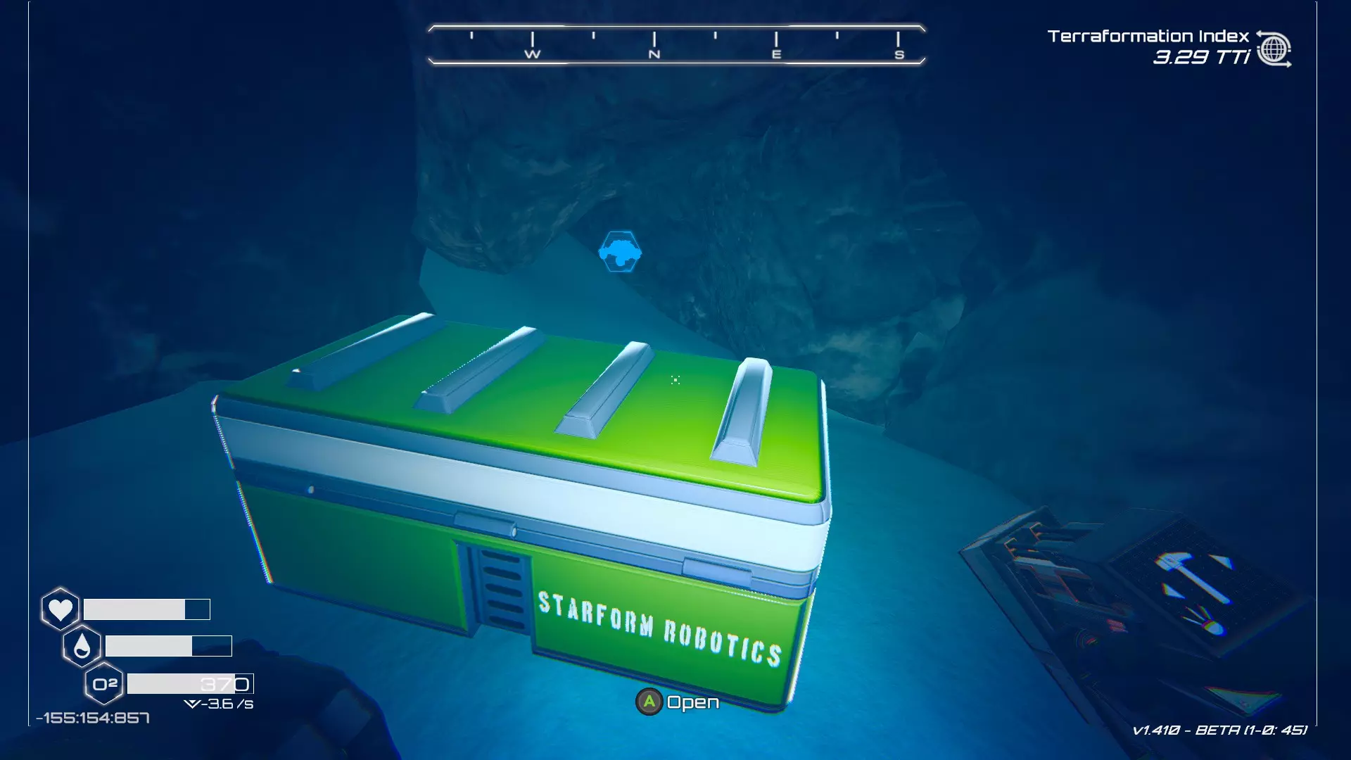 大致坐标:-155:154:857 13. 锇晶区域宝箱 此宝箱可在任意地形改造等级下找到,位于星球地图西北角、生长着巨大蓝色锇晶体的开放区域中。