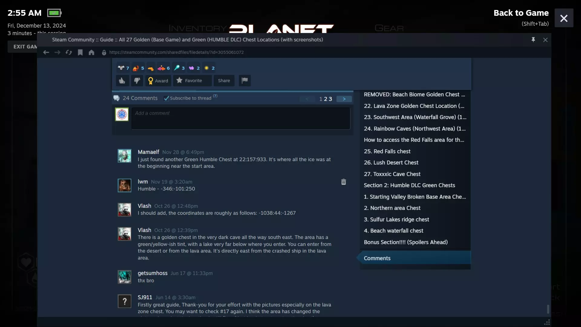 大致坐标:2326:265:-1101 3. 硫磺湖山脊宝箱 从硫磺湖出发,面向南方。 (这些截图中我处于树木阶段,我认为你需要喷气背包才能跳过更大的间隙)