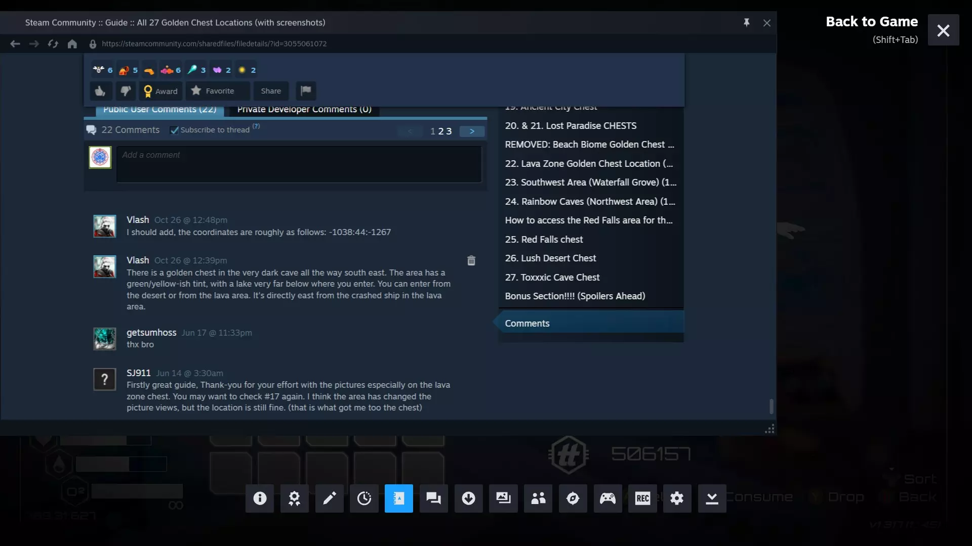 大致坐标:-1038:44:-1267 恭喜!你已集齐全部27个黄金宝箱! 附:感谢Vlash告知我这个宝箱的存在,以及“漫游者”更新中的宝箱相关内容。