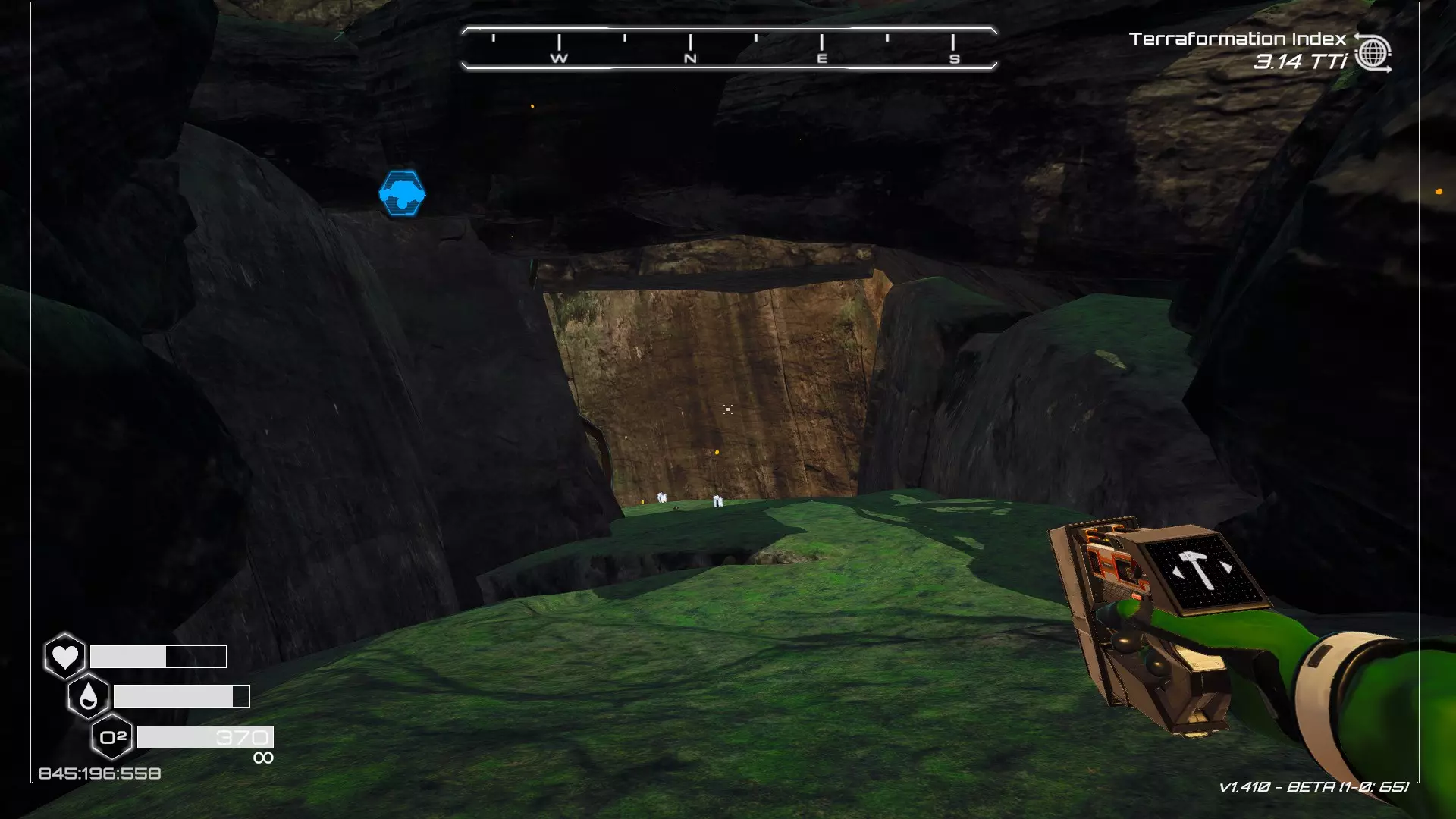 我还没有指南针,所以辨别方向很困难,但在一个区域你会看到一个连接着设备的绿色球体(球体里有一个可以解密的微芯片),在它的前方,通往冰洞的小山丘前,你会看到背景中有巨大的岩层。这是白天有指南针时的样子。