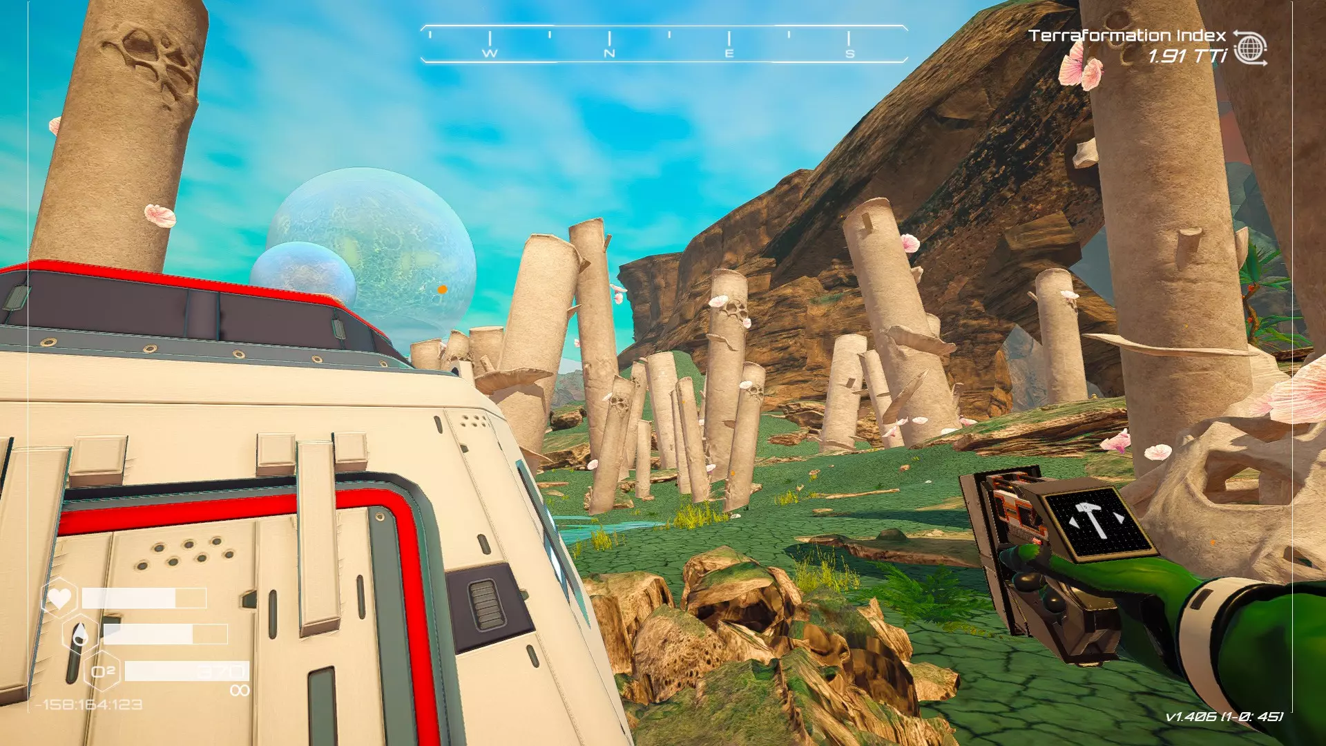 大致坐标:2152:3:238 8. 迷宫石柱(小峡谷) 若从中央高原出发,不向西或向东走,而是向北行进:你会看到一艘坠毁飞船的残骸部分。 在那艘飞船的北边,是一片由高大岩石柱构成的迷宫。 穿过岩石柱迷宫后向北走出,会看到一艘失事飞船位于一片小型平坦岩石区域上。