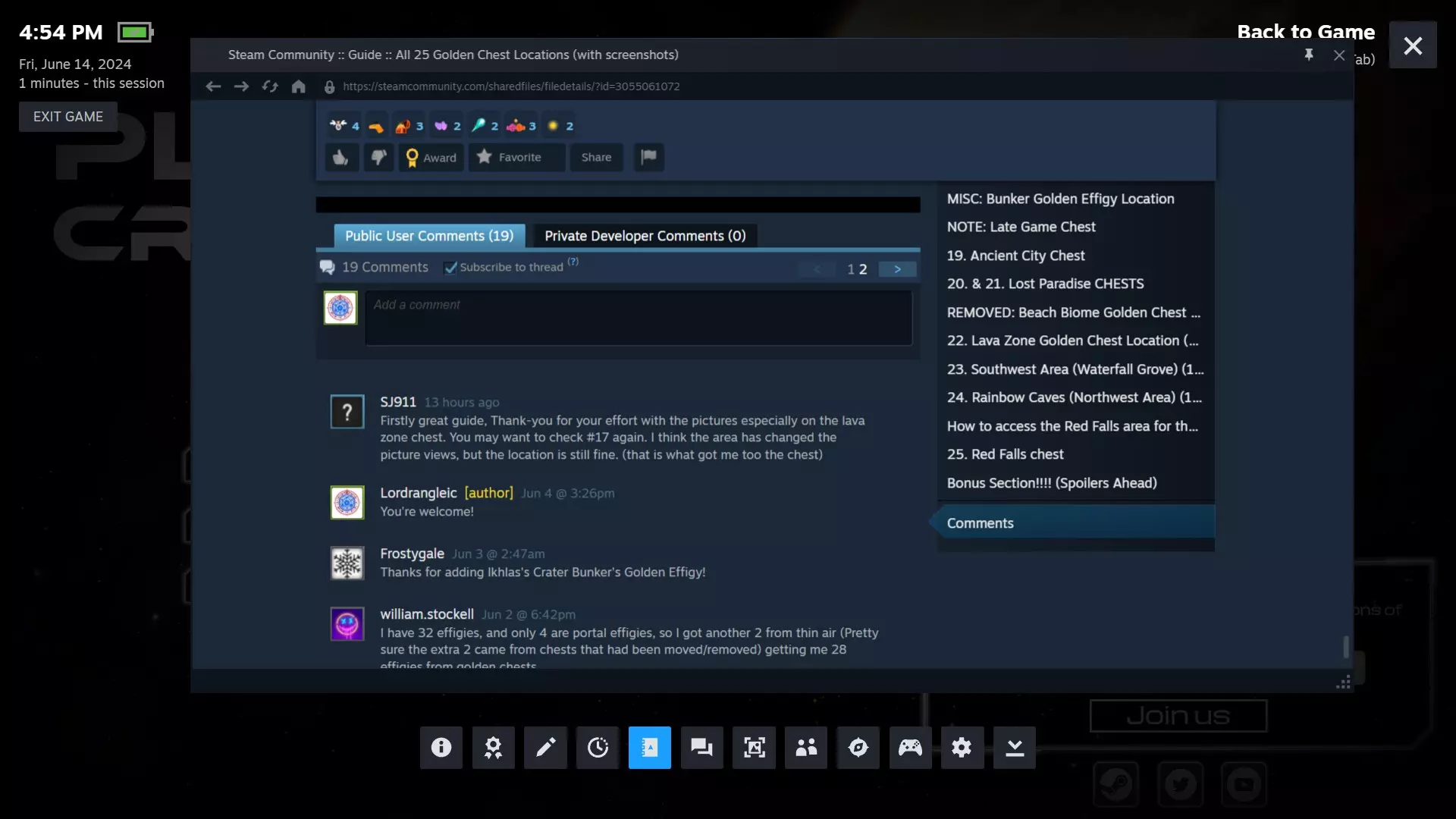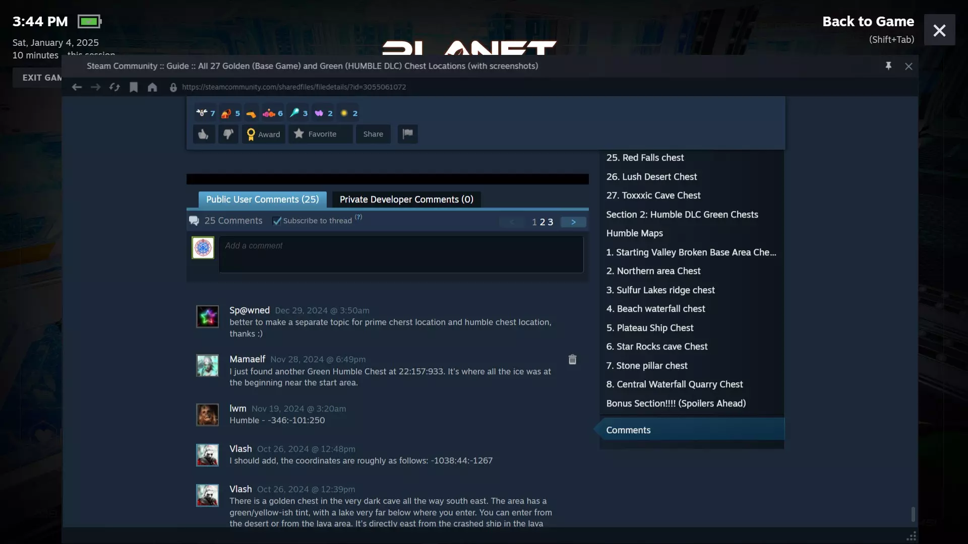 一份带图片的快速指南,展示如何找到27个黄金宝箱,包括截至漫游者更新(2024/10/28)的所有宝箱。我还添加了一个章节,内容是在一个地堡中发现的黄金雕像,该雕像不在黄金宝箱内(位于指南中第18个宝箱“灰岩坑”之后)。(2024/06/01) 截至2024/11/07,我已拥有Humble DLC,并且会在DLC星球中添加所有我找到的绿色宝箱。 我确实参考了维基上的一些信息。 补充说明:通过传送门找到的随机生成残骸中可以发现无限的传送门黄金雕像,但黄金宝箱中只有27个黄金雕像。此外,雕像在奖杯架上占用的空间比在任何表面上建造时都要小。注意:我使用了两个不同的存档来获取最佳截图,一个是普通存档,另一个是自定义存档,就像我原来的存档一样;我分解了黄金宝箱来获取铝和超级合金。 第一部分:基础游戏黄金宝箱 黄金宝箱是游戏中随处可见的特殊宝箱,里面装有稀有且珍贵的物品,有些是独特的,比如无法制作的黄金雕像,其他则是可制作的,只是通常在游戏后期才会出现的物品,否则在游戏早期是看不到的。此外,如果你需要资源,黄金宝箱可以被分解成超级合金和铝。 基础游戏地图上隐藏着27个黄金宝箱。 它们看起来是这样的: