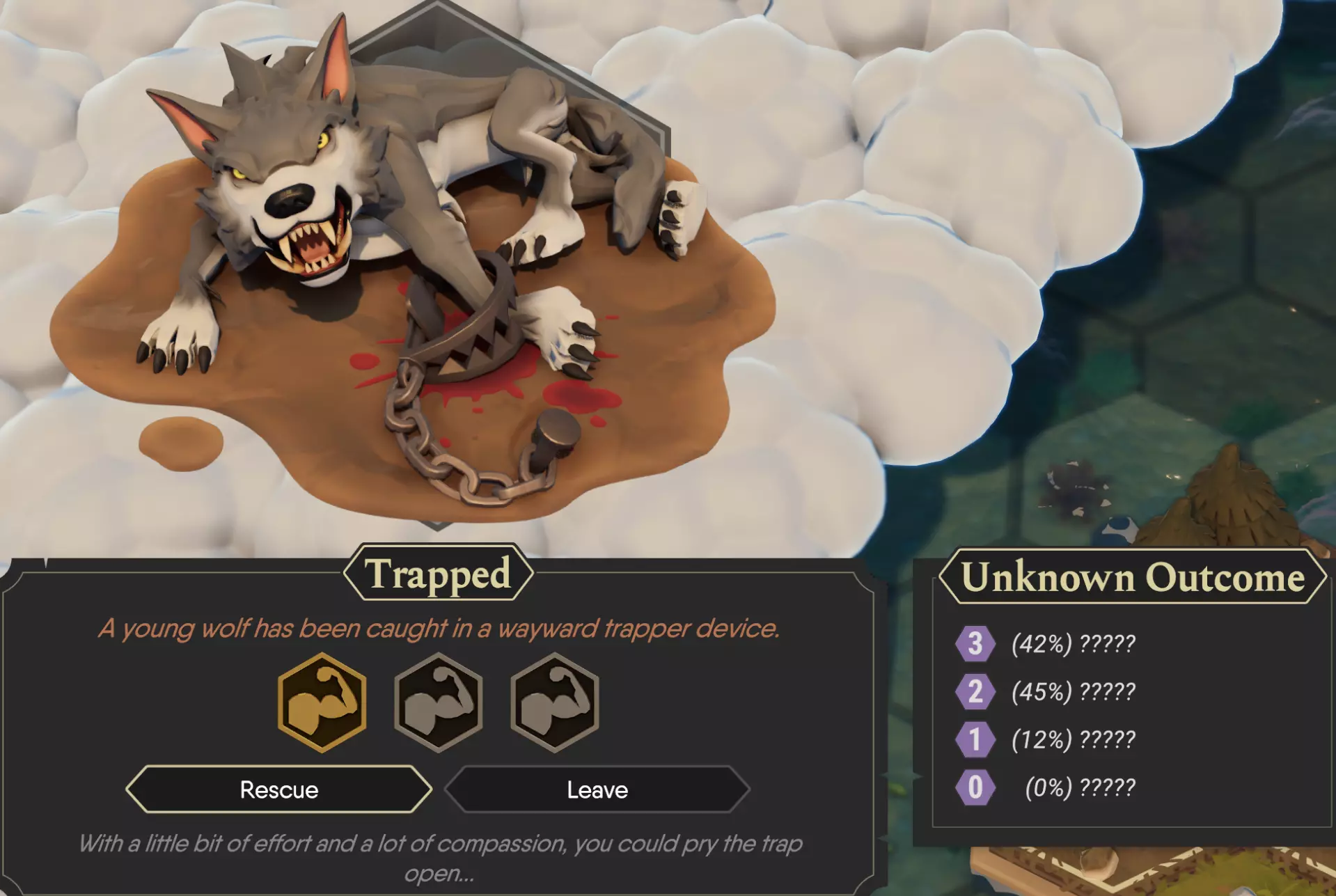 只需用上几次,你就会发现利用专注击败敌人有多么过瘾。但有的时候,当你刚在战斗中用尽了专注点时,可能下一刻你就会遇到一个随机事件。当你发现此时没有专注点可用;当你被迫点下鼠标却发现只差一点点就可以避免糟糕的判定结果,此时也许你又不免懊悔,在刚才的战斗中,或许不该那么毫无节制地用光自己的专注点。 三.随机事件中专注点的使用 游戏中会随时随地产生随机事件,每个随机事件都需要一个对应的属性来进行判定,可能是力量、敏捷、智力或天赋,你的属性高低将决定你判定的成功几率和判定结果。但即便用最不利的属性来判定随机事件也未必会失败,一切皆有可能。只要你舍得花费足够的专注点,就能逆转大失败的局面,确保判定成功。一个手无缚鸡之力的学者,只要肯花费三点专注,也能100%成功救下这匹被捕兽夹困住的森林狼。