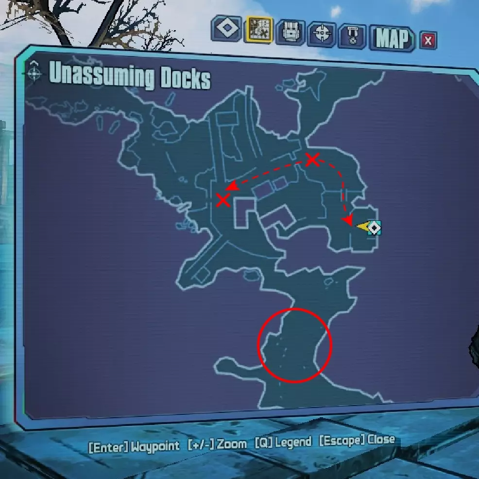 击败稀有生成的骷髅【Chubby Bones】。如果没有偶然遇到它,建议将这个成就留到最后完成,因为你需要刷与特殊技能相关的击杀数。理论上,它会出现在所有有骷髅的地点,我曾在初始地点【Unassuming Docks】(标记处)刷盖奇的特殊技能时连续遇到过两次。同时建议检查用圆圈标出的区域。
