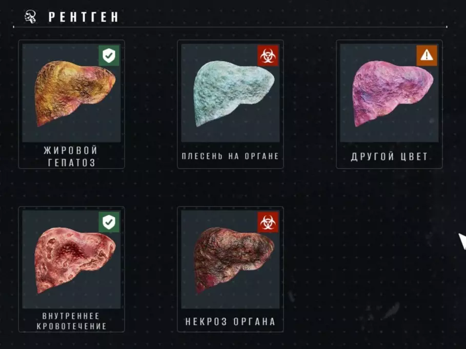 请注意,所有症状也可能出现在仅在其中一种模式下可见的大脑中。 脂肪肝 - 寻找任何带有黄色调的器官(脾脏除外,因为这是其天然颜色;它几乎位于身体中央,靠近/在肺下方,几乎看不见)。 器官上的霉菌 - 寻找器官上略带蓝灰色/青蓝色的色调。 其他颜色 - 寻找器官上相当鲜艳的紫色/粉红色色调。内出血(默认开启)——很难识别,因为出血器官看起来几乎和健康器官一样红。可以通过人的行为来判断(如果他捂着腹部,而你没有看到其他症状——很可能是内出血)。内出血通常不会像现实中那样伴随(红色的)淤青(尽管淤青实际上就是内出血) 器官坏死——寻找器官上的黑色调;它不像皮肤上的坏死那么深,但很明显