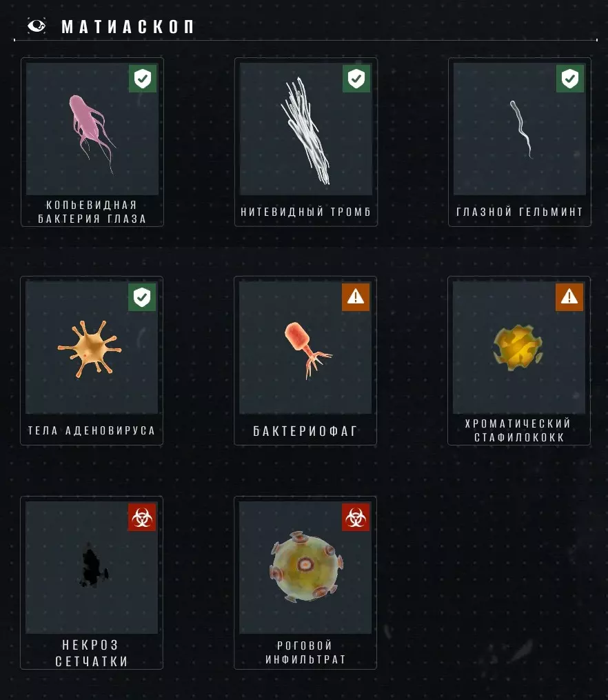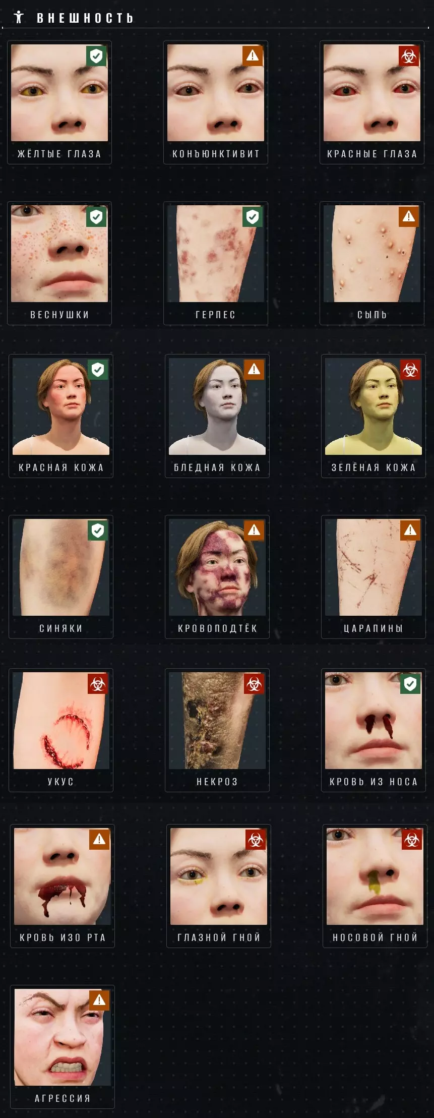 可以使用WASD键移动相机,用鼠标瞄准(只能在中心白色圆圈范围内瞄准)。按住鼠标右键可以放大画面。 提取任何器官后,小游戏都会结束。因此,请确保只按【E】键提取绿色器官,并使用鼠标左键摧毁通往绿色器官路径上的任何黄色/橙色器官。你还可以摧毁最多2个红色器官——这会被算作一次错误,而总共允许出现2次错误(不过说实话,这很容易避免——这个小游戏非常简单)。请注意,你也可以摧毁绿色器官——这不会被算作错误,也不会结束小游戏,但在这种情况下,你将无法解锁新的症状。如果您还是摧毁了绿色器官,只需取出任意其他器官即可退出小游戏。 当您解锁完整的症状链时,将获得50点科学点数。解锁任何新症状可获得25点科学点数(未经验证,因为游戏并未明确显示此信息)。如果您能在30秒内完成小游戏(计时器显示在右上角),还将获得额外10点科学点数——但前提是已发现新症状。 症状列表 以下是游戏中所有症状的列表。其中一些症状在获得相应工具或推进剧情后会立即解锁,其他症状则需要您自行发现。部分症状未列入症状列表中——它们不会影响检查结果,仅用于迷惑玩家(详见相关章节)。部分症状可能出现在身体的不同部位,而非仅如图片所示的手部或面部;还有部分症状的外观与图片中的不符(尤其是【绿色皮肤】)。我还在几处添加了补充内容。可能对您有帮助的评论。 症状列表 注意:症状之间没有任何关联,这与现实生活中的通常情况不同。例如,如果一个人有内出血,他的皮肤上可能没有瘀伤。如果一个人眼睛发黄,他的肝脏可能完全正常(反之亦然)。诸如此类。此外,根据角色的行为可以获得关于人在哪个领域有症状的提示——相关章节会详细说明。外观